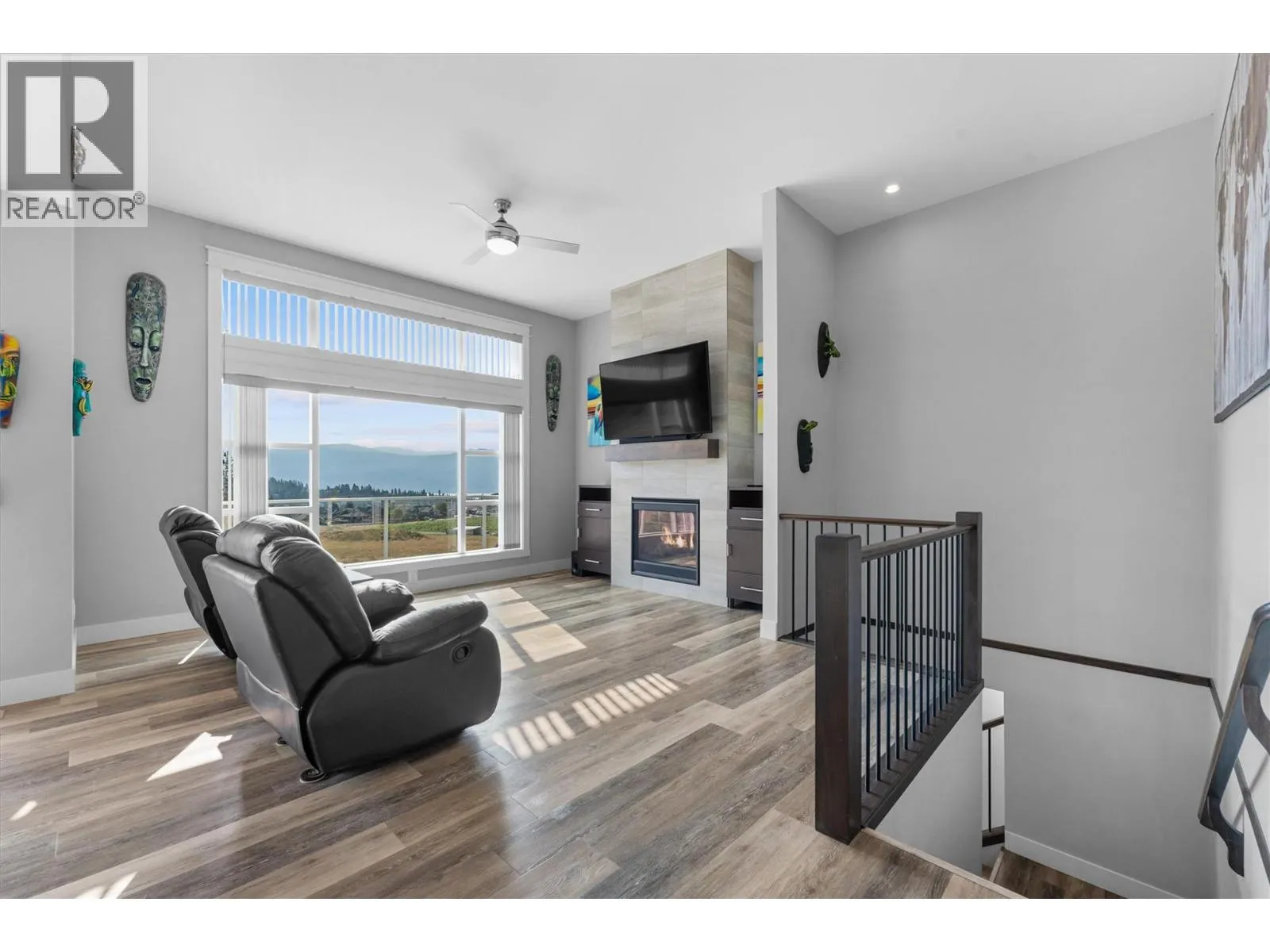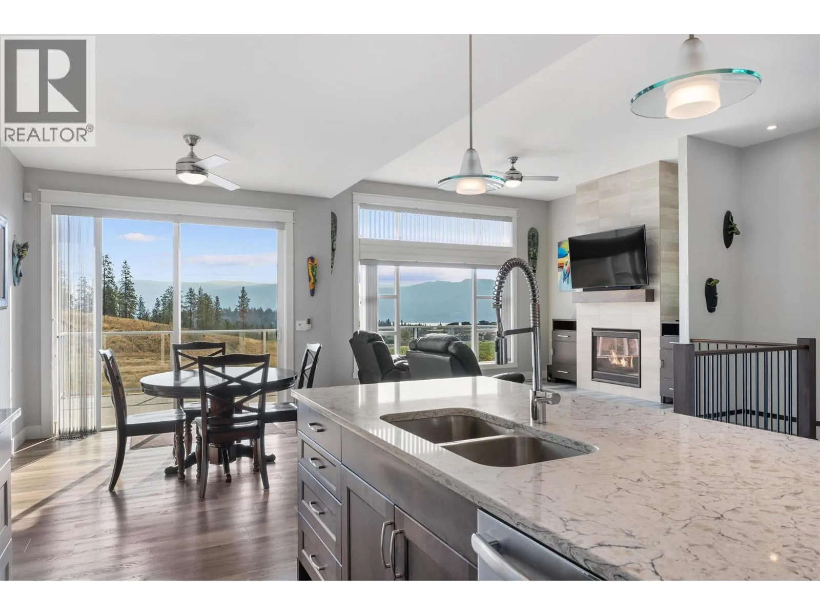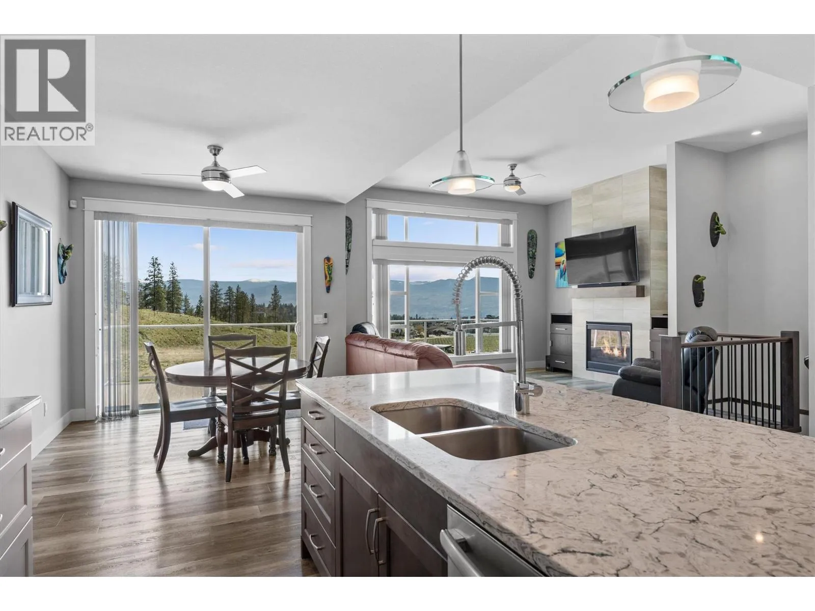 Perched above vineyards in one of West Kelowna’s most desirable neighborhoods, this thoughtfully designed home captures sweeping lake and mountain views. Expansive windows flood the open-concept main level with natural light, where vaulted ceilings and a gas fireplace enhance the warm, spacious feel. The kitchen is built for both function and style, featuring quartz countertops, a large island, gas range,