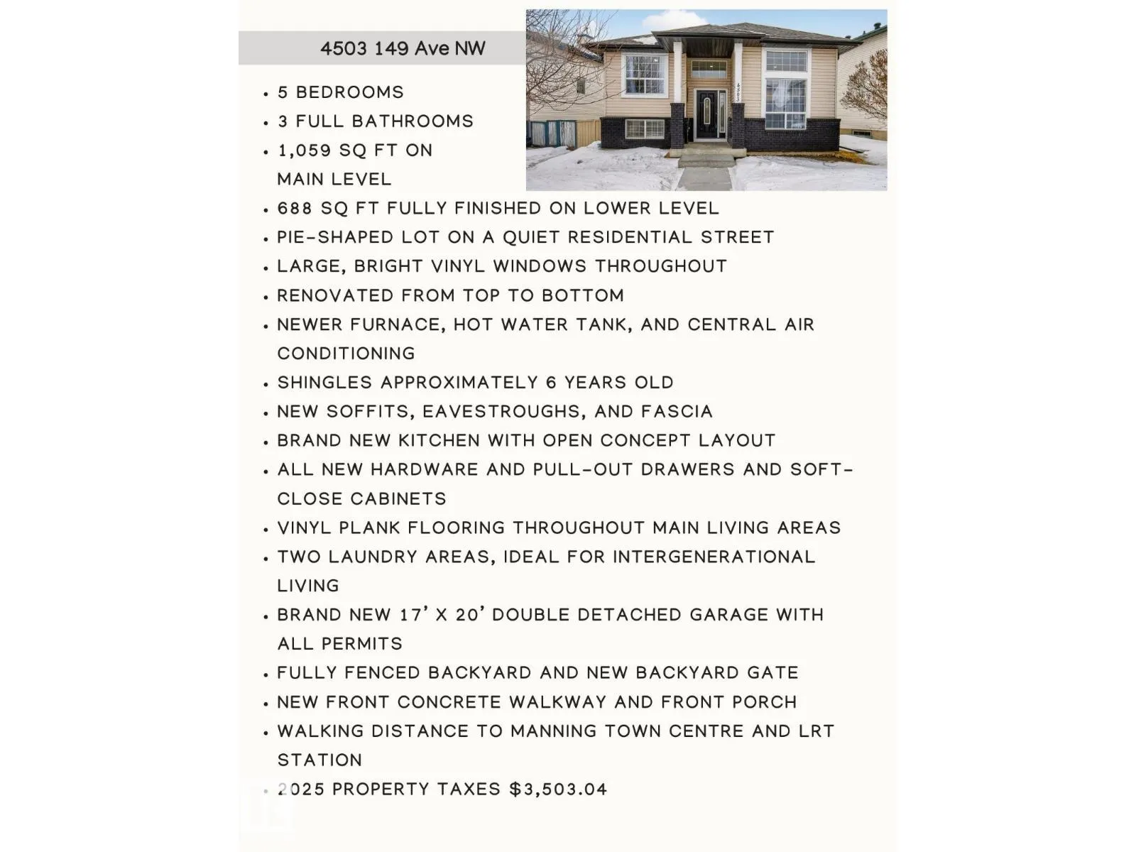 Fully renovated 1747 sq ft bi-level house on a quiet street. 5 bdrms (3 up, 2 down). 3 FULL baths. 1,059 sq ft on main level + 688 sq ft in fully finished lower level. Brand new kitchen, bathrooms, quartz countertops, SS appliances, vinyl plank flooring, hardware & mirrors. All new light fixtures on dimmers. Bright kitchen w/dining area, eat-up