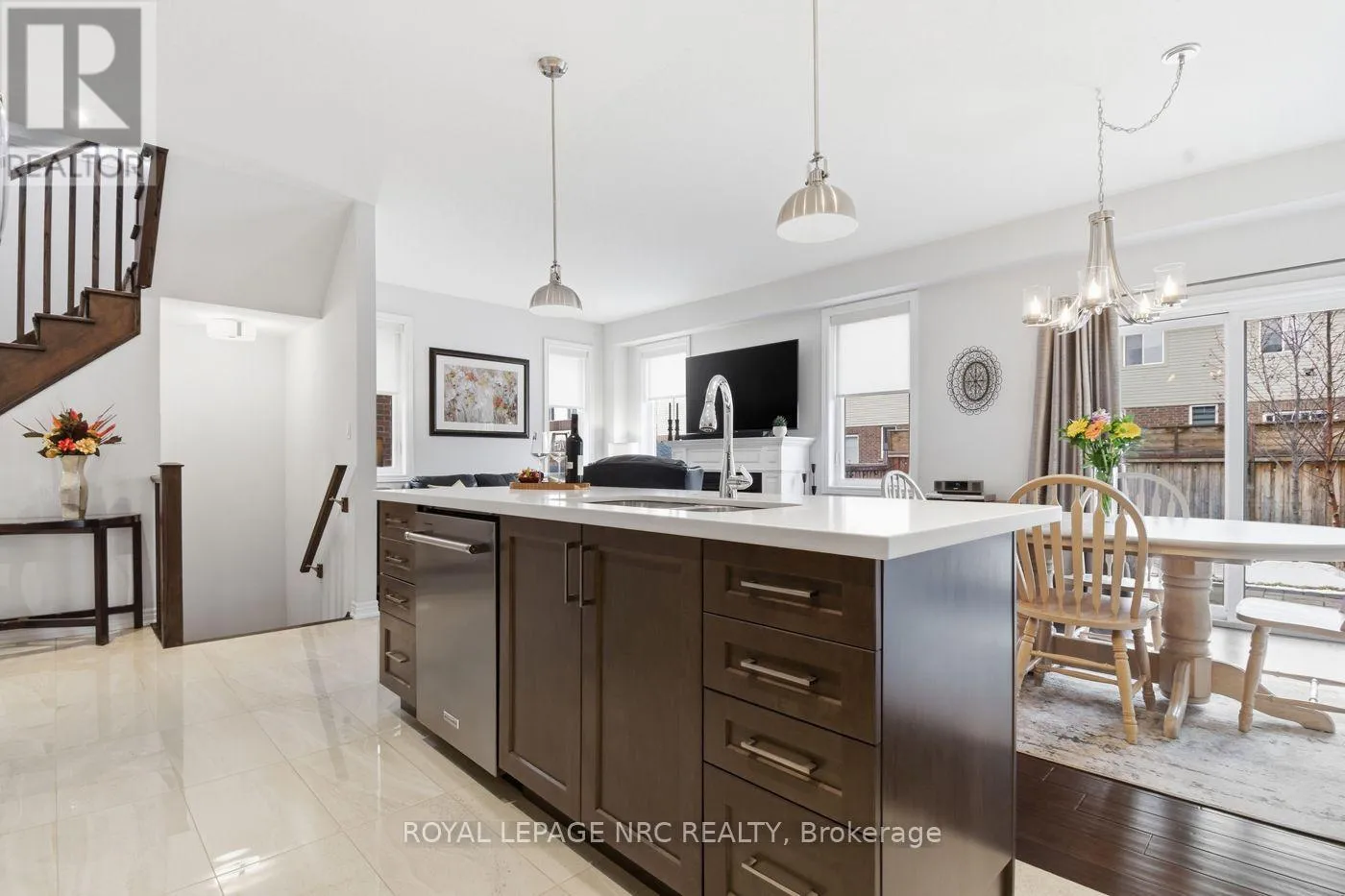 I am pleased to present this stylish, freehold executive two-storey townhouse located in the “Foothills of Winona”. Built in 2019 by DiCenzo Homes, this property offers high-quality finishes and a thoughtful design throughout.The exterior features significant curb appeal with an exposed aggregate double driveway and a stone pathway leading to a covered entrance. Inside, the foyer is finished with polished