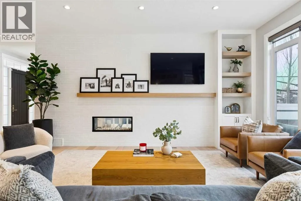 curved-ceiling office complete with custom built-ins and a striking two-sided fireplace, a space that works equally well for focused work or relaxed conversation. From there, the main living area opens with 10-foot ceilings and expansive west-facing windows that flood the home with natural light. A full brick feature wall with oak mantle and built-ins anchors the family room, seamlessly connected to a chef’s kitchen outfitted with JennAir appliances, custom cabinetry, and generous prep space. The dining area opens directly onto the composite deck and west backyard, ideal for evening sun and family gatherings.A thoughtfully designed walk-through pantry connects the kitchen to a well-appointed mudroom with custom storage, leading to the oversized, fully finished triple garage with epoxy floors.Upstairs, soaring ceilings and skylights continue the sense of openness. The primary retreat is expansive, featuring vaulted ceilings, large west-facing windows, and an additional double-sided gas fireplace that adds warmth and character. A private lounge area with built-in bar creates separation within the suite, offering both scale and privacy. The spa-like ensuite includes heated floors, a freestanding soaker tub, and a beautifully designed oversized shower that feels more like a private retreat than a typical bathroom. The generous walk-in closet offers extensive custom storage and connects directly to the laundry room for everyday convenience.Three additional bedrooms complete the upper level – one with its own ensuite, and two sharing a well-designed bath with double sinks and a separate water closet, ideal for busy mornings.The lower level continues the thoughtful design with 9-foot ceilings and heated hardwood floors throughout. A spacious rec room, dedicated gym, and fully equipped second kitchen make this level ideal for entertaining or everyday flexibility. Just off the kitchen is a dedicated wine and storage room, adding both function and character. A fifth bedroom and full bath complete the space.Many of the home’s key spaces – including the kitchen, living area, primary ensuite, fireplaces, powder room, and garage – were tastefully updated in 2022, blending timeless design with enduring quality. (id:64429)