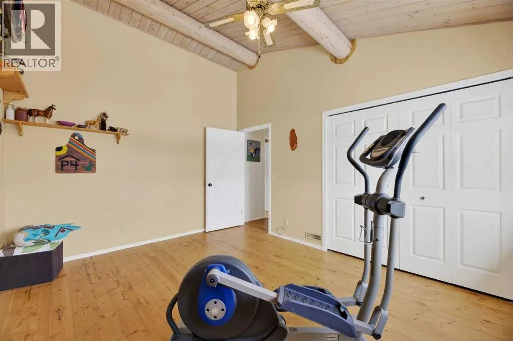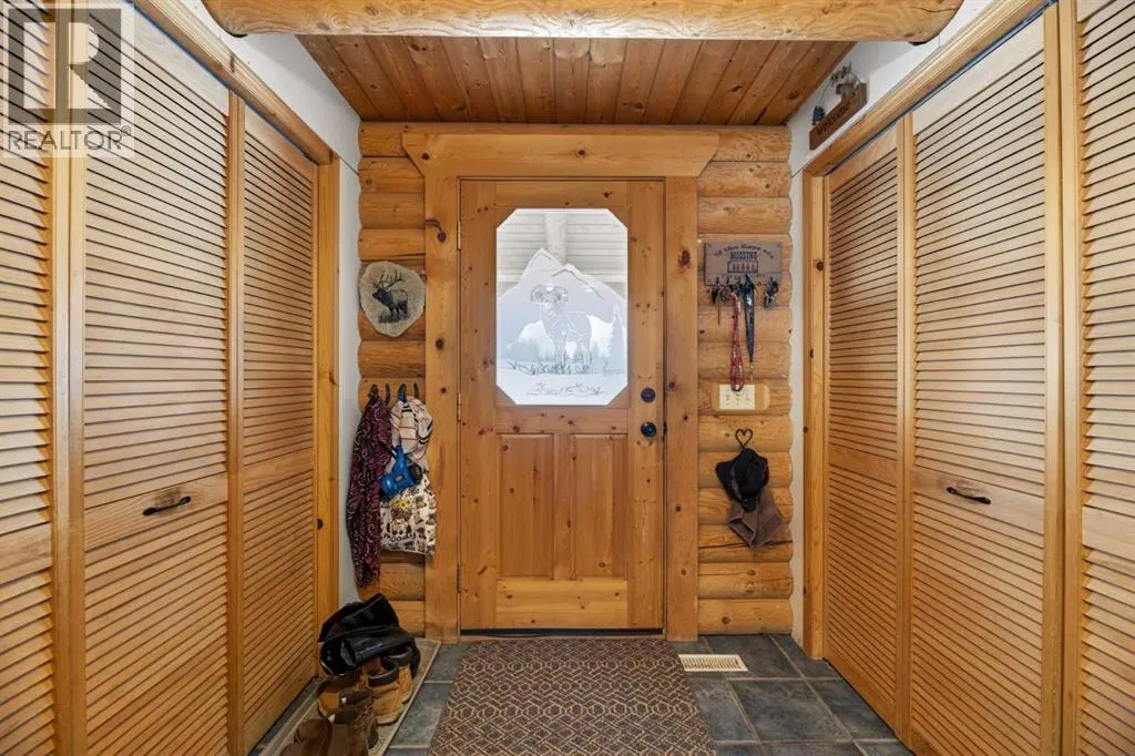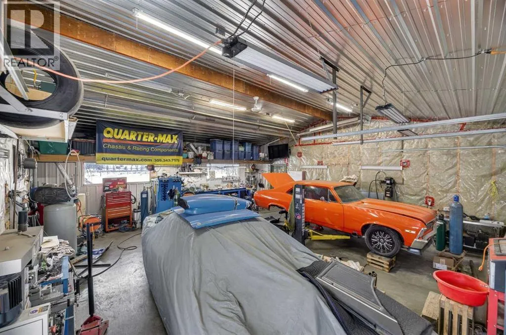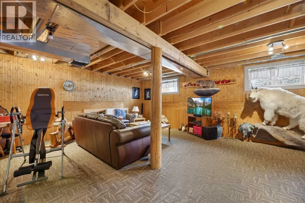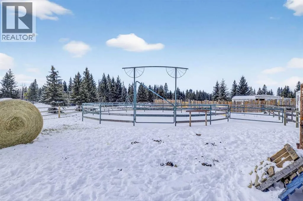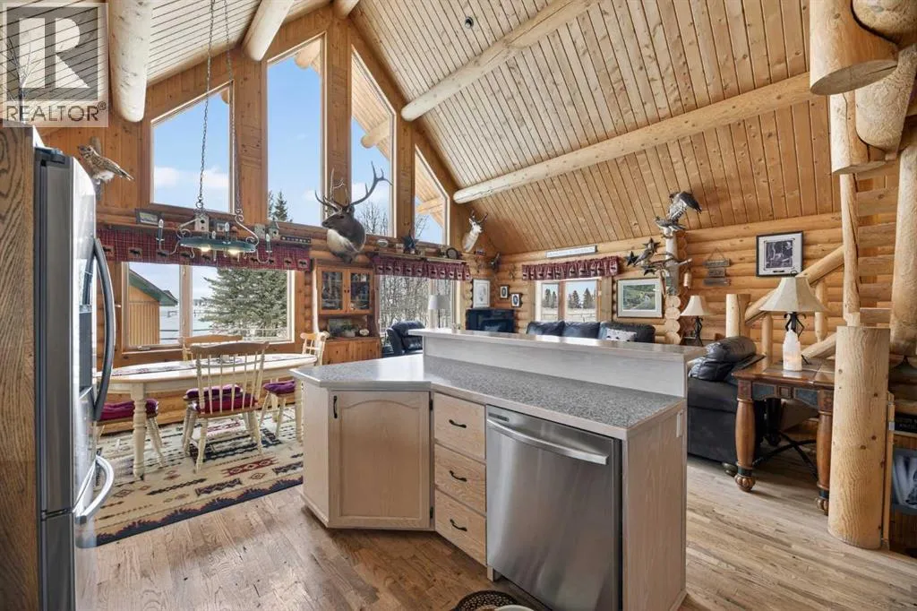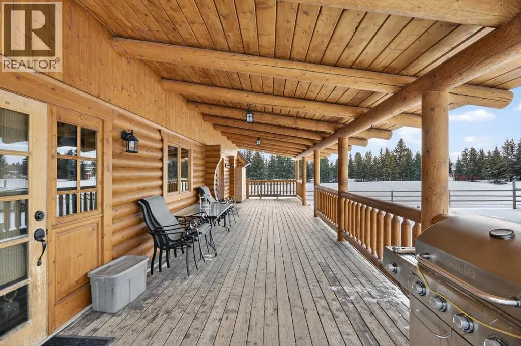 on the main floor, with plenty of room for your full bedroom set, a generous walk-in closet, & easy access to the main floor laundry closet. After a long day on the range, retreat to the dreamy 4-piece bath featuring a classic clawfoot tub—perfect for soaking under candlelight while the prairie wind whispers outside. The open-concept main floor is built for gathering. Large windows on all sides pour in natural light, illuminating the beautifully maintained log beams overhead. The well-laid-out kitchen boasts abundant cupboard space & a grand island with seating—a place for cowpokes to pull up a chair, share a hearty meal, & swap stories of the day’s adventures. Upstairs, two more spacious bedrooms stand ready for family or guests, separated by a charming 3-piece bath complete with a deep soaker tub to wash away the dust of the trail. Down below, the fully developed basement is made for memory-making. A large family room offers space for a games area & movie nights alike. Two additional bedrooms—one currently serving as a fine home office—provide flexibility for growing families or visiting ranch hands. A full 3-piece bathroom on this level ensures comfort & convenience without having to head upstairs. When summer evenings roll in, the enormous covered front deck becomes your front-row seat to prairie sunsets blazing in the western sky. Watch your stock roam & play, or stroll over to the sheltered firepit area just steps from the home—perfect for roaring fires, laughter, & s’mores under the stars. And for your rigs and equipment? An oversized, finished, triple detached garage awaits—heated with radiant heat. Two bays are fully finis hed, while the single bay offers cold storage for all your gear. And to finish it all off. A well set up Tack shed for all your gear. Set up, move-in ready, & just minutes to town for all amenities, this must-see property is the kind folks write songs about. You won’t believe your eyes. “Home Is Where Your Story Begins!” (id:64429)