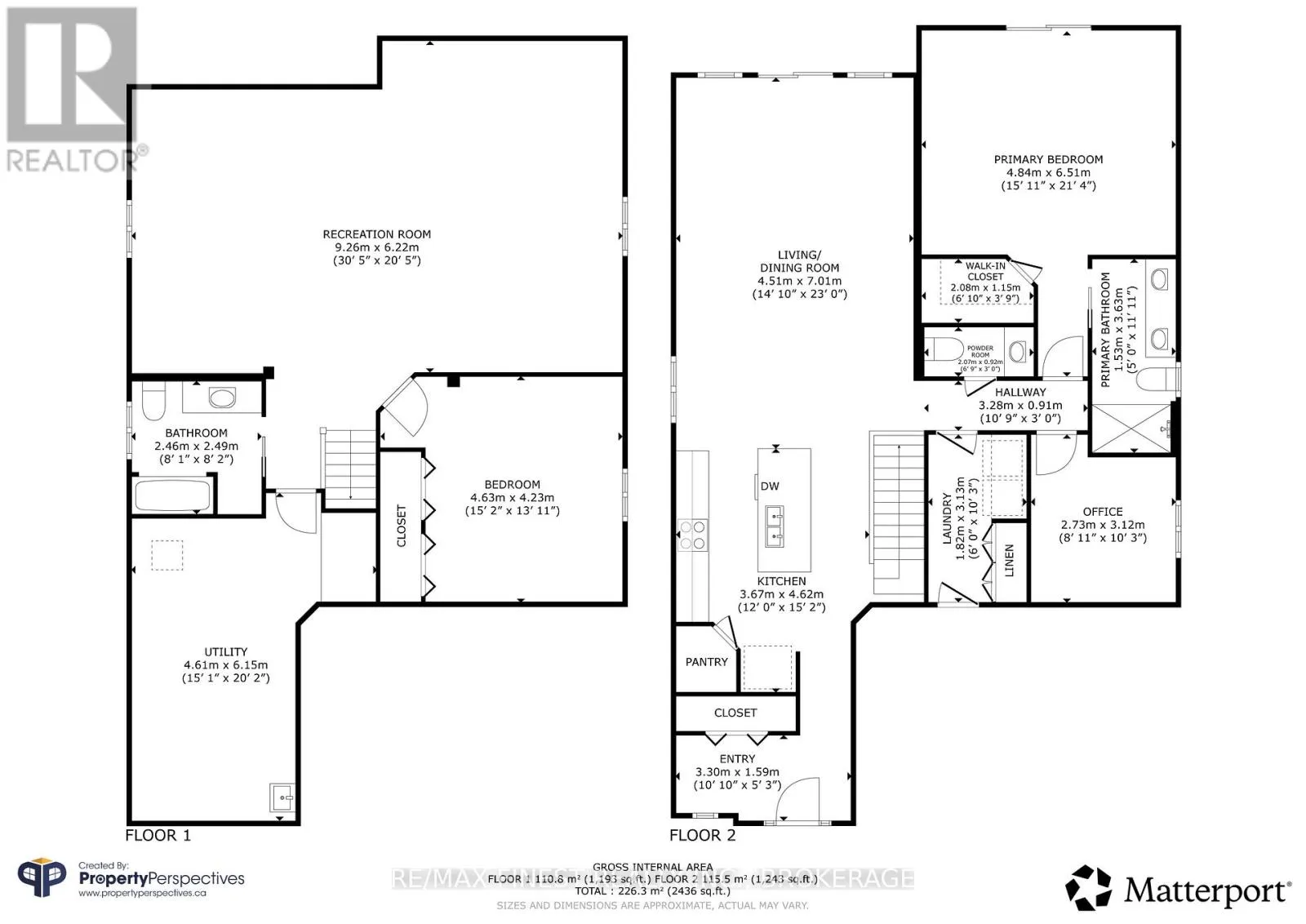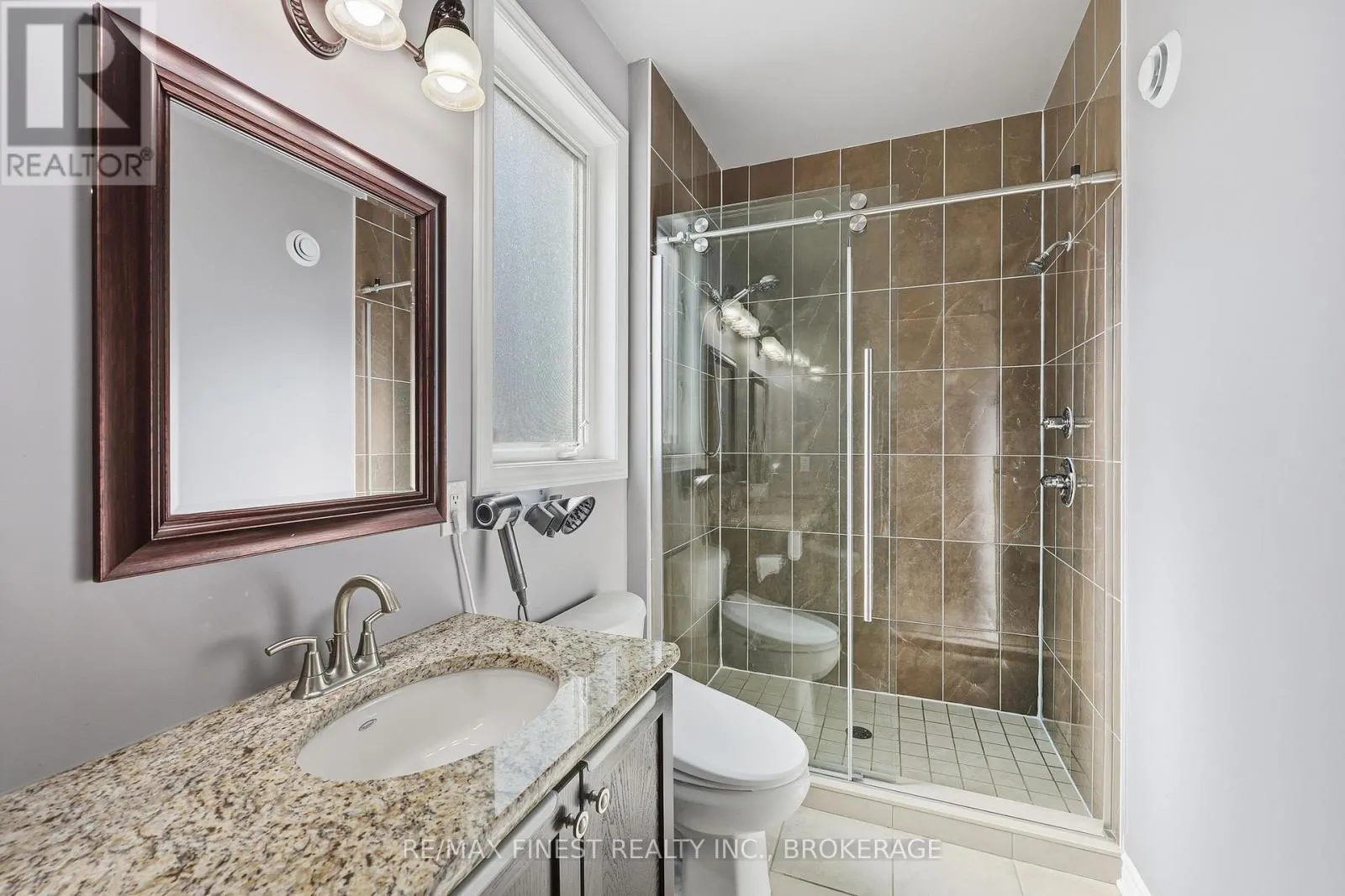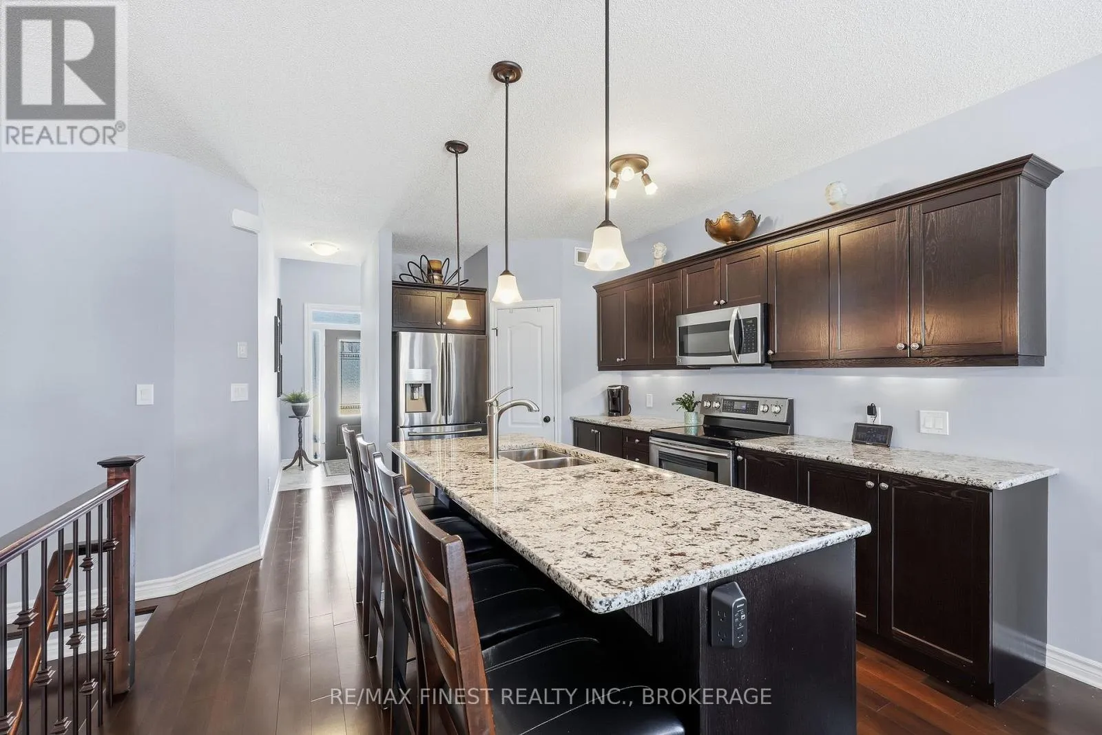 This custom built home pays particular attention to detail with high end finishes throughout. The large entry flows seamlessly through to the open concept living areas with gleaming hardwood floors, 9′ ceilings, a large kitchen with granite countertops and centre island that seats 4comfortably. Continue through the dining area to the living room with large patio doors and California shutters.