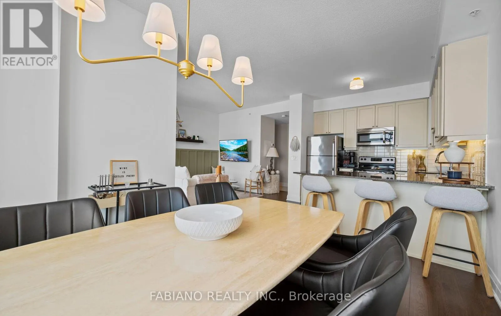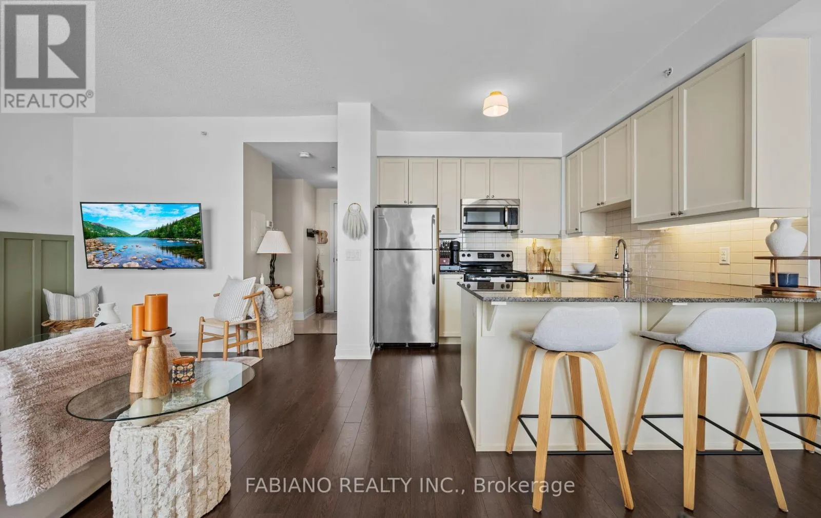 Welcome to Allegra Condos, ideally situated in the heart of Woodbridge. This beautifully maintained 1 + 1 bedroom, 2 bathroom suite offers over 800 square feet of functional living space with a practical open-concept layout and 9-foot ceilings. The kitchen features granite countertops, stainless steel appliances, under-cabinet lighting, and ample cabinetry. The living and dining area features laminate and a