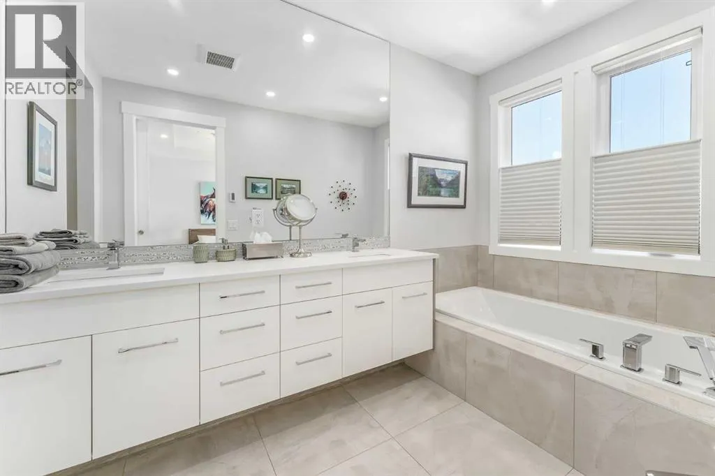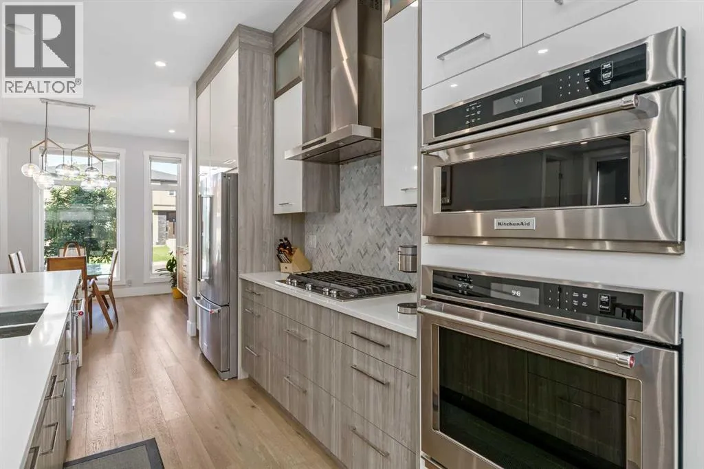 precise millwork, and a floor plan that moves effortlessly from everyday living to elegant entertaining. At the front, a formal dining room sets the tone, three large picture windows, a statement light fixture and room for those long, lively dinners. The heart of the home is an oversized chef’s kitchen that’s both beautiful and hard-working: white and warm wood-grain cabinetry to the bulkhead, gleaming waterfall quartz counters, built-in wall oven, a gas cooktop beneath a sleek stand-alone hood fan, and a Carrara marble herringbone backsplash that wraps the hood for a bespoke, designer finish. The generous island invites coffee catch-ups and weekend prep, while the full upgraded stainless appliance package delivers performance worthy of the space. Anchored by a tiled gas fireplace with custom open shelving, the living room is scaled for comfort and conversation. It flows naturally to the backyard for easy summer living, with over $40k in low maintenance landscaping with concrete walkways, a large patio, and BBQ gas hookup so hosting is as simple as turning a knob. Upstairs, the private retreat continues the theme of understated luxury. The primary suite features a tray ceiling, upgraded blinds, and a walk-in closet fit with custom built-ins. The spa-calibre 5-piece ensuite pampers with a freestanding soaker tub, an oversized glass shower, 24″×24″ tile, in-floor heat, and a steam rough-in already planned into the layout. Two additional bedroom suites are thoughtfully finished—each with true walk-in closets and custom storage (one with a stylish wallpaper feature wall). A proper laundry room, complete with cabinetry, folding counter, and sink—keeps the day-to-day running smoothly. The fully finished basement is made for movie nights and game days. A large rec/media area includes a custom wet bar with sink, wood-grain and white cabinetry, marble tile backsplash, and a wine fridge,an entertainer’s ally. Berber carpet adds warmth underfoot, while in-floor heating keeps the entire level comfortable year-round. A sleek 3-piece bathroom with a floating vanity serves guests with style. And because true quality goes beyond finishes, this level was engineered with approximately six inches of insulation beneath the slab for superior efficiency and comfort. Set on a quiet inner-city street in the heart of Killarney—close to parks, schools, transit, and the best of local cafés and amenities—this home delivers the rare combination of design, durability, and day-to-day livability. If you value details you can feel as much as finishes you can see, you’ll know…this is the one. (id:62650)