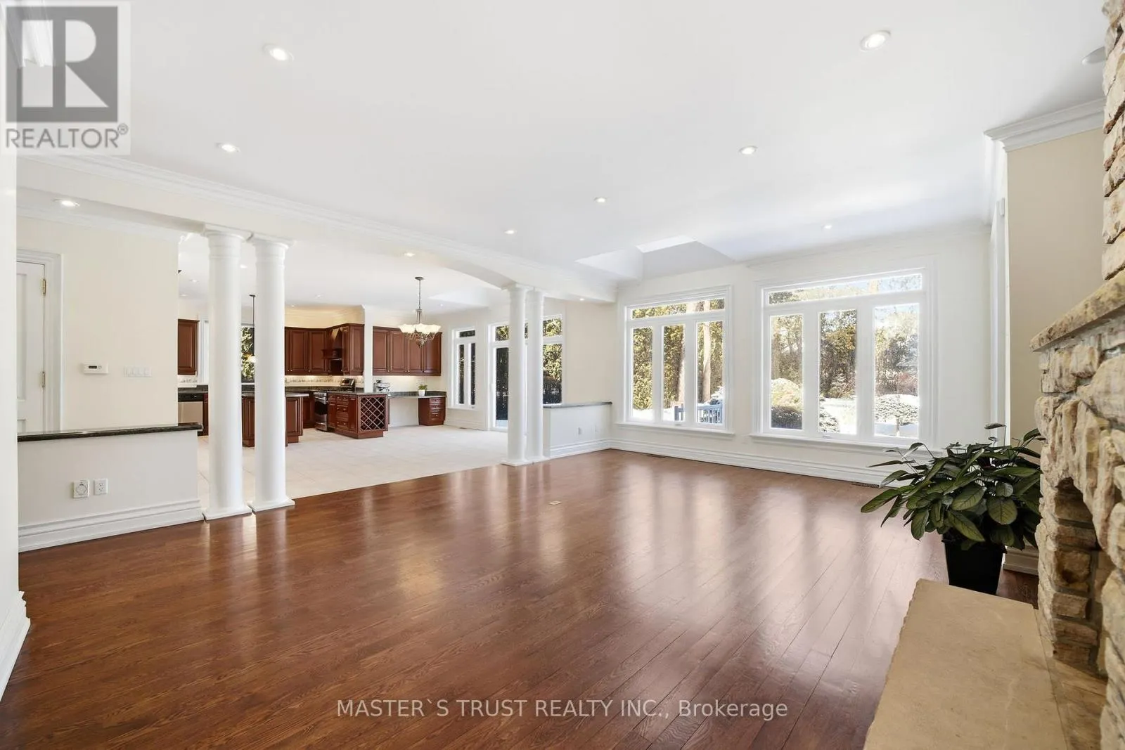 Exceptional opportunity to lease a grand stone residence on a rare 88′ x 268′ private lot in one of Thornhill’s most distinguished neighbourhoods. Offering approximately 6,413 sq ft above grade plus a fully finished 3,000 sq ft lower level, this impressive home delivers scale, privacy, and refined comfort ideal for executive living.Grand principal rooms with 9+ ft ceilings, hardwood floors,