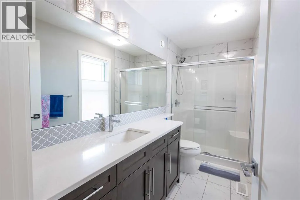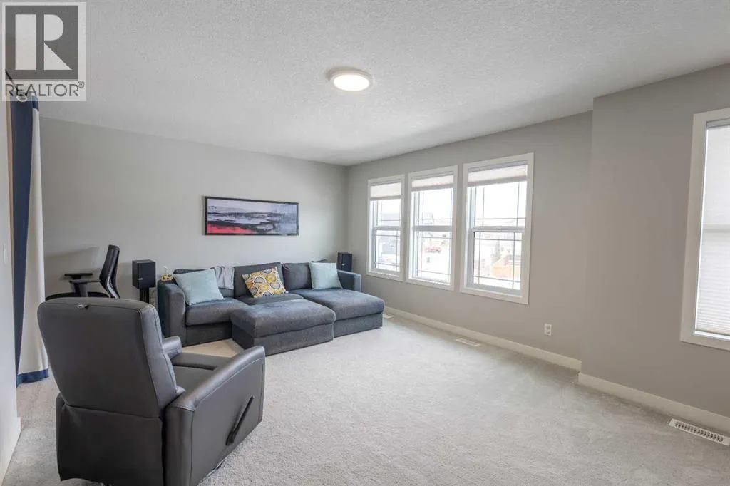 front of the home. Large windows invite in natural light, complemented throughout the home by Hunter Douglas blinds that add both style and privacy. This property is thoughtfully upgraded with built in speakers, a high-efficiency furnace, upgraded hot water tank, water softener, and a built-in irrigation system. Gemstone exterior lighting enhances curb appeal and provides customizable, year-round ambiance for every occasion. At the heart of the home is a stunning chef-inspired kitchen. Quartz countertops, ceiling-height cabinetry, and sleek stainless steel appliances create a sophisticated yet highly functional space. The gas range stove is perfect for culinary enthusiasts, while the large central island with breakfast bar seating offers plenty of room for casual meals, entertaining, or gathering with family and friends. A convenient butlers pantry connecting to the walk-through pantry provides abundant storage and seamless access. Adjacent to the kitchen, the bright eating nook offers a welcoming space for everyday dining and opens directly onto the back deck—perfect for indoor-outdoor living. The kitchen flows seamlessly into the spacious living room, where a beautiful gas fireplace with stone surround serves as a cozy focal point. This open-concept layout connects the living room, dining spaces, and kitchen, creating an ideal environment for both entertaining and everyday life. Step outside to enjoy the spacious backyard—an inviting retreat with plenty of room for children, pets and gardening. Completing this main level is a 2pc powder room. Upstairs, you’ll find a thoughtfully designed upper level featuring a convenient laundry room and a skylight that fills the space with natural light. The large primary bedroom is a true sanctuary, offering stunning views of downtown. The luxurious 5-piece ensuite includes a dual vanity, soaking tub, stand-alone shower, and a generous walk-in closet. Two additional well-sized bedrooms share a modern 3-piece bathroom, making this level perfect for families or guests. A spacious bonus room with large windows provides flexible living space—ideal for a media room, playroom, or home office. The full, unfinished basement features 9 foot ceilings and endless possibilities. With large, bright windows and walk-out access to a lower-level patio, this space is ready to be customized to suit your individual needs—whether you envision a home gym, recreation area, additional bedrooms, or a secondary living space. This home offers the perfect balance of style, comfort, and future potential—all in a thoughtfully designed layout that truly has it all. (id:62650)