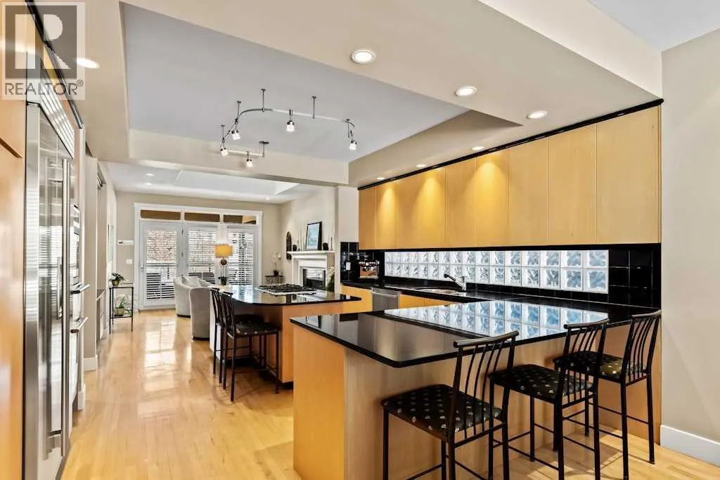 From the front veranda, step inside to a space defined by quiet sophistication, clean contemporary lines, warm maple hardwood, and an abundance of natural light filtering through expansive windows. From the front entry, the home opens into the living room where a wood-burning fireplace creates a striking focal point, complemented by upgraded built-in speakers and a cleverly concealed “peek-a-boo” TV