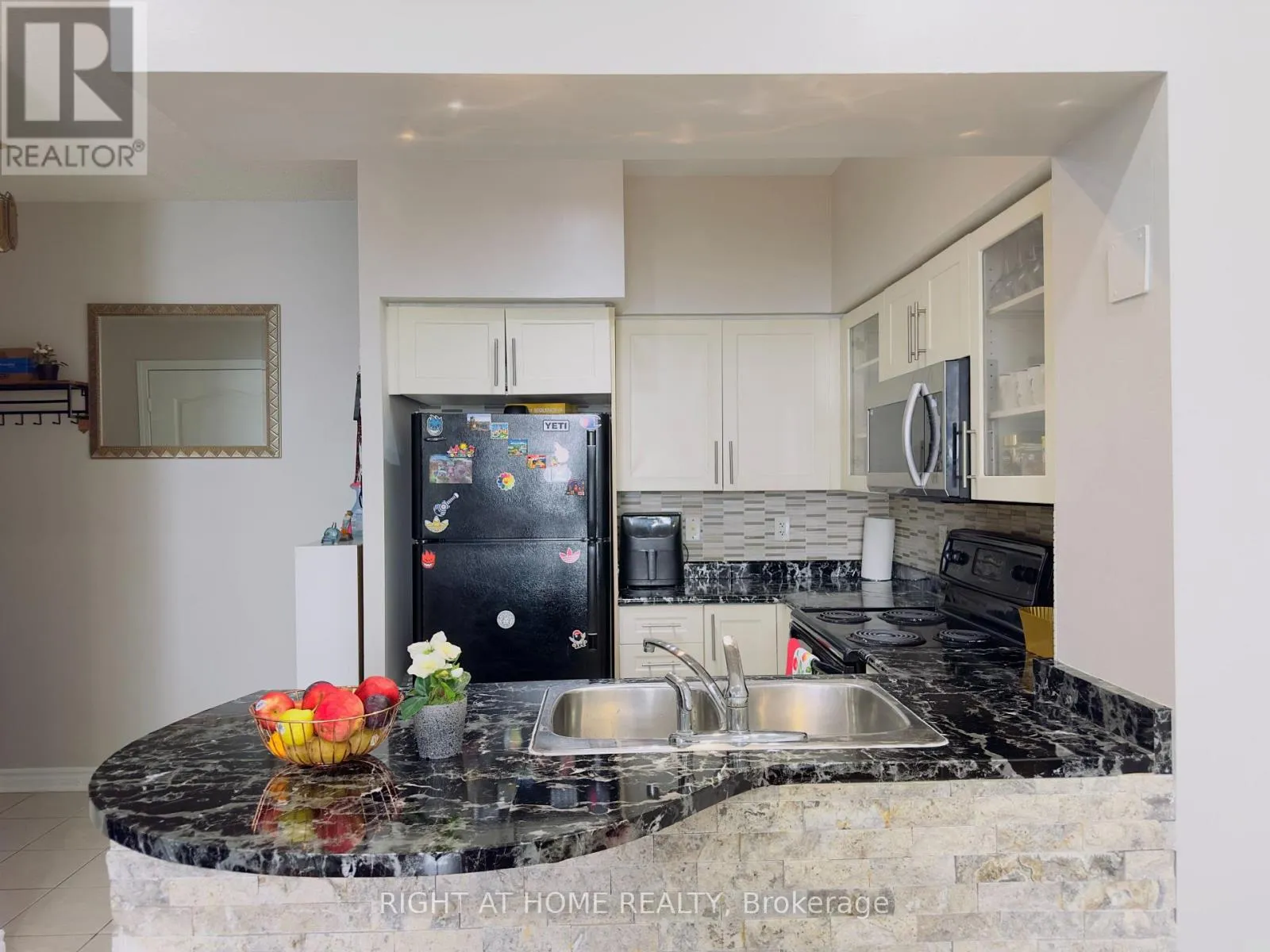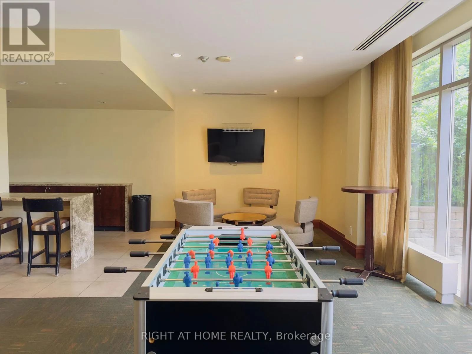 Discover the perfect blend of comfort and style in this stunning 1 Bedroom + Den condo with soaring 9-foot ceilings with pot lights. The open-concept layout features a bright and spacious living room complete with a custom stone accent wall and a cozy fireplace ideal for relaxing evenings. The modern kitchen boasts sleek finishes and a custom stone breakfast bar,