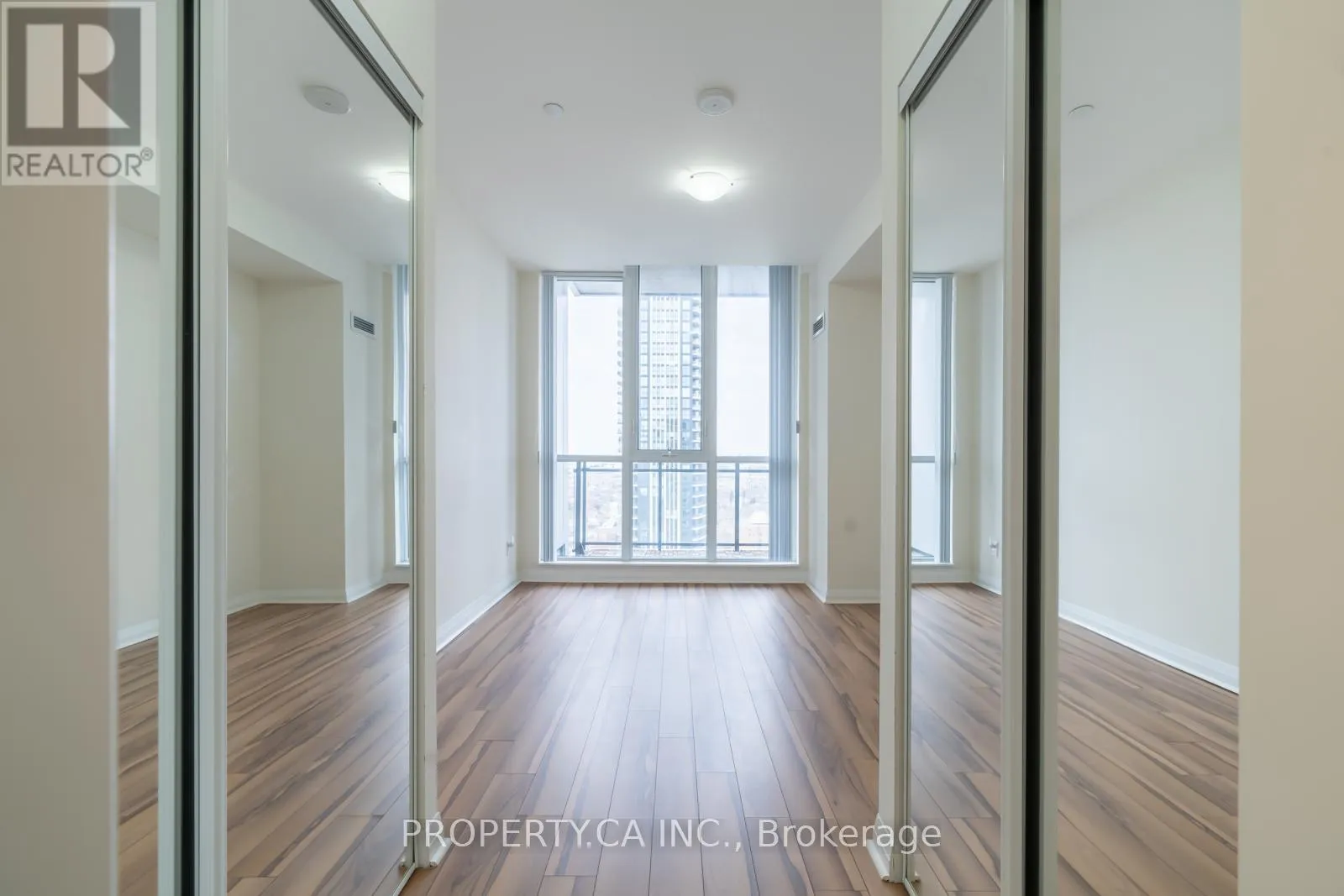 Modern open-concept 1+Den suite featuring 9′ ceilings and floor-to-ceiling windows in both the living room and bedroom, filling the space with natural light. The contemporary kitchen boasts sleek cabinetry with integrated handles and quartz countertops. Spacious primary bedroom includes his-and-hers mirrored closets with semi-ensuite access to a beautifully finished bathroom with quartz counters. The full-size den offers a versatile bonus