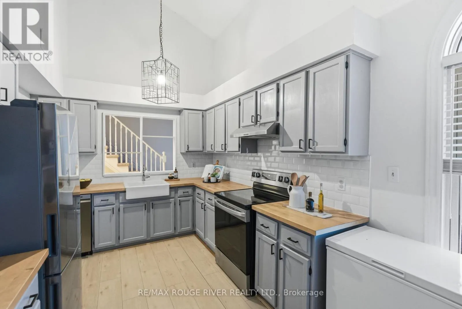 Welcome to this bright and updated end-unit stacked condo townhome in the desirable Parkwood Village community. Enjoy seamless laminate flooring throughout the unit, along with newly installed blinds in the main floor kitchen and living area. The main level features a spacious, modern eat-in kitchen complete with stainless steel appliances, extensive cabinetry, butcher block countertops and a farmhouse sink. The