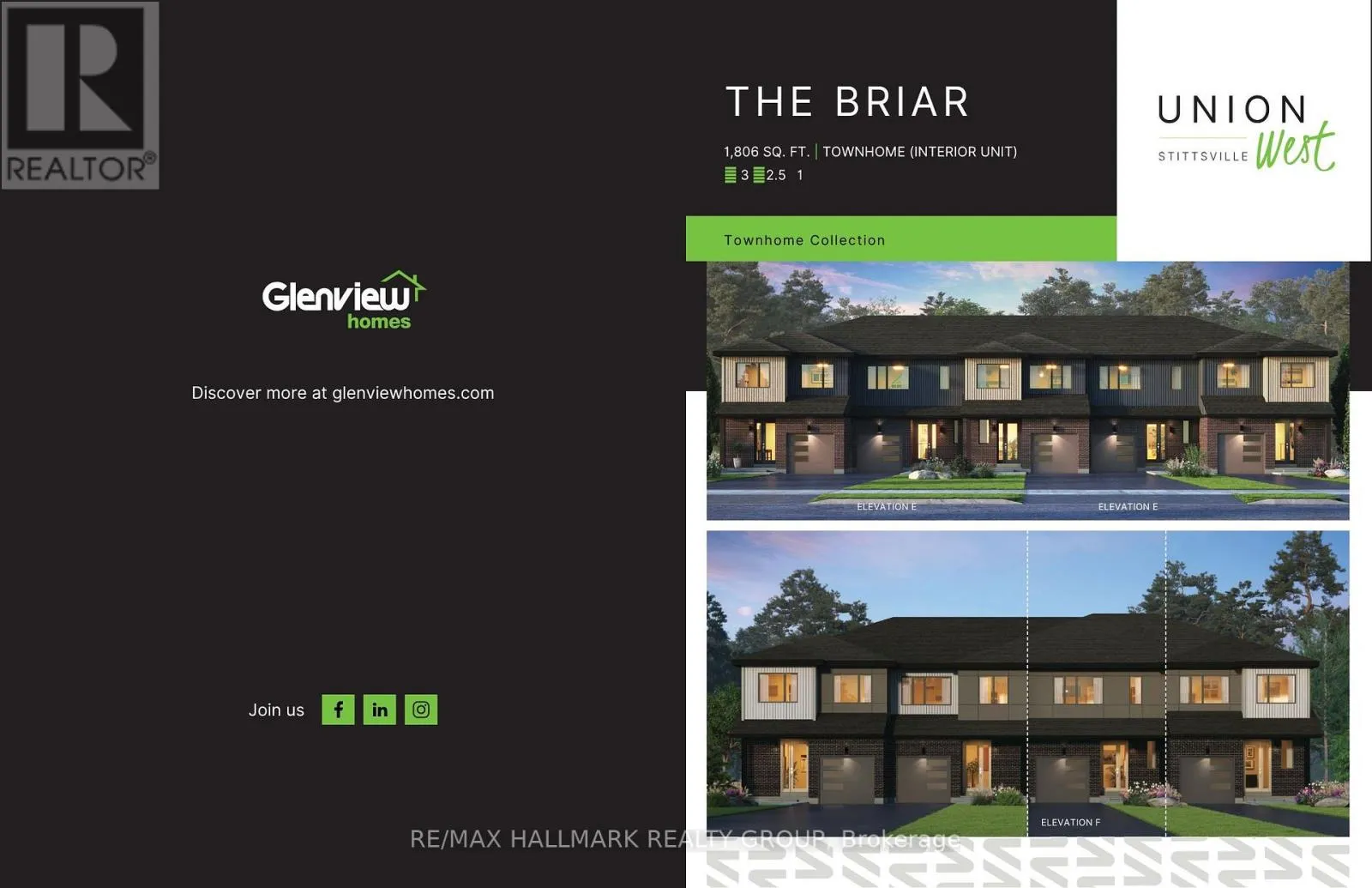 Welcome to Union West – A Move in the Right Direction! Discover the Briar (E) model by Glenview Homes, offering 1,806 sq ft of thoughtfully designed living space, including a 232 sq ft finished basement. This stunning townhome perfectly blends modern style with everyday functionality. Step into the open-concept main floor, elevated by 9-foot smooth ceilings and 7-1/2″ wood composite