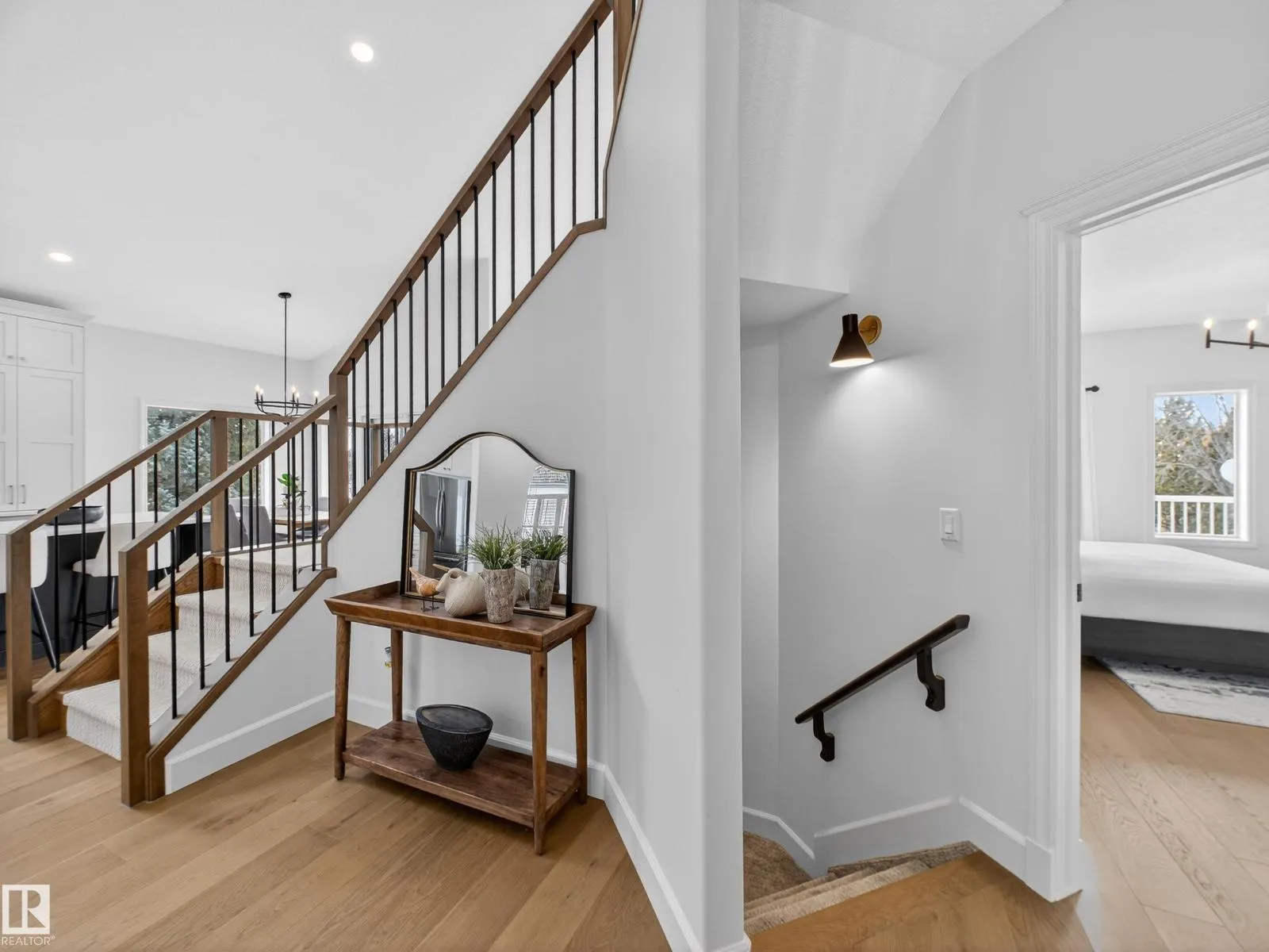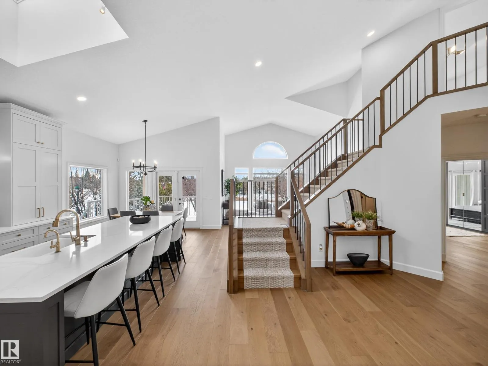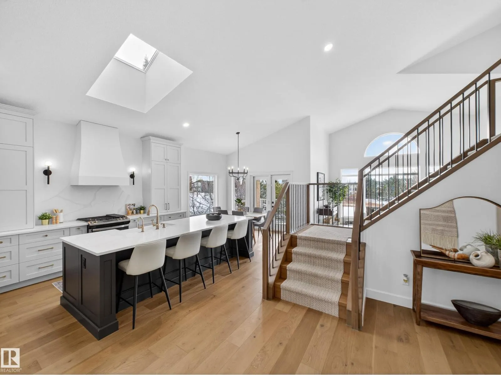 HADDOW, EXTENSIVELY RENOVATED by Habitat Studios – tucked into a quiet cul-de-sac, backing southwest onto a private green space. This rare walk-out offers mainfloor and loft primary suites. The home features vaulted ceilings, skylights, engineered hardwood, central vac, AC, and HIGH END finishes throughout. The custom kitchen includes quartz counters, a large walk-in pantry, coffee station with appliance garage, under-lit