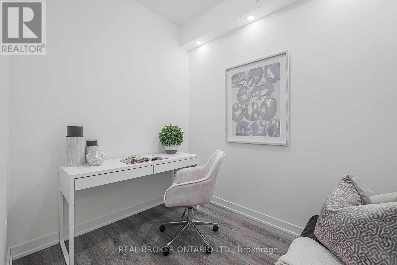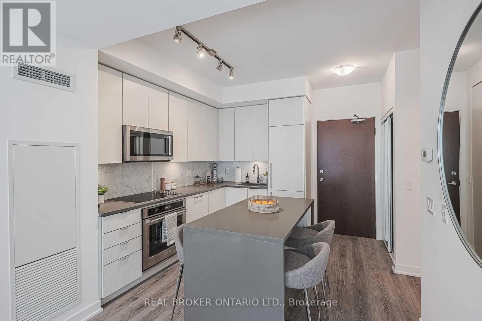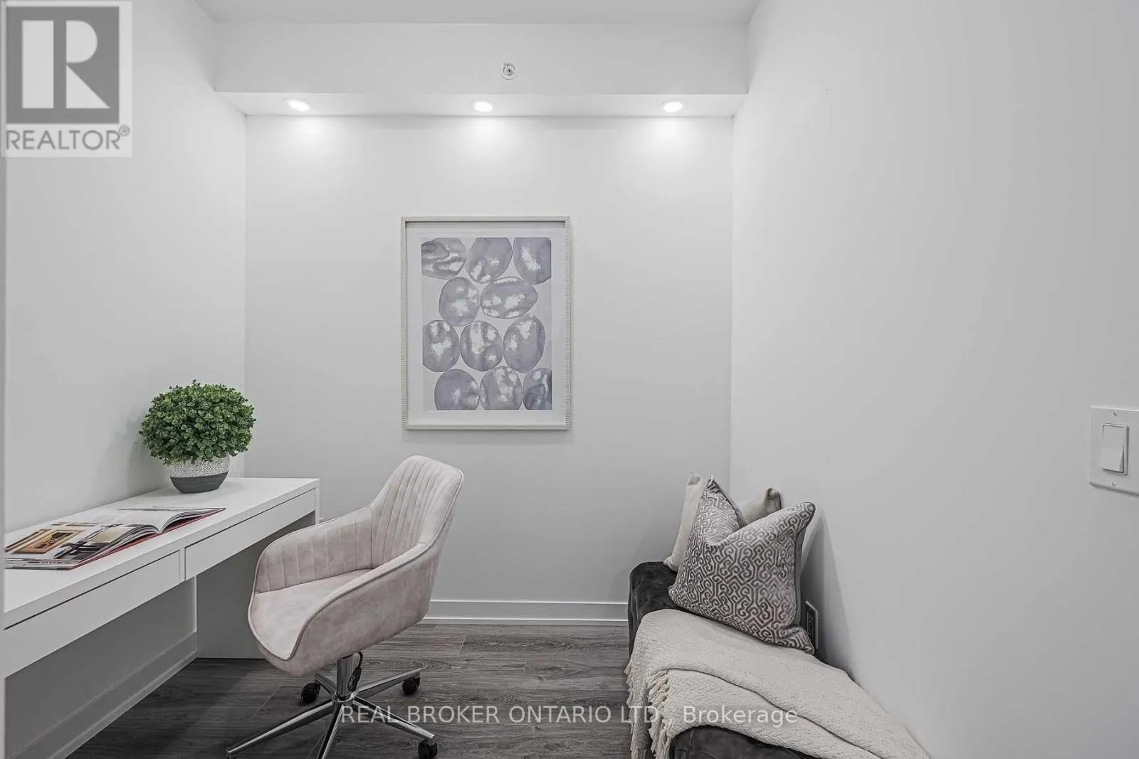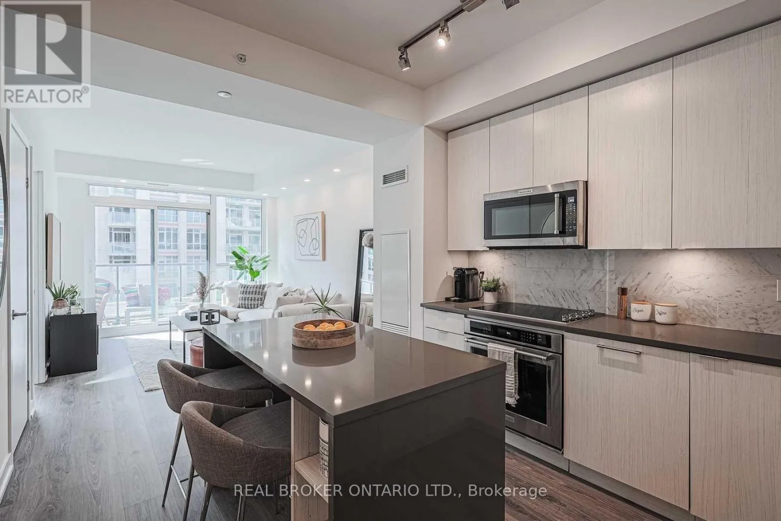 Perfectly-sized 585 sf south facing 1+1 unit w/ parking. Enjoy a book under the sun on the balcony during the day or under the upgraded potlights throughout the space in the evening. Kitchen features built-in appliances, stone countertops and a thoughtfully designed island that has storage and seats 4. The den is ideal for a work from home space or