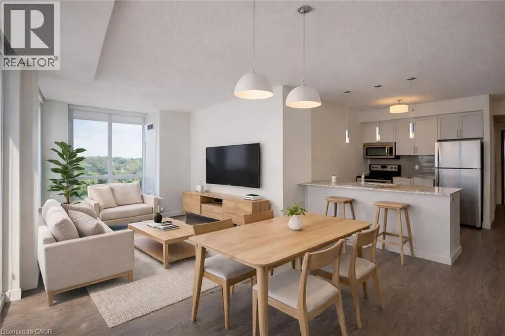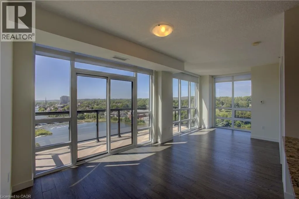 Condo living with the BEST VIEW! At its finest this pristine corner unit in the heart of historic Downtown Galt, offering uninterrupted views of the scenic Grand River. Rarely offered, this suite includes another 140 sq.ft. of private outdoor DOUBLE LENGTH balcony space—ideal for enjoying both sunrises and sunsets over the water and downtown skyline. The open-concept layout allows natural