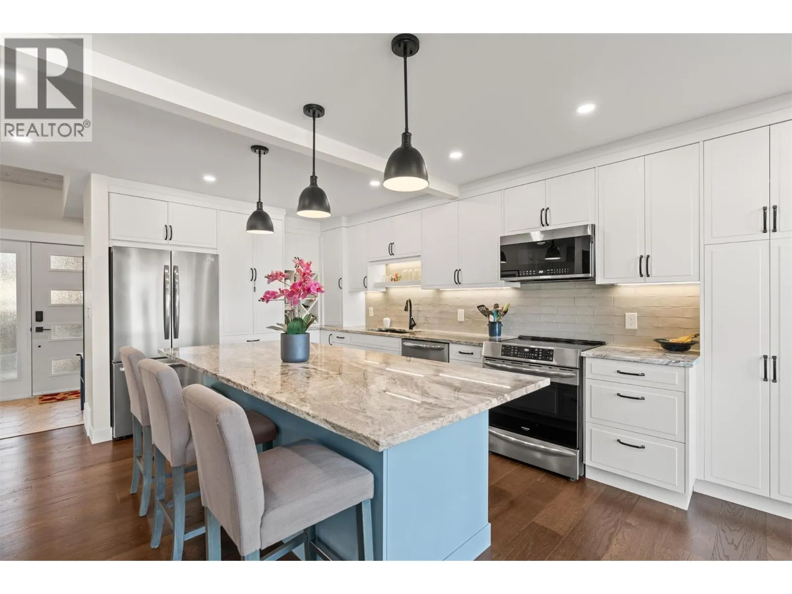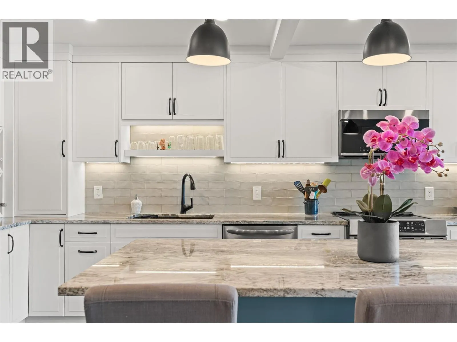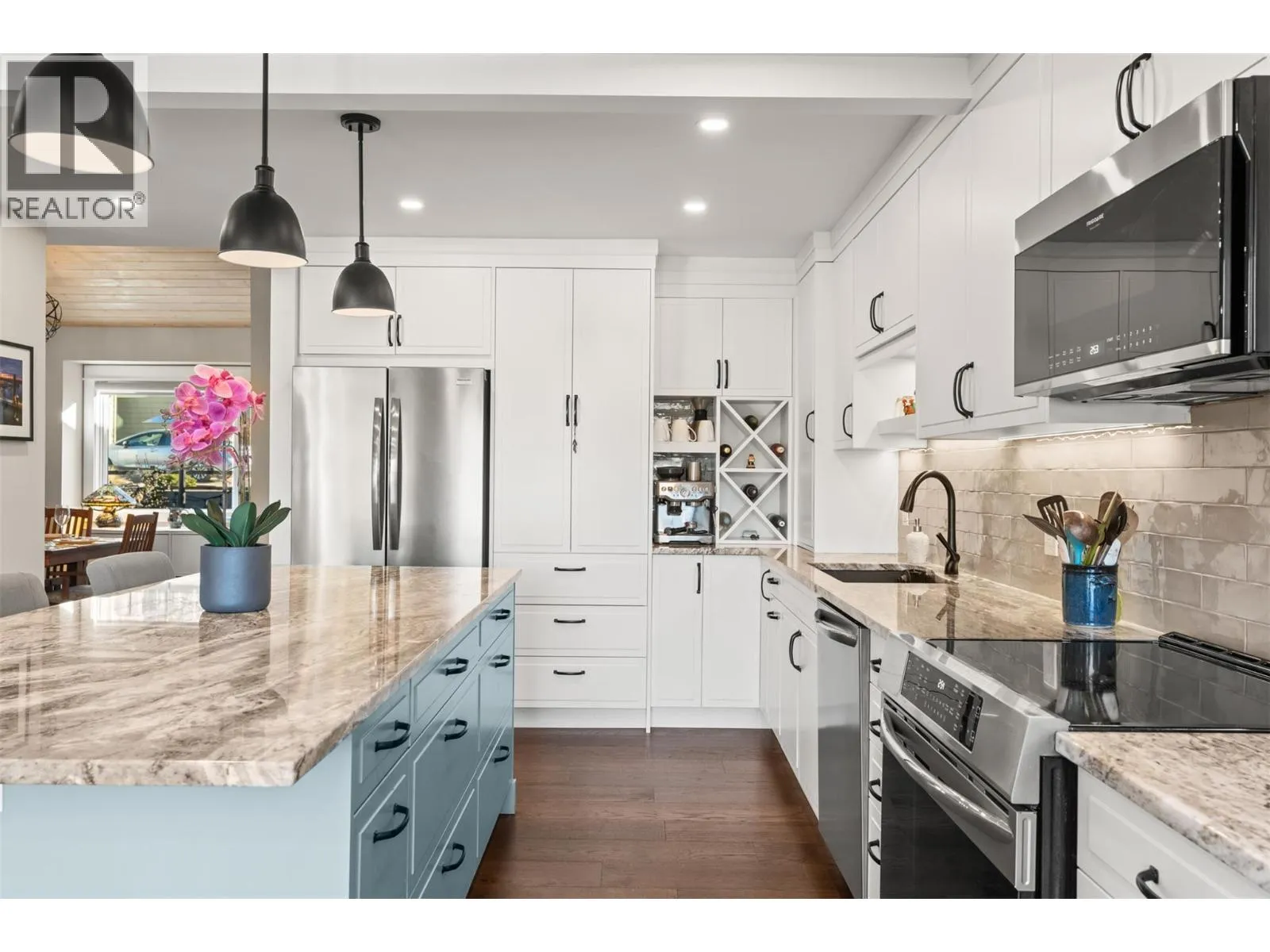 Located in prestigious Coldstream, this beautifully updated end-unit home offers direct access to Kalamalka Lake with a private boat slip for exceptional Okanagan living. The renovated kitchen features new countertops, island, cabinetry, fixtures, and updated appliances. The primary ensuite has been redesigned to offer a spa-inspired experience with a luxurious bathtub, large walk-in shower, vessel sink, heated floors, and new