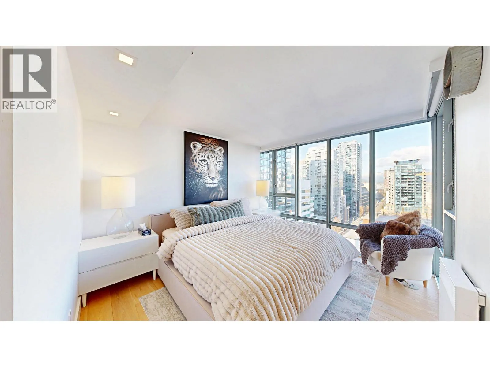 Perched on the 19th floor in the heart of Yaletown, this RARE SE corner unit offers breathtaking & unobstructed views of the city skyline, mountains, and the iconic glow of BC Place. Spanning nearly 1,100 square ft of fully renovated interiors, the home showcases floor-to-ceiling windows, a seamless open-concept layout, upgraded bathrooms with heated floors, and a custom