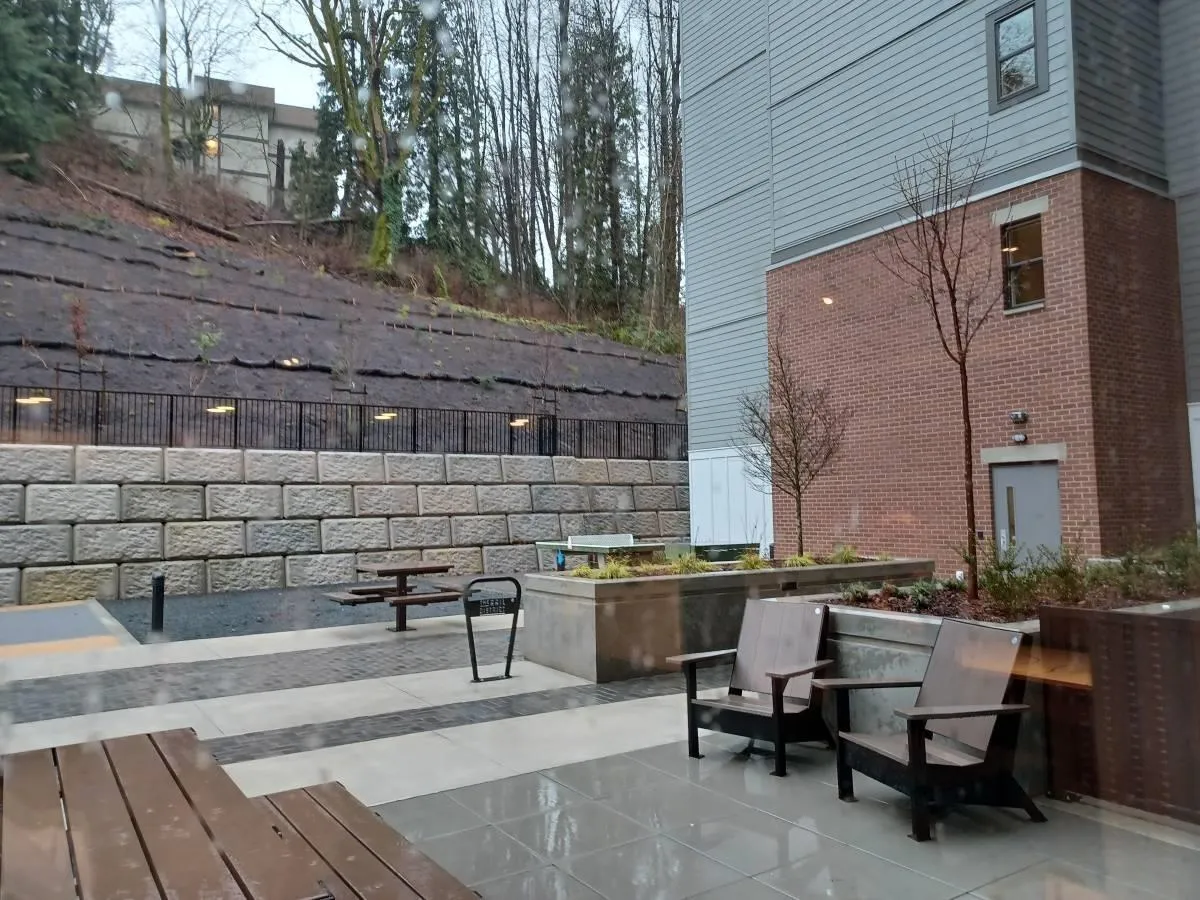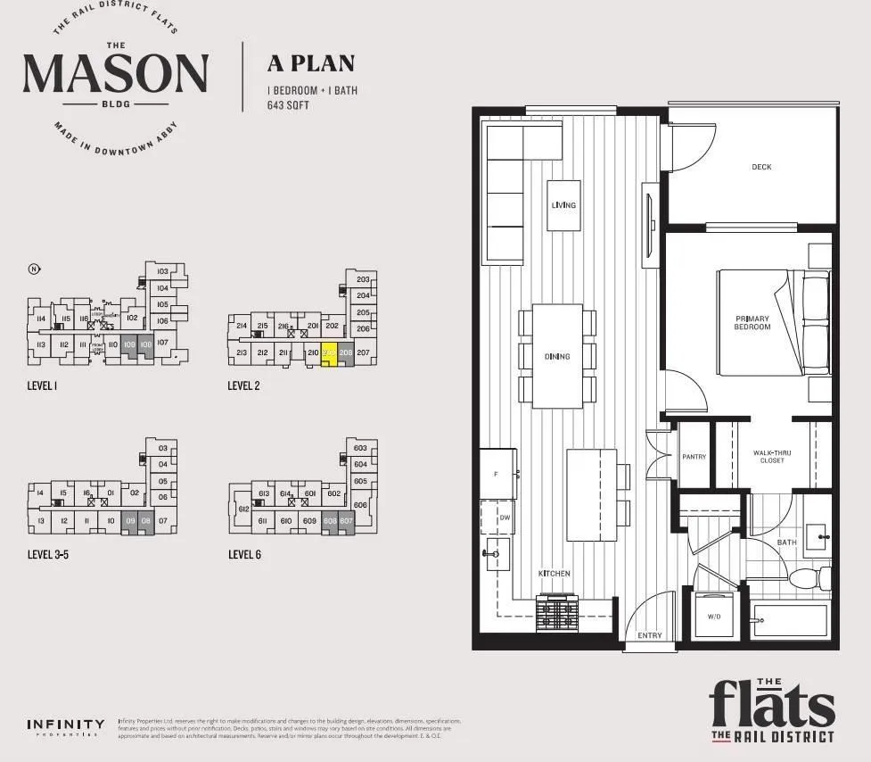 Brand new 1 bedroom, 1 bathroom second-floor condo at The Mason at The Rail District in Abbotsford offering 643 sqft of thoughtfully designed living space. This bright home features 9-foot ceilings, laminate flooring throughout, air conditioning, in-suite laundry & a covered balcony with natural gas BBQ hookup. The modern kitchen is equipped with KitchenAid appliances including a gas range, creating
