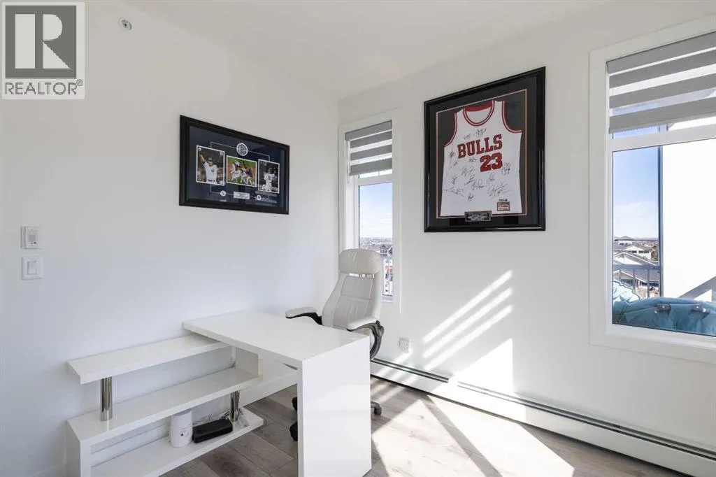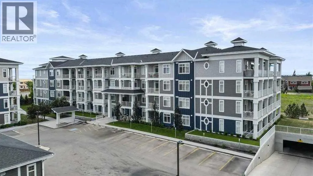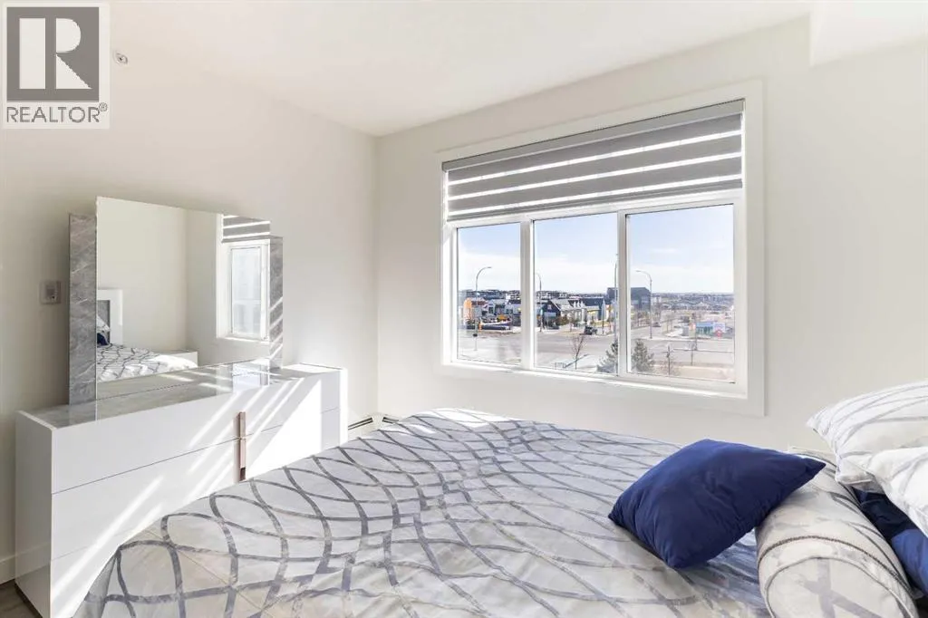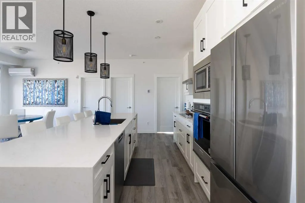 condos in the City, and built only 4 years ago. Step into Unit 406 and you’re welcomed with tall 9-foot ceilings and wide-plank LVP flooring that flows throughout, leading to large windows that completely fill the open-concept living space with BRIGHT natural light. With classic shaker style cabinets in crisp white, and a huge 6-person island with double-waterfall quartz counters and undermount composite sink, the kitchen is a host’s dream come true for guests and family gatherings alike. A suite of quality stainless appliances include a built-in stove and microwave oven, along with a glass countertop range promising quick and easy cleaning once the cooking is done. Step outside and you’ll find a gracious patio, extending nearly 20 FEET along the front of the unit, giving incredible PANORAMIC VIEWS clear to the skyscrapers of the downtown core, and even to the mountaintops to the West, where you’ll get to watch Calgary’s famous SUNSETS! The master bedroom is found tucked away around the kitchen, with an east window offering bright and sunny mornings (and cool evenings), then leading to a walk-through closet which gives way to a private 4-pc ensuite bathroom with dual-sink vanity. The second bedroom also benefits from this east exposure but also offers private access to the shared 4-pc bathroom thanks to a convenient pocket door, meaning guests don’t need to leave the bedroom for access.With so many condos, parking is always an issue, but this unit comes included with an extra large TITLED underground parking stall, allowing for TWO VEHICLES to be parked in tandem. If you need more sto rage, a storage space is also assigned to the unit and located only steps away from the parking stall, the perfect place to store seasonal items or sports equipment. Finally, location, location, location! Imagine NEVER having to drive to the grocery store again! With Co-op located across the street, as well other shops and even the local community pub/restaurant, home can finally be a place where you park your car and take a walk instead. Don’t forget you’ll also get LAKE ACCESS where you can swim and soak up the rays on the beach just down the street from your home! (id:62650)