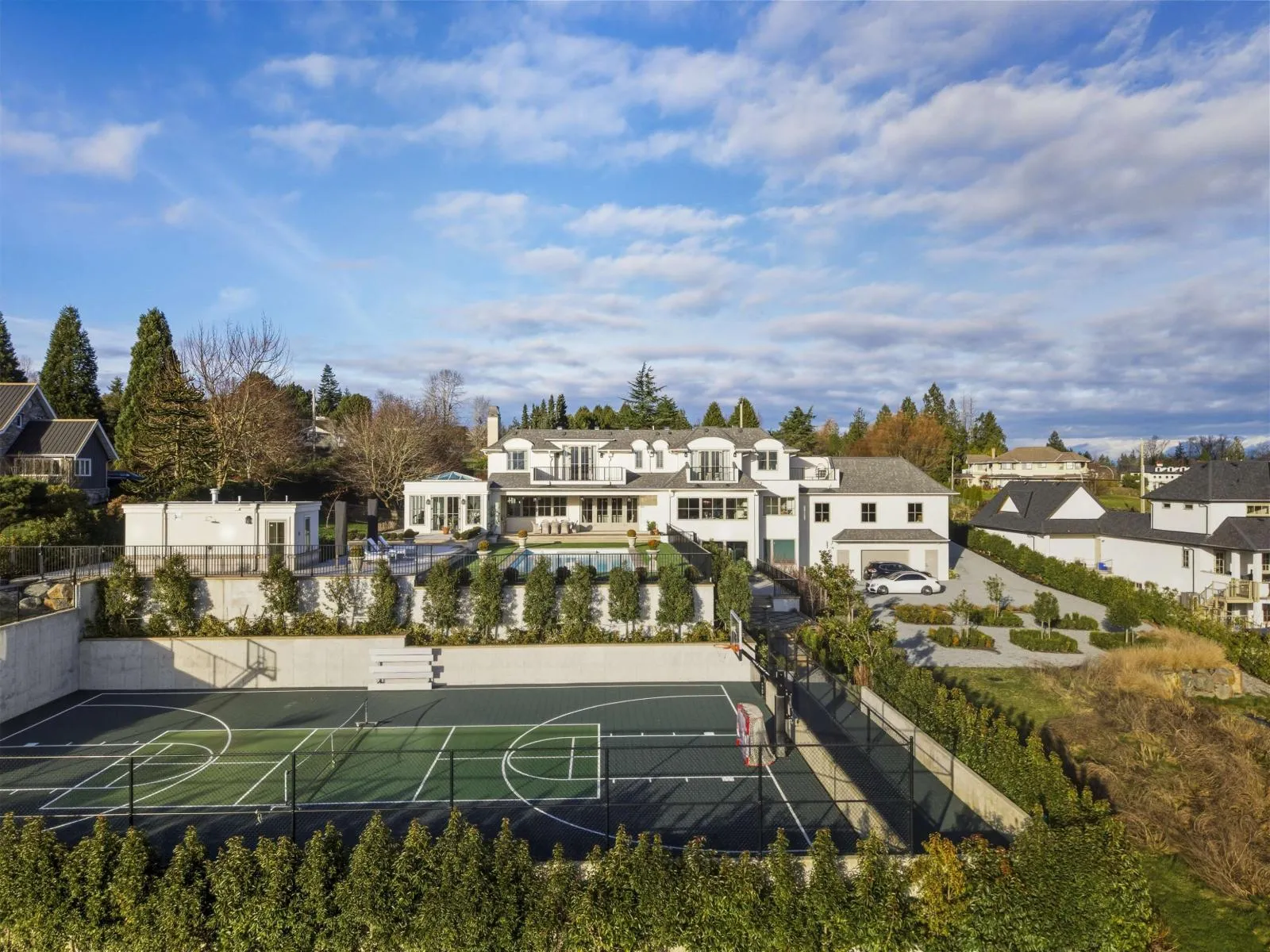 Extraordinary architectural masterpiece by award-winning Jaheny Custom Builders, set on a private 1.5-acre estate and conceived as a modern interpretation of the French Château. This landmark residence blends grandeur with contemporary sophistication, showcasing exceptional craftsmanship and the finest imported materials. The limestone exterior, dramatic rooflines, and precise detailing create a commanding arrival. Inside, Italian marble, French white oak flooring, and