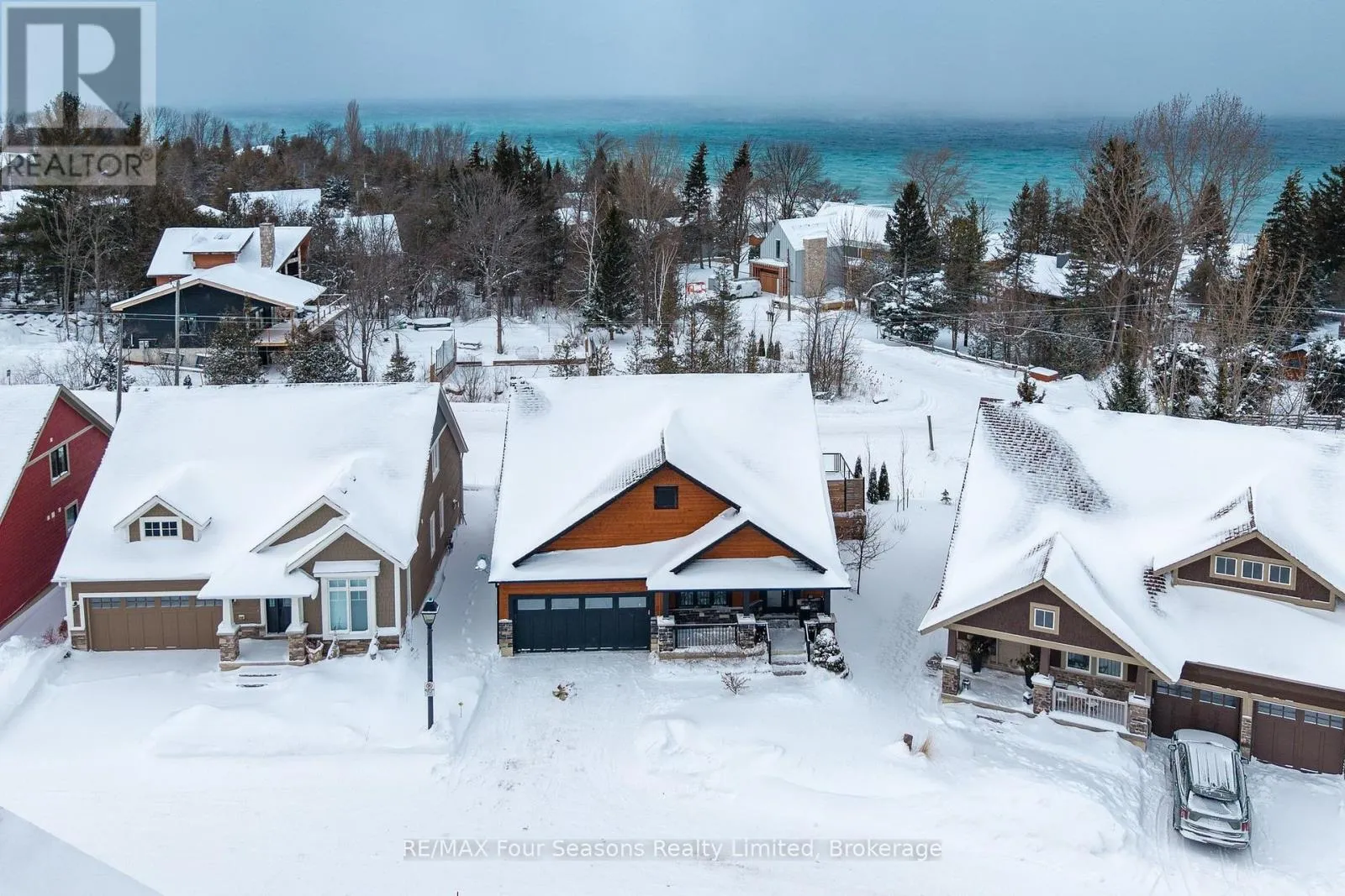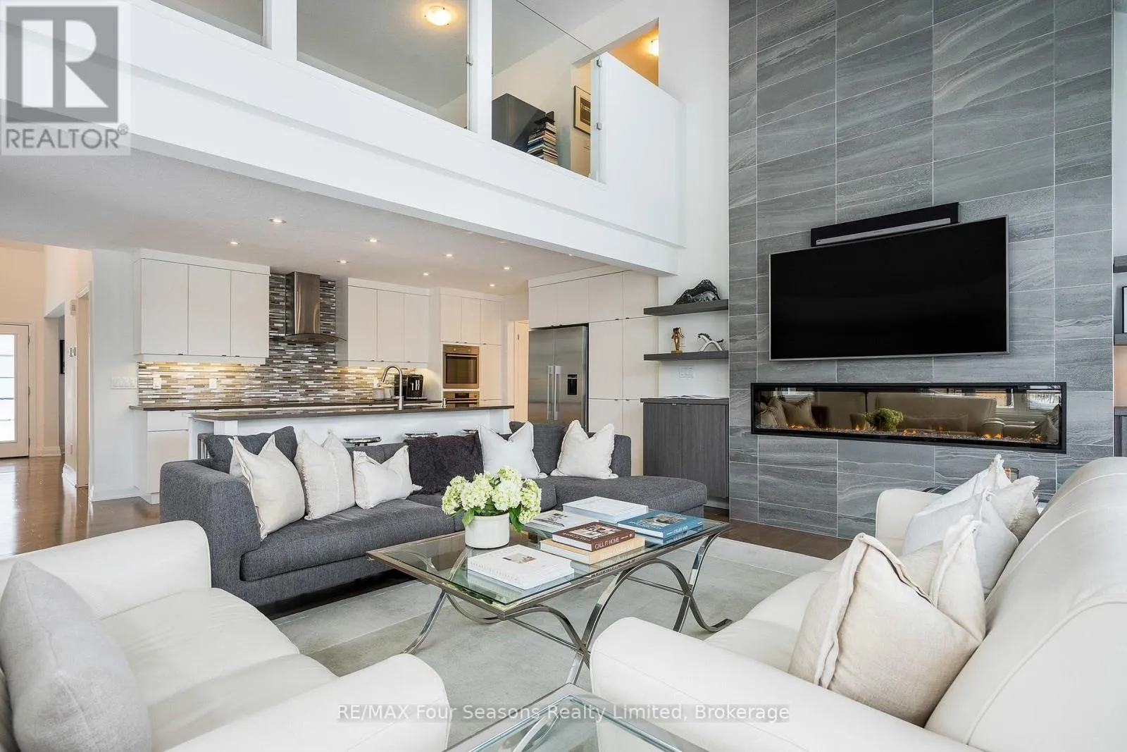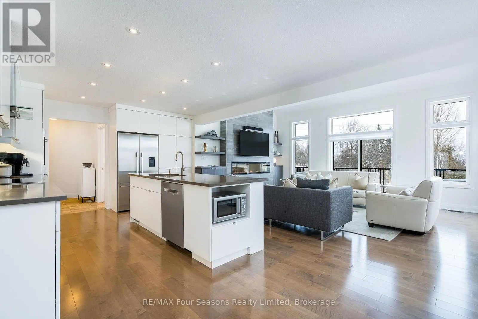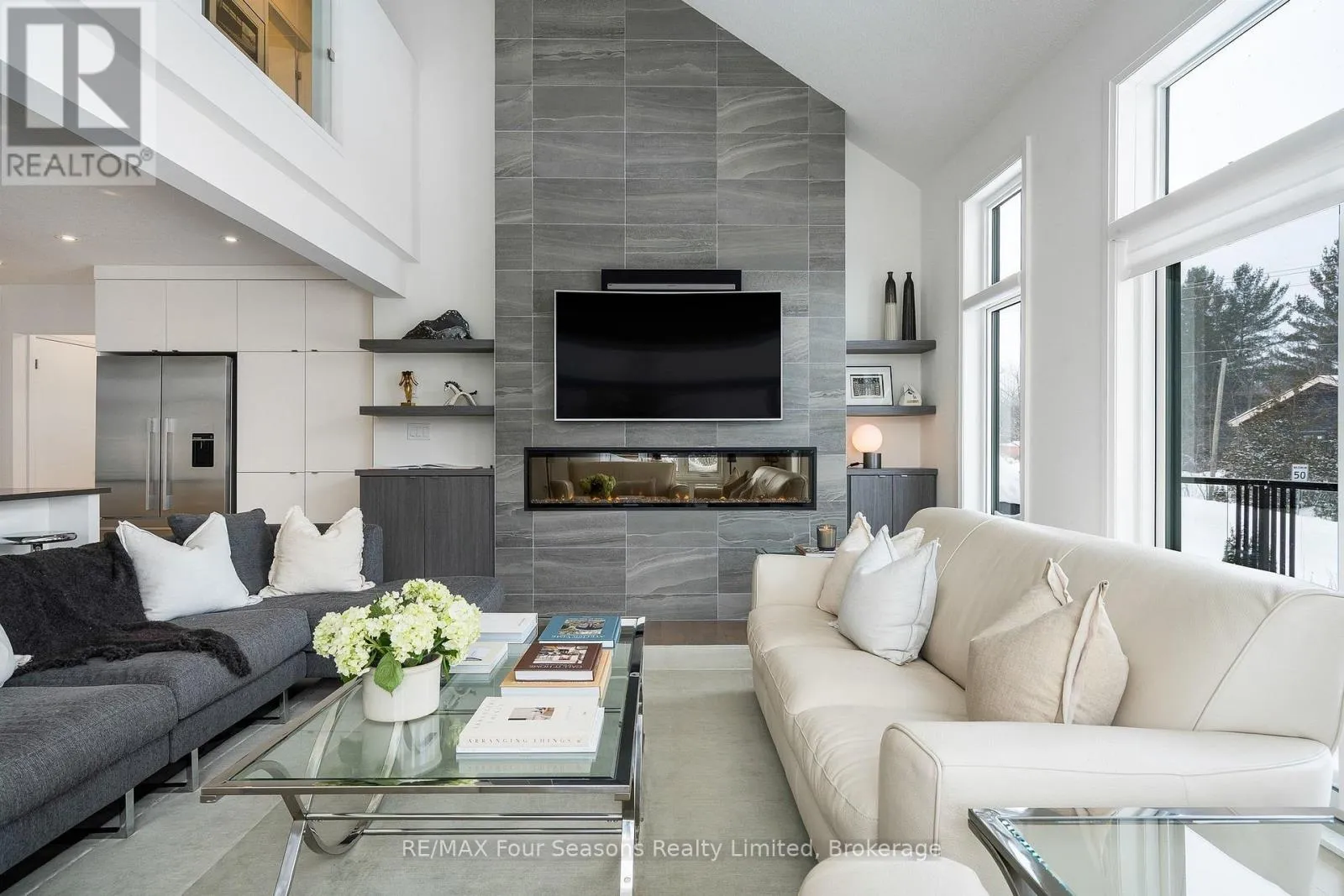 Custom architectural elements define this exceptional 4-bedroom, 4-bathroom bungaloft in prestigious Lora Bay. This home is an effortless blend of modern, timeless, and refined design selected to maximize natural light, privacy and views of Georgian Bay. On the main floor, a seamless open-concept contemporary kitchen overlooks an elegant indoor-outdoor living space anchored by a custom fireplace and features extended windows,