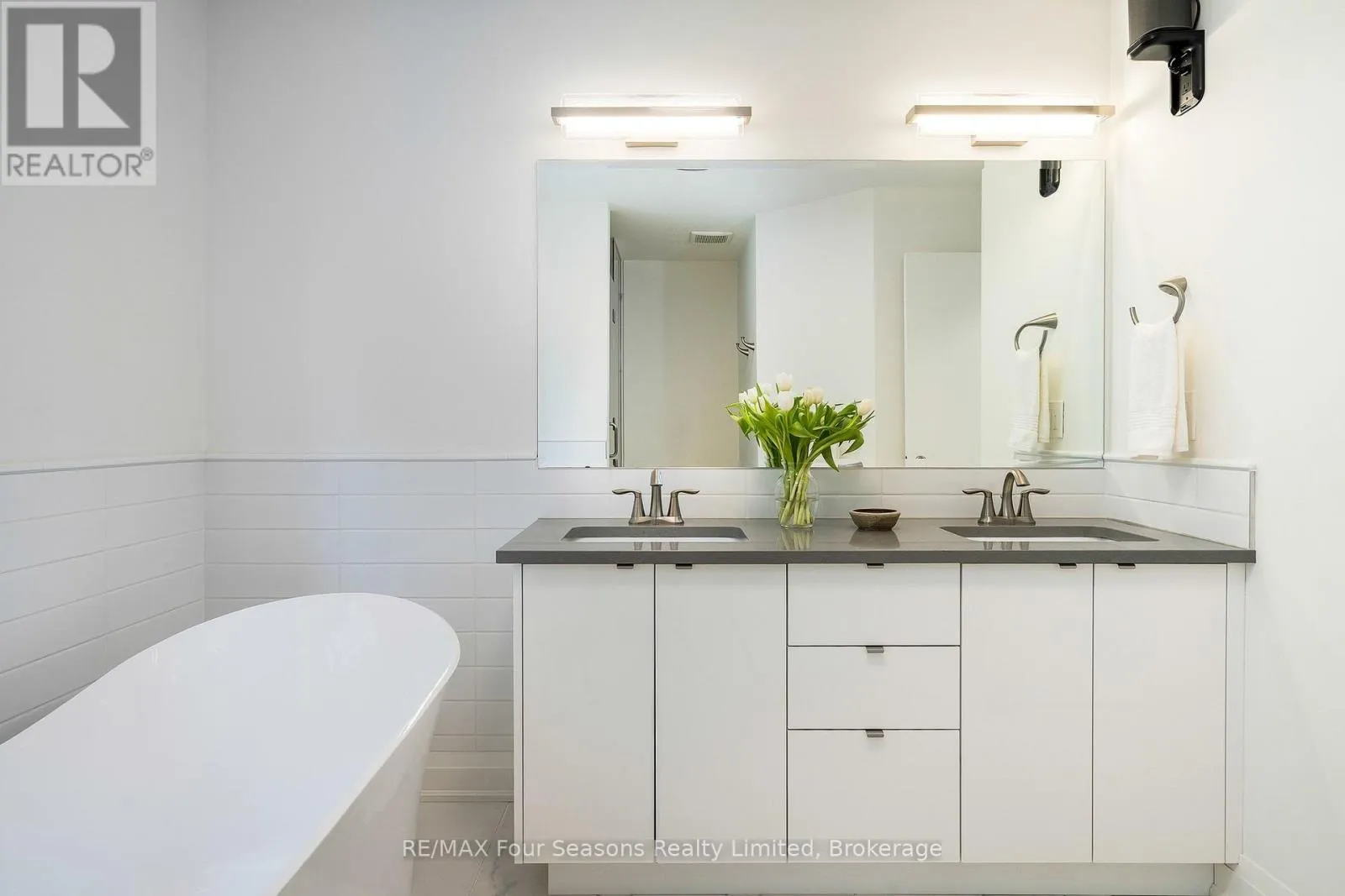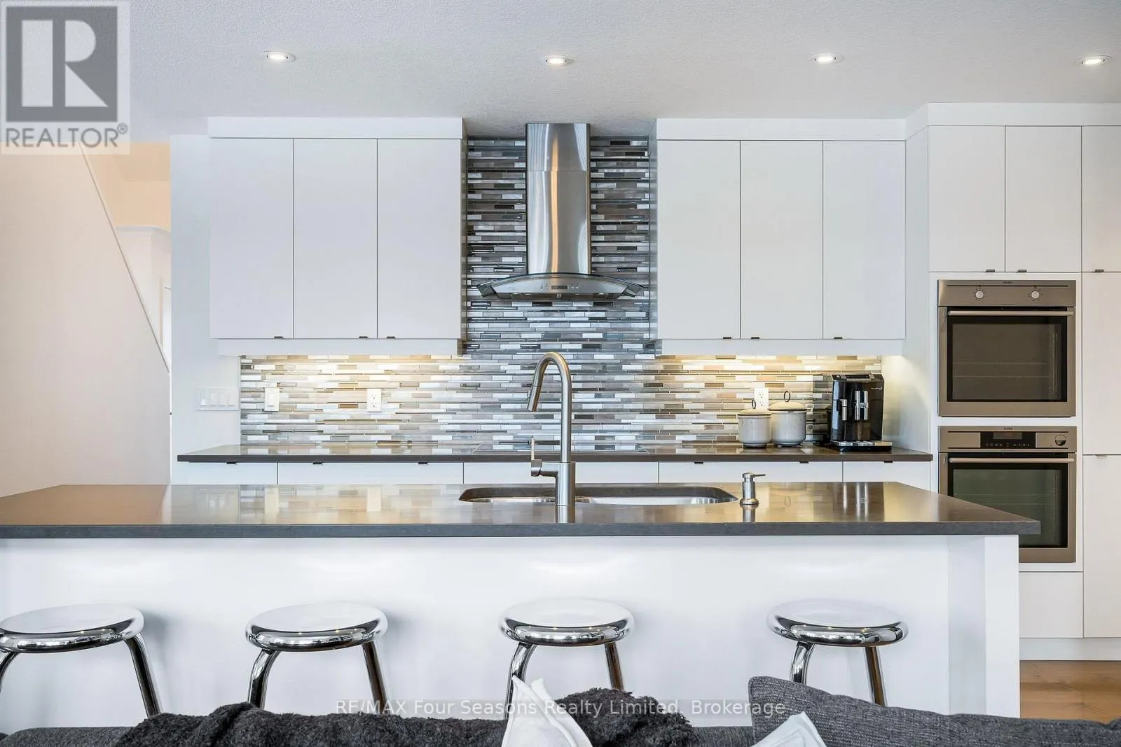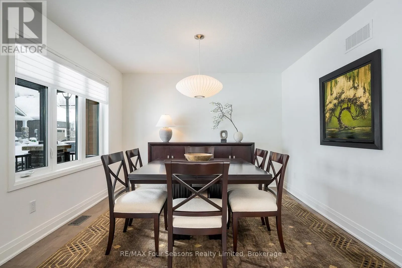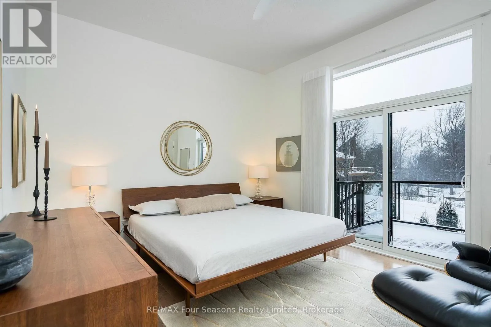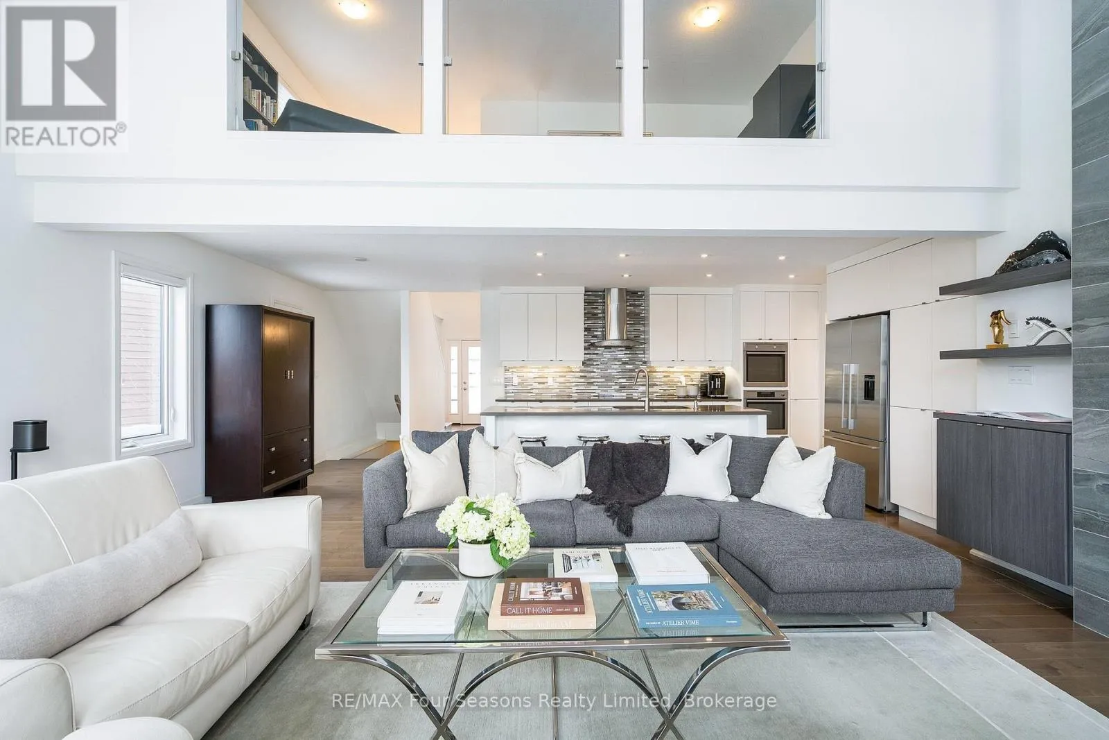 Custom architectural elements define this exceptional 4-bedroom, 4-bathroom bungaloft in prestigious Lora Bay. This home is an effortless blend of modern, timeless, and refined design selected to maximize natural light, privacy and views of Georgian Bay. On the main floor, a seamless open-concept contemporary kitchen overlooks an elegant indoor-outdoor living space anchored by a custom fireplace and features extended windows,