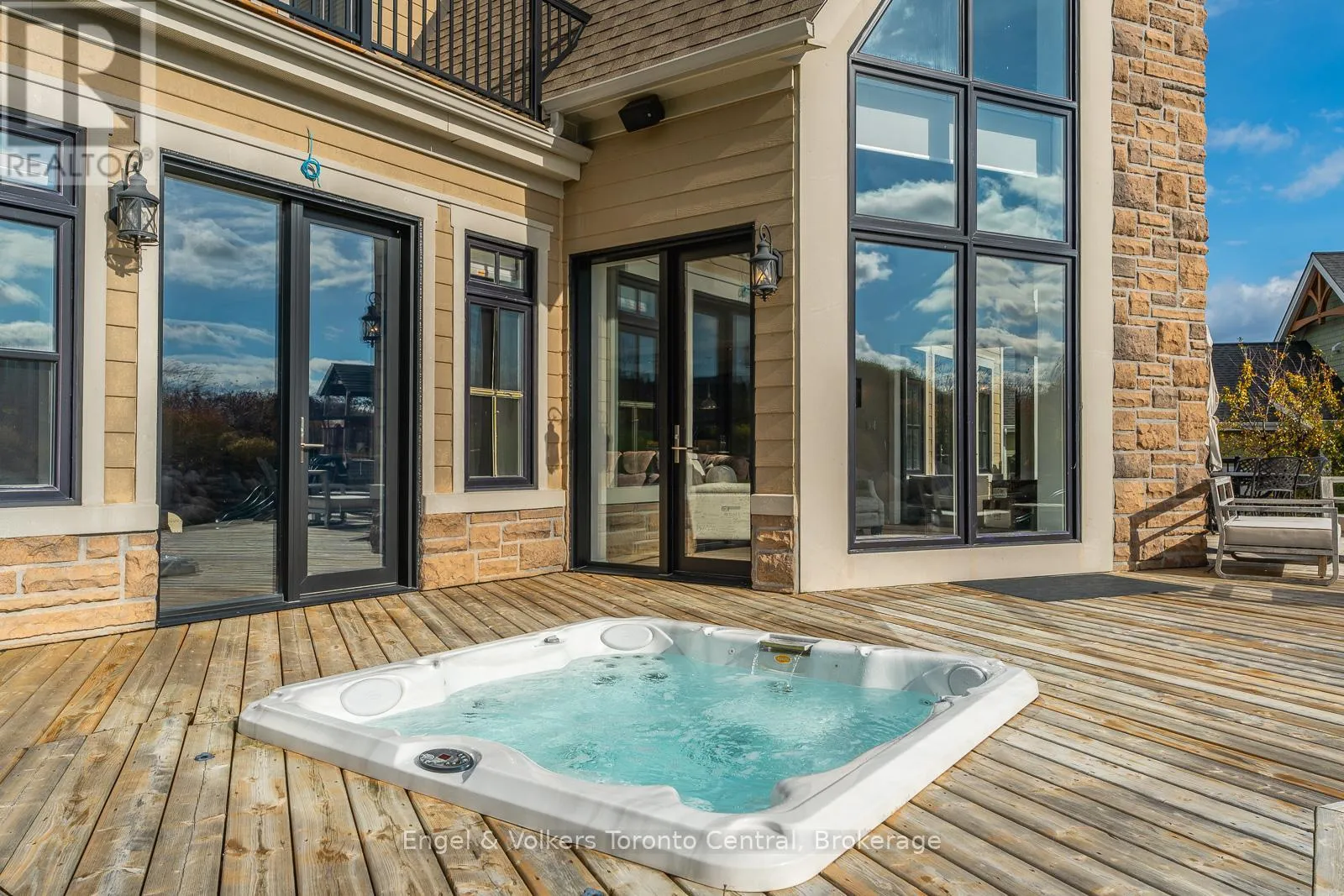 This custom-designed Lora Bay home in The Blue Mountains seamlessly combines contemporary chalet style with eco-conscious materials, like precast concrete and recycled steel, ensuring a low carbon footprint and long-lasting durability. The great room features vaulted ceilings, wood beams, and panoramic golf course views. A modern concrete fireplace adds elegance, and the chef’s dream kitchen boasts granite counters, high-end appliances,