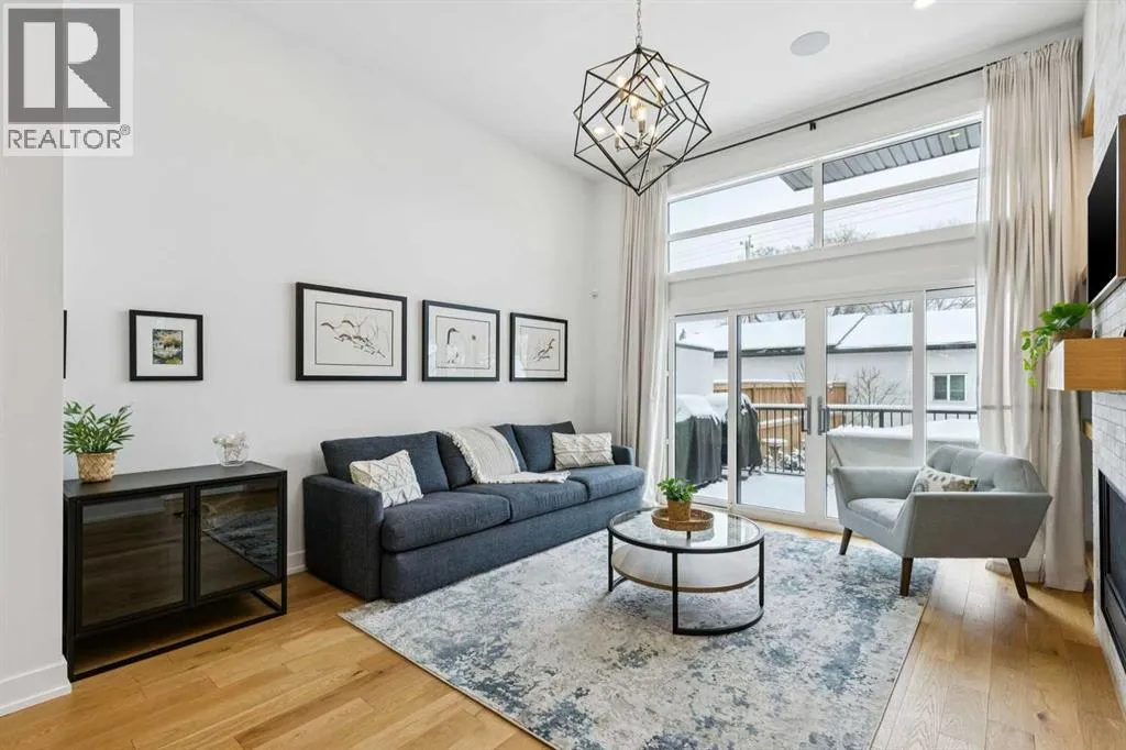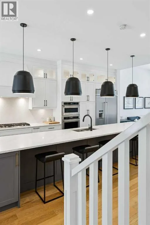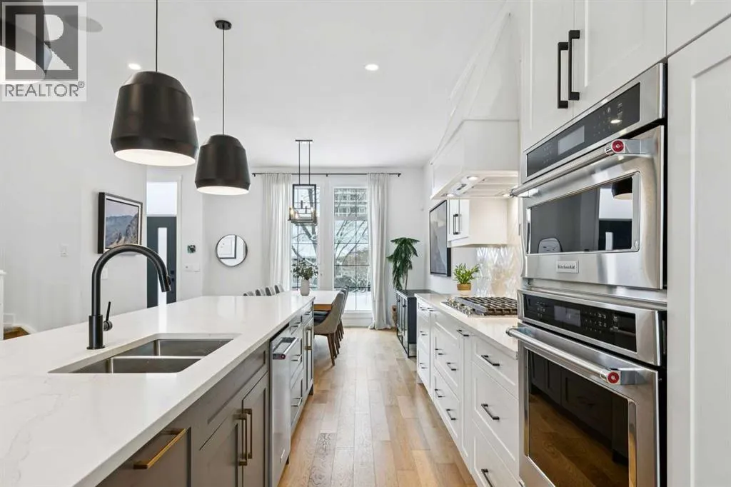 where all of the thoughtful upgrades have already been completed. Tasteful custom window coverings, upgraded lighting, central air conditioning, Kinetico water softener, feature-painted walls, added shelving and hooks throughout, custom wool stair runners, built-in ceiling speakers, and a statement custom front door — it’s all done. The property is expertly landscaped, both front and back, including a beautiful custom stone patio that creates a perfect outdoor entertaining space. The fully finished garage is EV-ready and drywalled and painted for a clean, polished look. The interior selections are clean and timeless, yet still full of personality. Ceiling heights throughout the home elevate the overall feel — soaring 10- and 12-foot ceilings on the main floor, 10-foot ceilings upstairs, and 9-foot ceilings in the fully finished lower level create a bright, airy atmosphere rarely found in infill properties. The main floor layout is ideal for both daily living and entertaining. A stunning 16-foot island anchors the kitchen — a true statement piece and natural gathering space for friends and family. The kitchen is beautifully appointed with full-height crisp white cabinetry, quartz countertops throughout, abundant storage, and expansive prep space. Premium appliances include a 5-burner gas cooktop, wall oven, convection microwave, dishwasher, and a 48-inch side-by-side built-in refrigerator, creating a seamless, high-end aesthetic. Whether hosting a dinner party or enjoying casual mornings at the island, this space delivers exceptional style and functionality. The front dining area overlooks the charming tree-lined street, while the rear living room — featuring a fireplace with included Samsung Frame TV — opens through sliding doors to the sunny west-facing deck and professionally designed backyard, perfect for summer evenings and entertaining. The mudroom is thoughtfully designed with built-in lockers and bench seating, and even the front entry impresses with a spacious walk-in closet. Upstairs, the primary retreat enjoys west exposure and a private balcony overlooking the lush neighbourhood streetscape — perfect for catching the evening sun. The spa-inspired ensuite features a freestanding tub, custom glass shower, double vanity, heated floors, and a private water closet. The upper laundry room includes side-by-side Electrolux machines, sink, and hanging space. The fully finished lower level is where the fun happens. Featuring radiant in-floor heating, a spacious open recreation area, and a massive entertainer’s bar complete with beverage centre ! (id:62650)