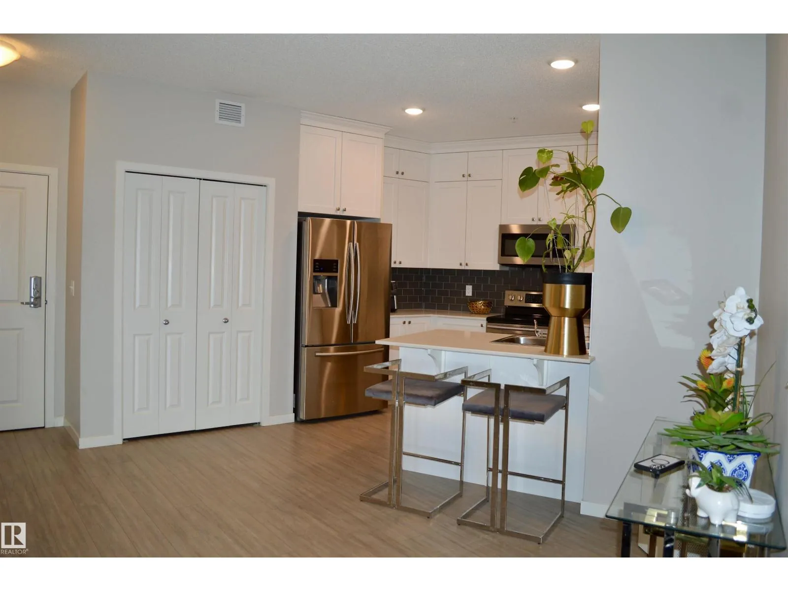 Top floor 2 bedroom penthouse unit that’s fully upgraded! It’s an entertainers dream with 9′ ceilings, huge open concept design with space for big dining table and living room, spacious primary bedroom with massive walk in closet and 3 piece bath with 5′ glass shower, den off the living room is used as a bedroom, kitchen is stunning with white