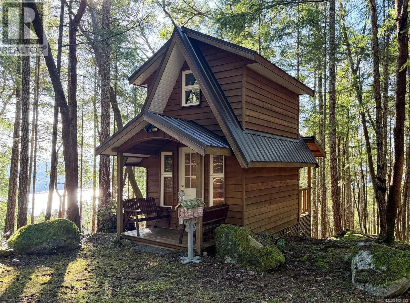 Stunning ocean and mountain views are enjoyed from this private 5.18-acre property on Gabriola. Tucked into the woods, this charming 676 sq ft wood-sided cottage with a metal roof offers a beautiful retreat with a southwest-facing deck perfectly positioned to take in the expansive views across the water and islands. Inside, the home has a warm, inviting feel with wood