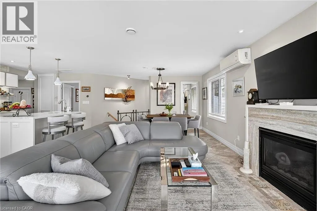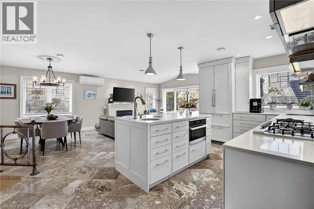 in the kitchen and centre island with sink, ideal for gathering around for all occasions! The same luxury French limestone floors flow seamlessly into the great room which is centred around a focal gas fireplace. Vaulted ceilings and strategically placed pot lights provide a soft, relaxing feel. Sliding doors opens to a new deck with custom railing, perfect for enjoying with friends and faces the lake side. The great room melds with formal dining area, making this open plan the perfect space to entertain in all occasions! The primary suite is serene and offers generous walk-in closet and stunning ensuite spa bath with jacuzzi soaker tub, stand alone glass shower with raindrop shower head and separate handheld attachments. This ensuite also enjoys the comfort of in-floor heating. Back in the bedroom, there is access to private outside deck that runs the width of the house and displays flowerbed, quiet bbq area and shed. The fully finished basement with family room is a great area to hang out or watch a movie on the huge wall-mounted TV. Gorgeous 3-piece bath with in-floor heating. So many built-ins on which to showcase your collectibles. Niagara is known as Wine Country – so for the discerning oenophile, a spacious wine cellar with plenty of space to store vintages! Kitchenette/laundry room makes this lower living space the perfect retreat. Office has a tasteful murphy bed to accommodate guests staying overnight. Plenty of storage w/ shelving in furnace room. Perfectly sized lot for retirement or weekend getaway. Walk to Lakeside Park. Close to QEW! (id:62650)