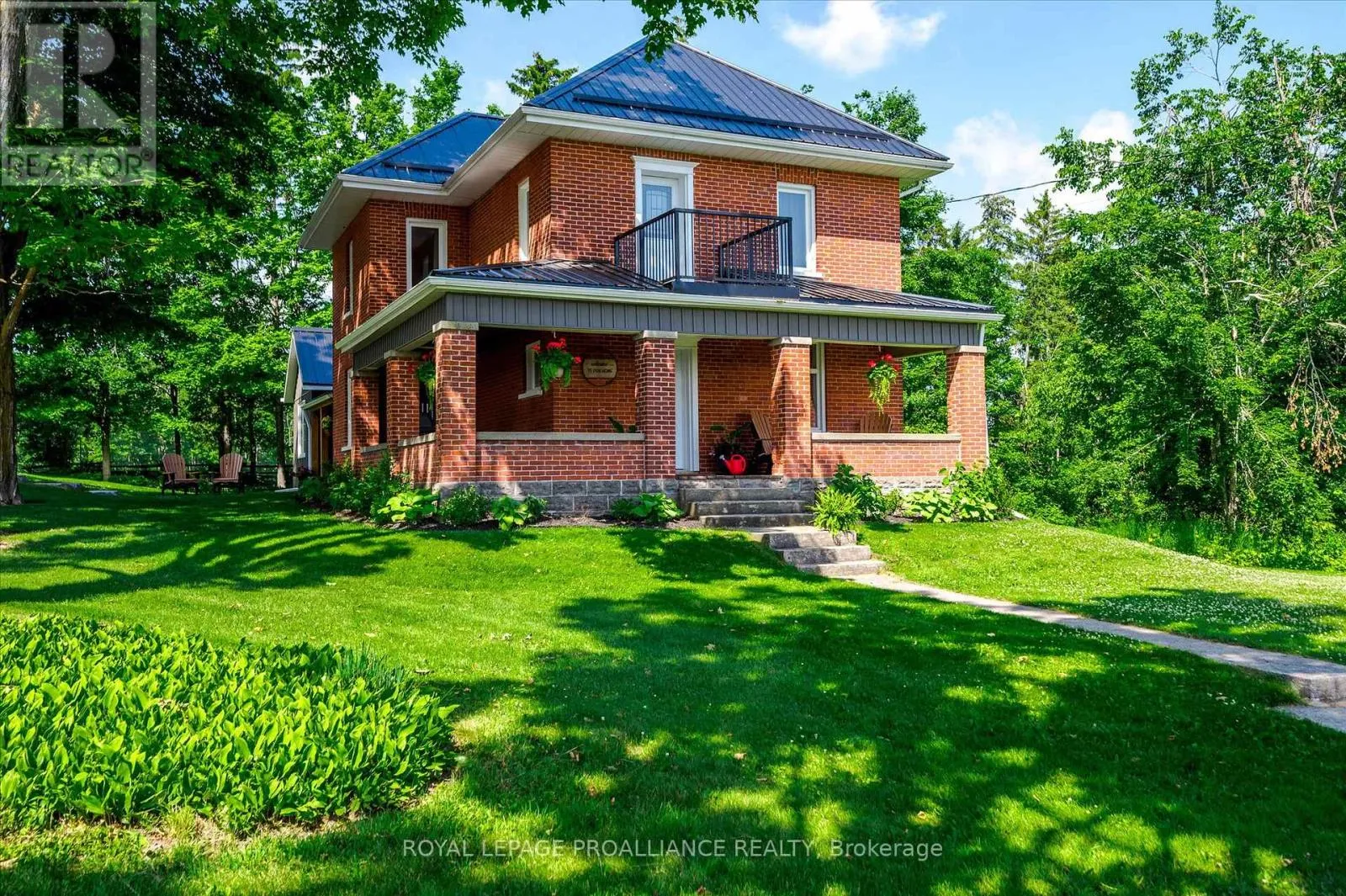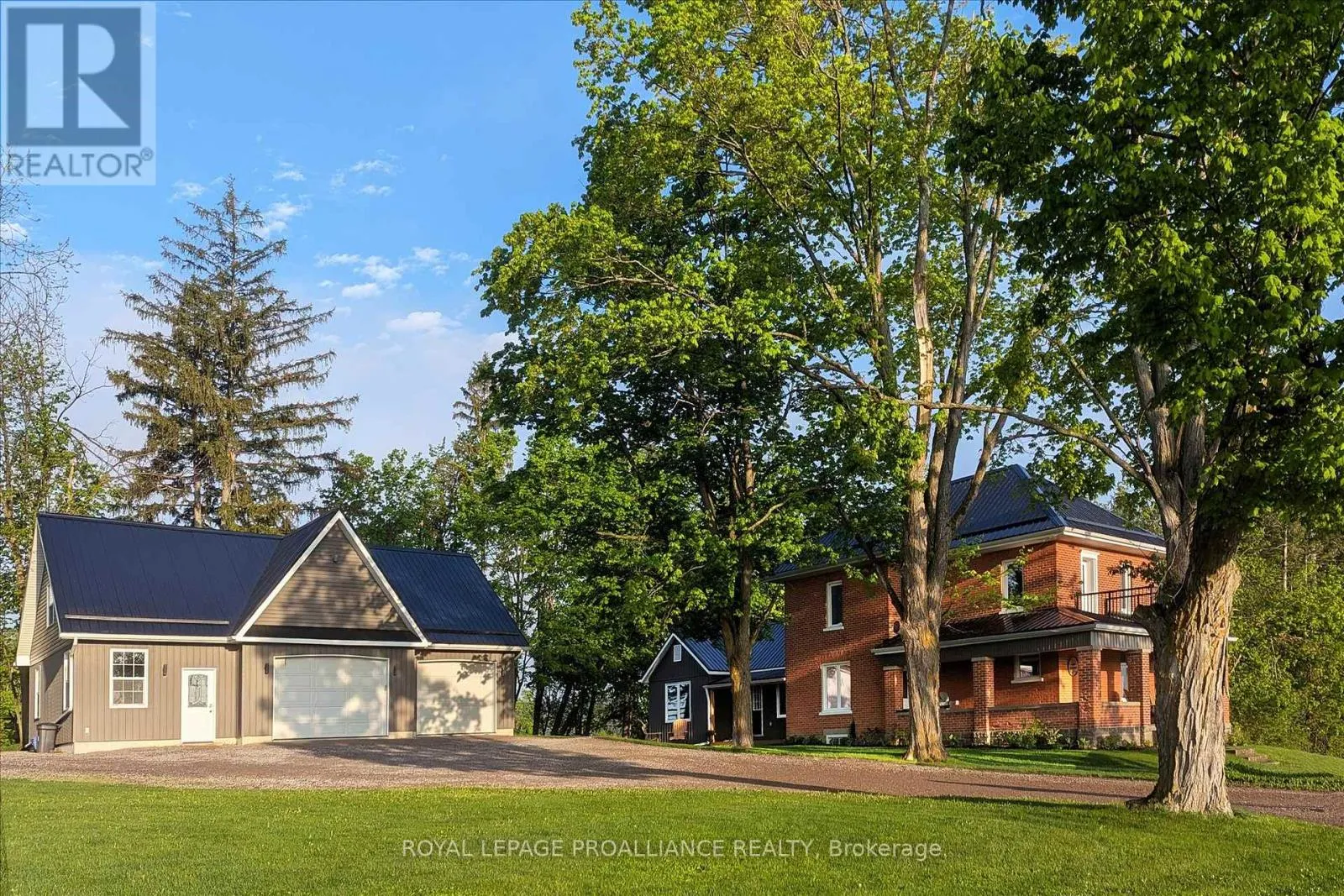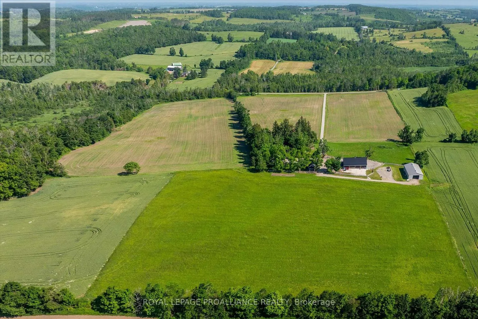 **Welcome to the Original Bland Farm** – Perched on a hilltop, this 95+ acre farm boasts privacy, serenity, and extraordinary miles-long views in Cavan Hills. Completely refurbished, having seen over $500,000 in investments over the past decade, including a complete remodel of the 2,150 sq ft century brick home and the addition of four outbuildings, including an oversized detached 2.5-car