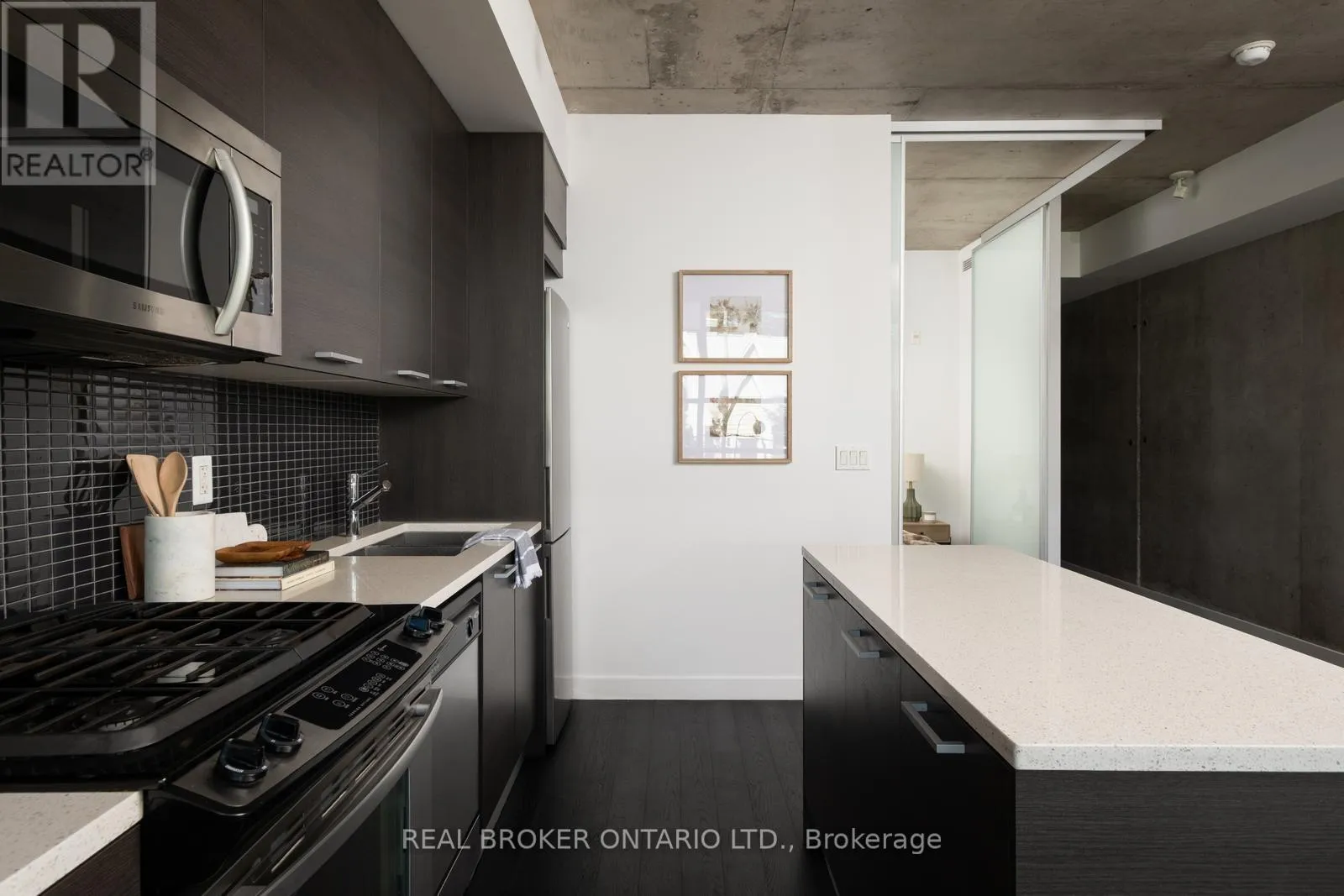 Welcome to The Ninety, a boutique loft residence where contemporary design meets authentic urban character. This thoughtfully designed 1+den suite showcases exposed concrete walls and ceilings, hardwood flooring, stainless steel appliances, and a seamless open-concept layout ideal for modern living.The generous den offers exceptional flexibility-perfect as a second bedroom, home office, or creative space-while expansive wall-to-wall windows flood the living