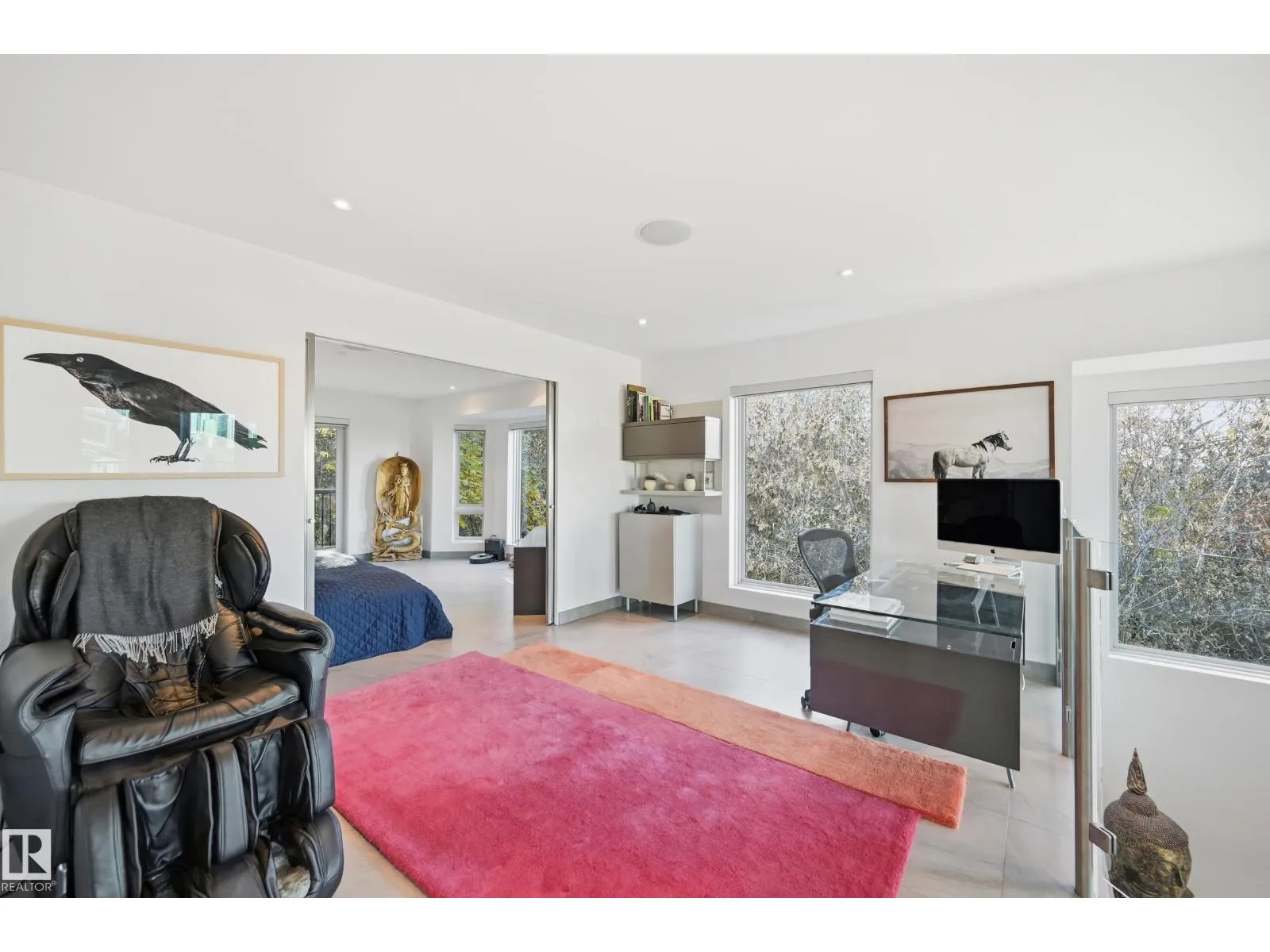 ARCHITECTURAL GEM IN EDMONTON’S RIVER VALLEY! Tucked into the quiet enclave of Skunk Hollow, this modern home blends thoughtful design with rare privacy. Rebuilt from the frame up in 2007, it offers clean lines, warm natural light, and a calm connection to its ravine setting. Large windows frame views of the trees by day and city lights by night. The