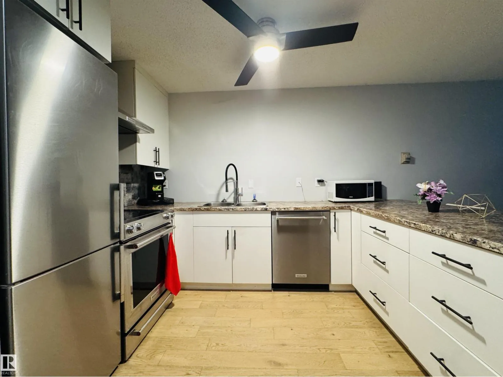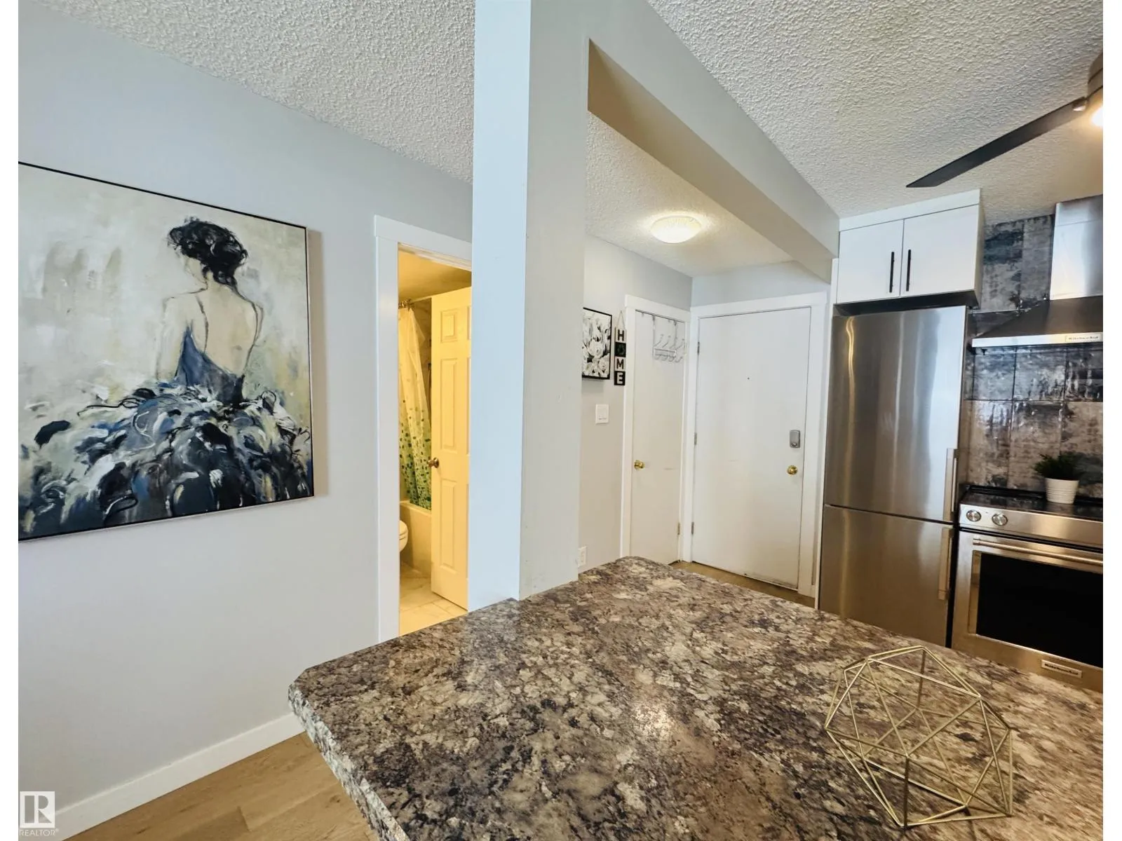 IMPRESSIVE & RENOVATED!! 1 Bedroom, 1 Bath condo presents: Vinyl Plank flooring throughout, Newer White Kitchen with 3 Stainless Steel appliances, the stainless steel hood fan & the island breakfast/lunch/dinner bar. It also boasts a lovely primary bedroom, 4PC bath plus the Insuite laundry to include the stacker washer & dryer. You will find the patio/deck just out the sliding