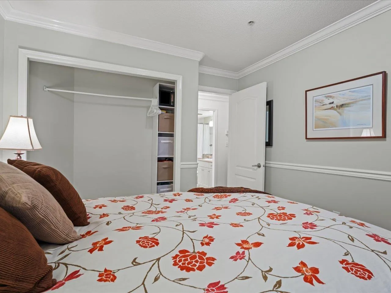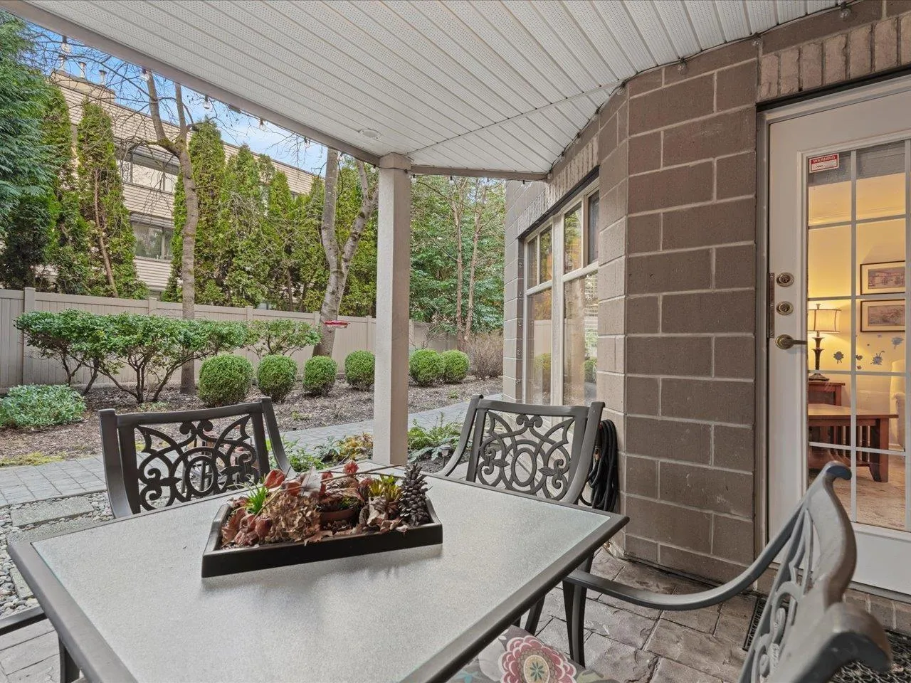 STRATFORD GARDENS – Sought-after ground-level suite on the quiet side of the complex. Meticulously cared for, this spacious 1120sqft 2 bed/2 bath home offers a thoughtful layout and inviting living space with the added bonus of a private, west-exposed patio. Crown moldings and a cozy gas fireplace add timeless character. The generous primary bedroom features a full ensuite with soaker
