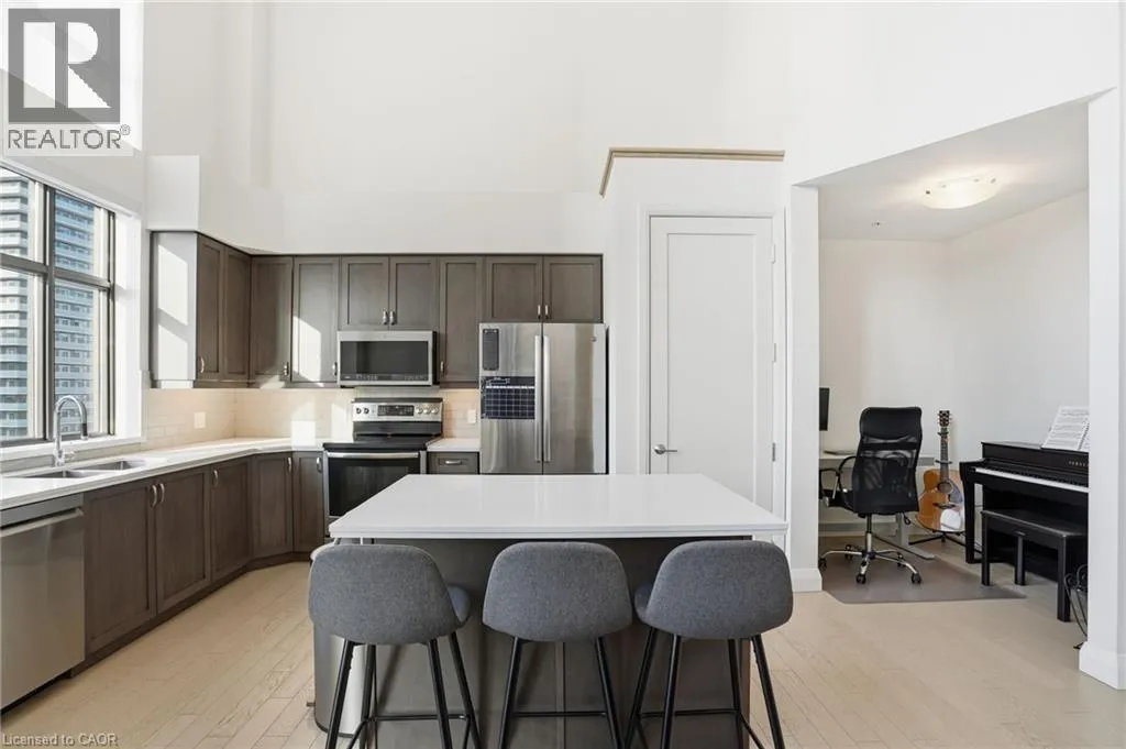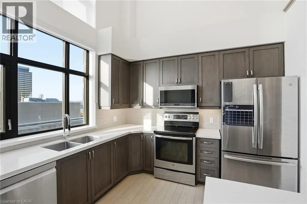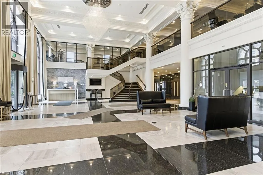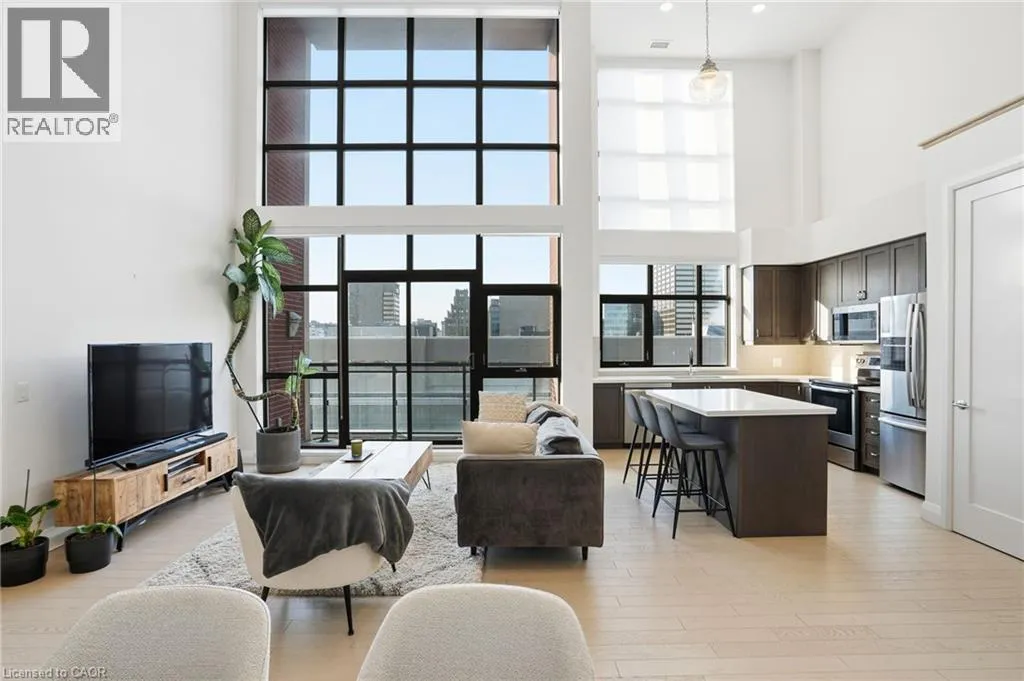 Step into elevated city living in this rare two-storey 2-bedroom, 2-bathroom, plus den lower penthouse at the iconic Residences of Royal Connaught. This 1,267 sq ft west-facing suite features dramatic 18-foot ceilings, expansive floor-to-ceiling windows, and breathtaking, unobstructed views of the Escarpment, Gore Park, and Hamilton Harbour. The main level offers a bright open-concept living space with a den, laundry,