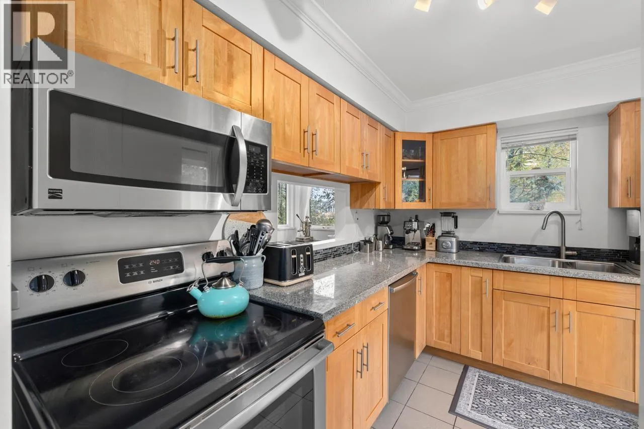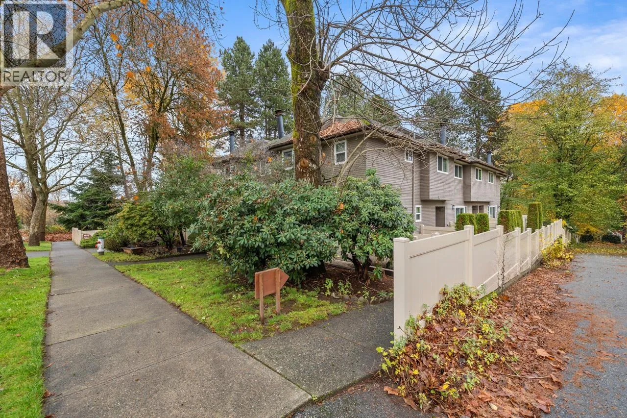 Charming 2 bdrm & den end-unit townhouse in a boutique 7-home complex, centrally located yet tucked into a peaceful, forest-like setting on a quiet street. Spacious living/dining area, cozy wood-burning f/p, & convenient 2 piece bath on main. Updated kitchen leading to a large, S-facing, fully enclosed patio, perfect for entertaining. Bright & private 2 level home feels like a