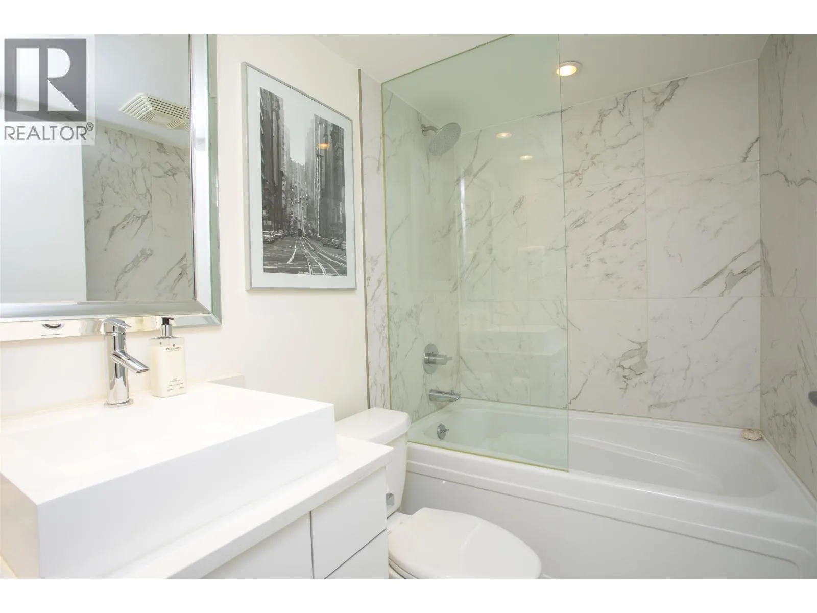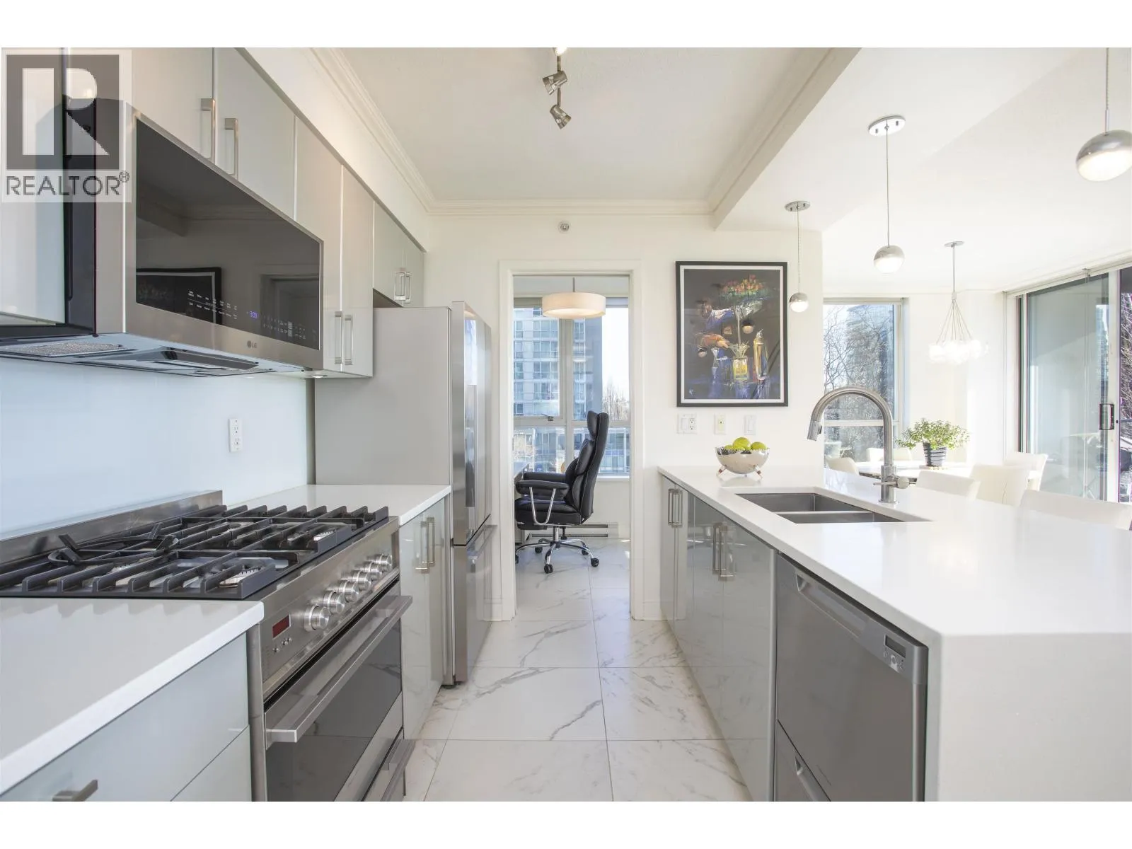 Tastefully renovated, South-facing corner home at Azura I. Ideally located next to George Wainborn Park and within steps to the Seawall. This 1,160 square ft 2-bedroom & den features an updated kitchen with quartz counters, stainless steel appliances, a gas range, and generous island seating. Beautiful new white oak hardwood flooring is featured throughout, and both bathrooms are completely refreshed