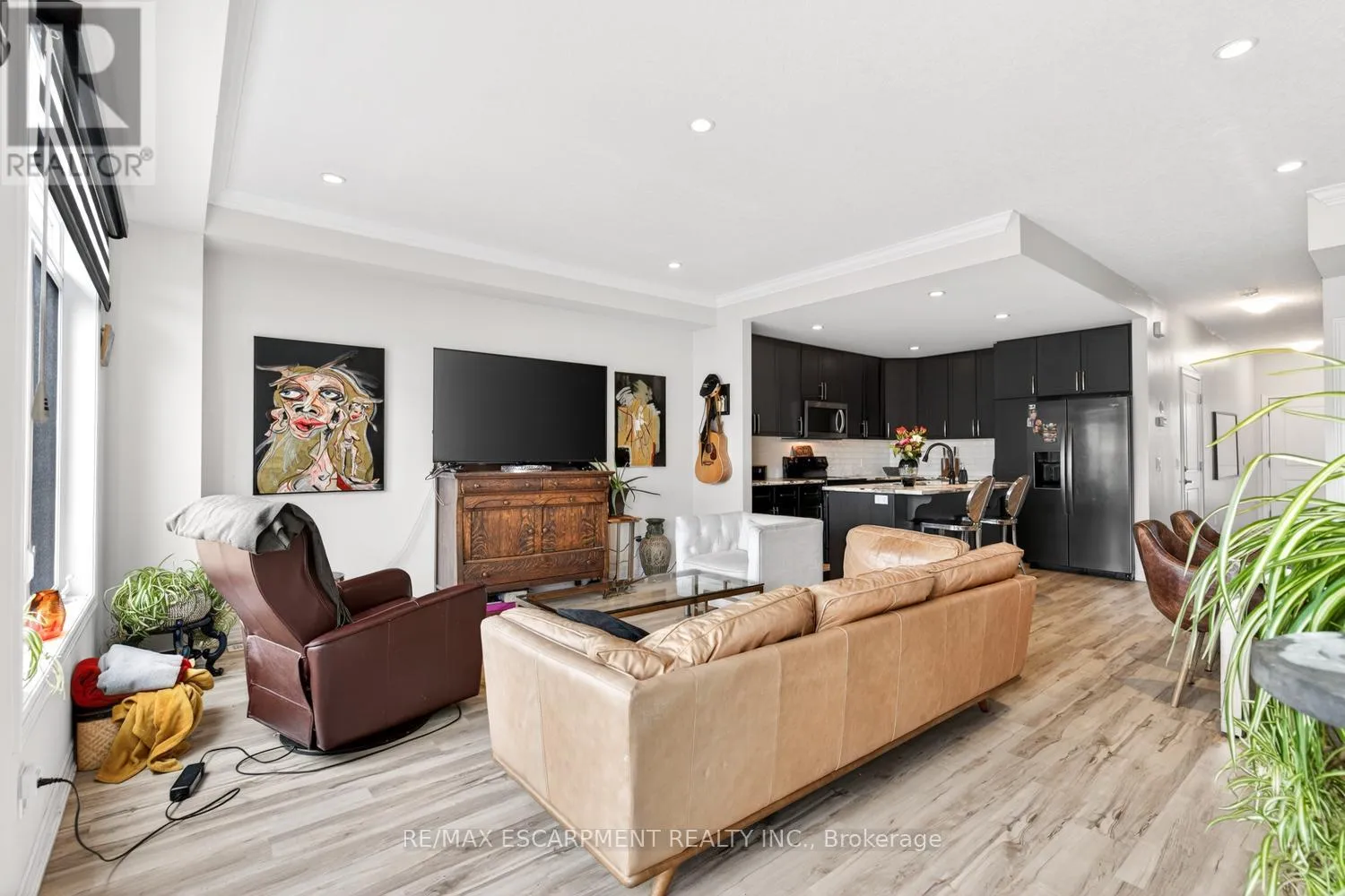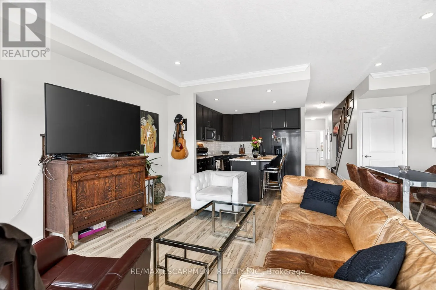 Beautiful 3 bedroom, 2.5 bathroom townhome with over 2,200 sq ft of finished living space. Bright open concept main floor with modern flooring, pot lights, and spacious living and dining areas. Stylish kitchen with dark cabinetry, stone countertops, stainless steel appliances, subway tile backsplash, and large island with breakfast bar. Upper level offers a generous primary bedroom, two additional bedrooms,