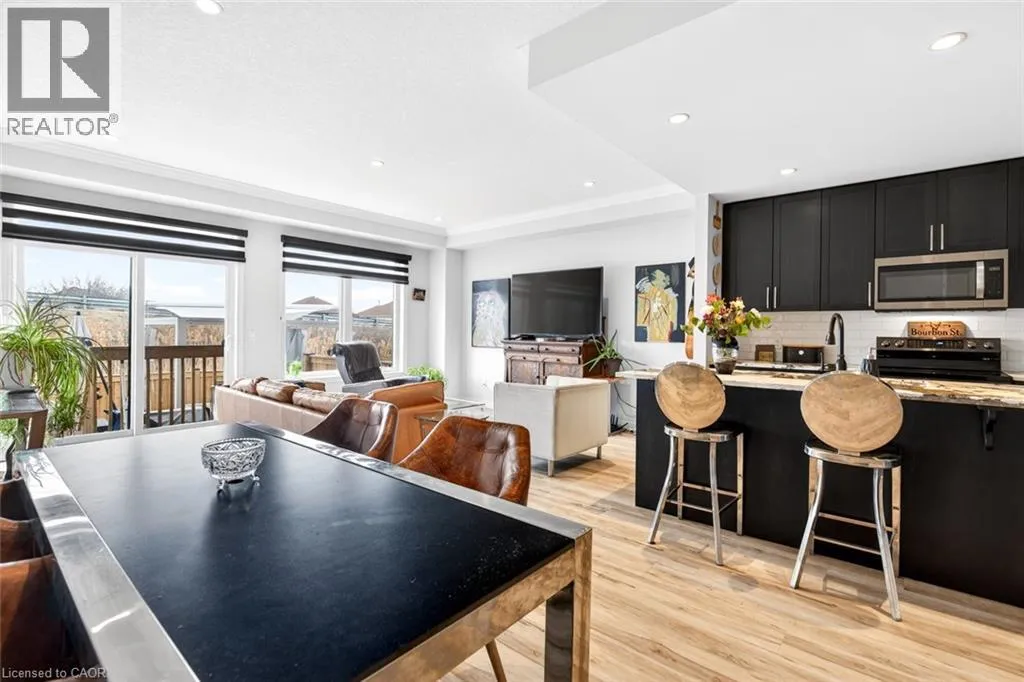 Beautiful 3 bedroom, 2.5 bathroom townhome with over 2,200 sq ft of finished living space. Bright open concept main floor with modern flooring, pot lights, and spacious living and dining areas. Stylish kitchen with dark cabinetry, stone countertops, stainless steel appliances, subway tile backsplash, and large island with breakfast bar. Upper level offers a generous primary bedroom, two additional bedrooms,