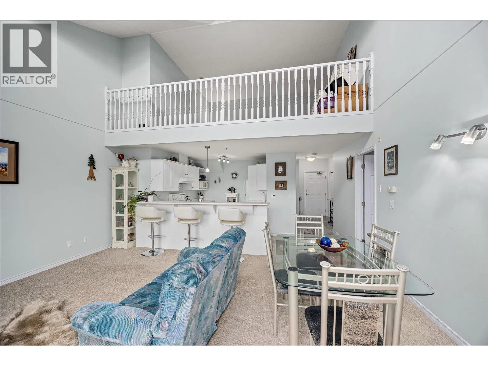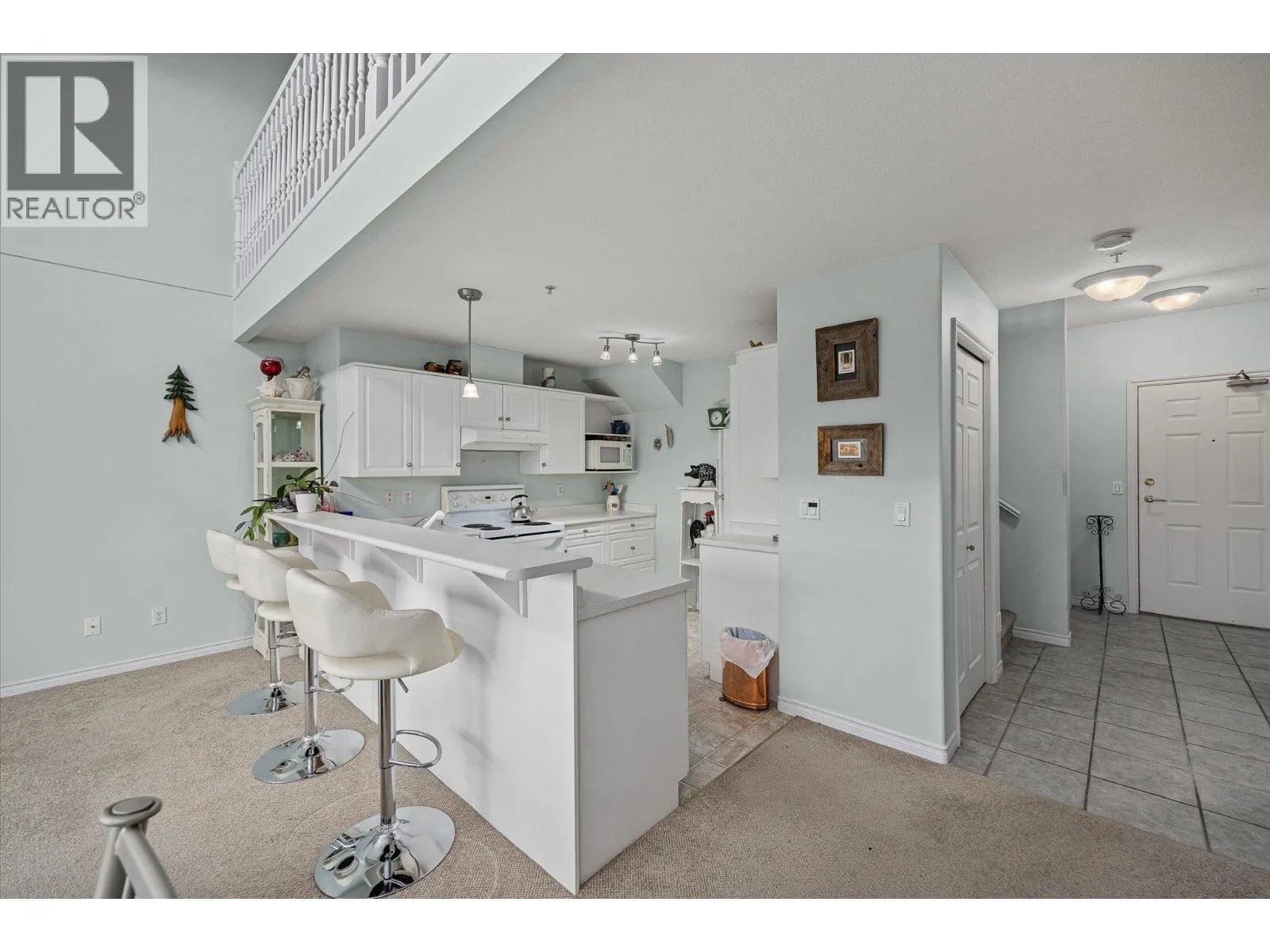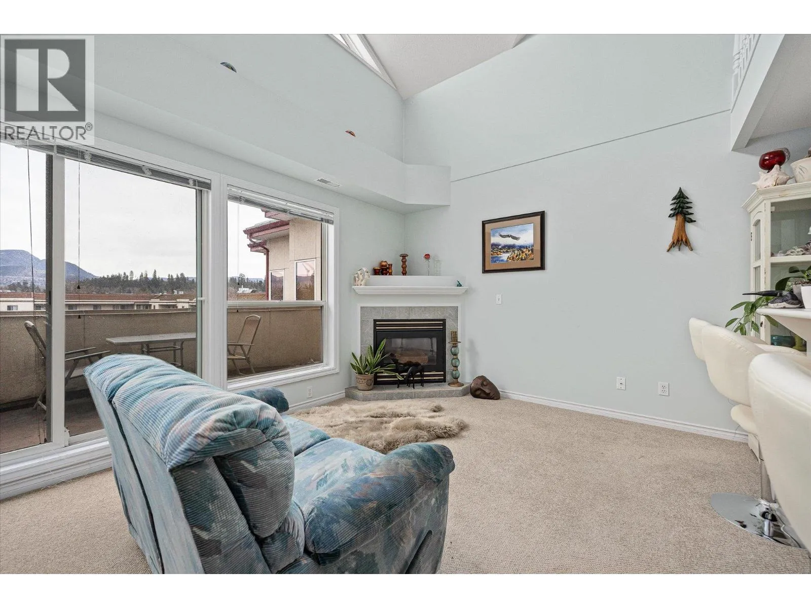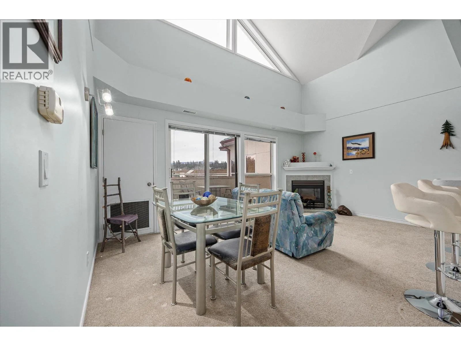 Bright and spacious top-floor 2-bedroom condo featuring vaulted ceilings and an open-concept layout filled with natural light. The main living area is warm and inviting, complete with a cozy gas fireplace and large windows. The kitchen provides ample counter space and a convenient breakfast bar, perfect for everyday living and entertaining. Step out onto the 14 x 6 east-facing deck