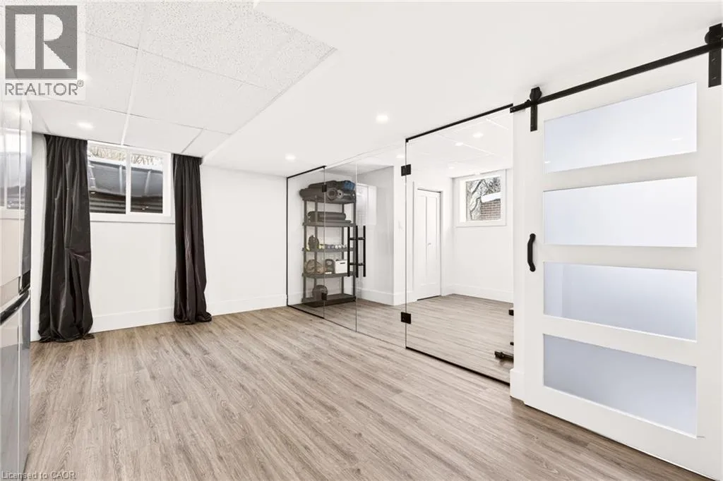 multiple walkouts, the home is ideal for both everyday living and entertaining. The updated kitchen with high-end appliances opens to a bright sunroom overlooking the private backyard. A rare main-floor primary suite offers a lounging area and a luxurious ensuite with glass shower, heated floors, and ensuite laundry. The finished lower level includes a cozy family room with fireplace, glass-walled gym, kitchenette area with built-in bar, 3-piece bathroom, second laundry, and a walk-up to the pool area. The backyard is a private oasis with multi-tier decking, patio, landscape lighting, and an inground concrete pool, surrounded by mature trees and nature. A perfect blend of comfort, charm, and Muskoka-style living in one of Burlington’s most desirable neighbourhoods. (id:62650)