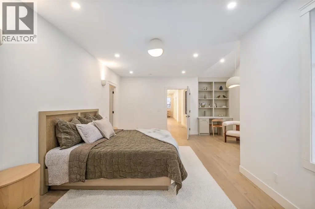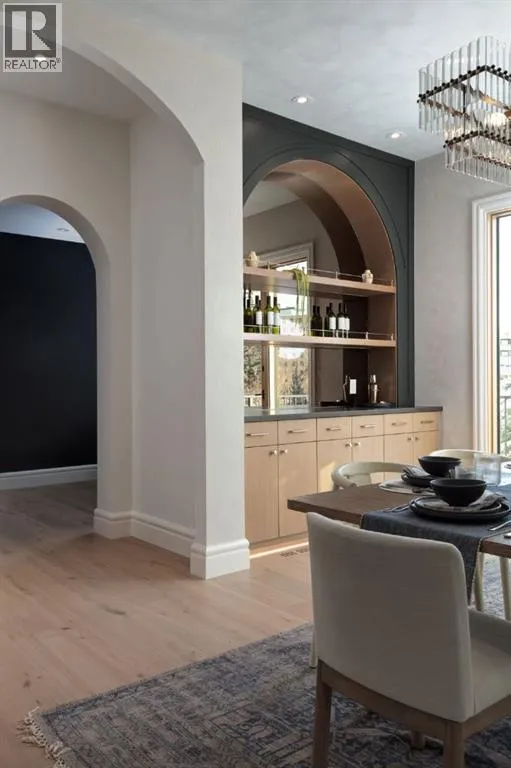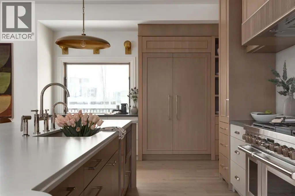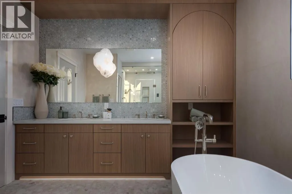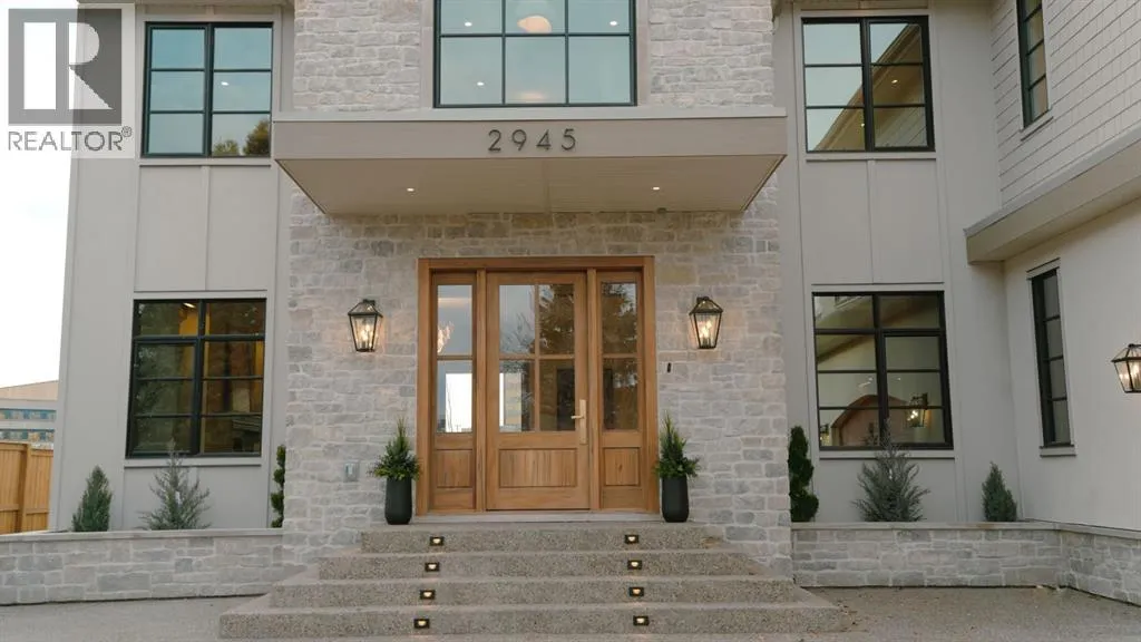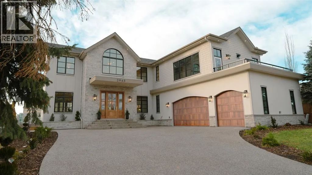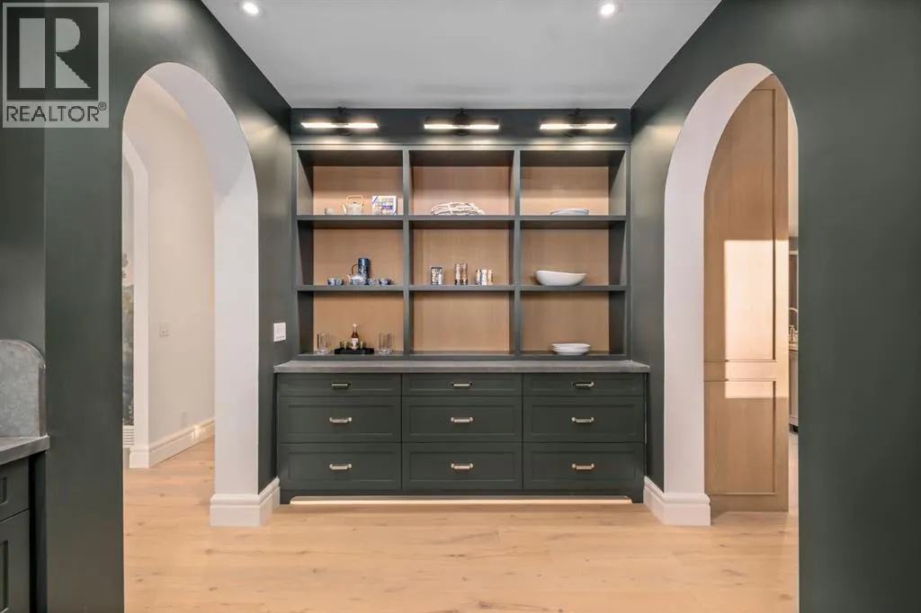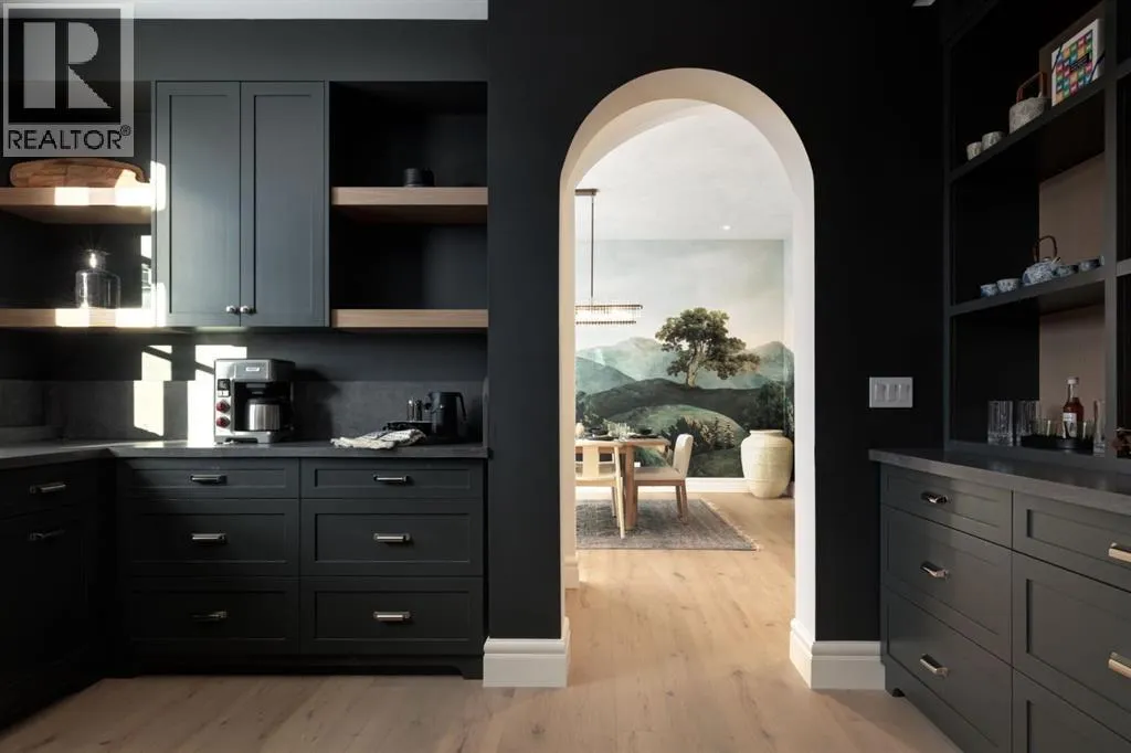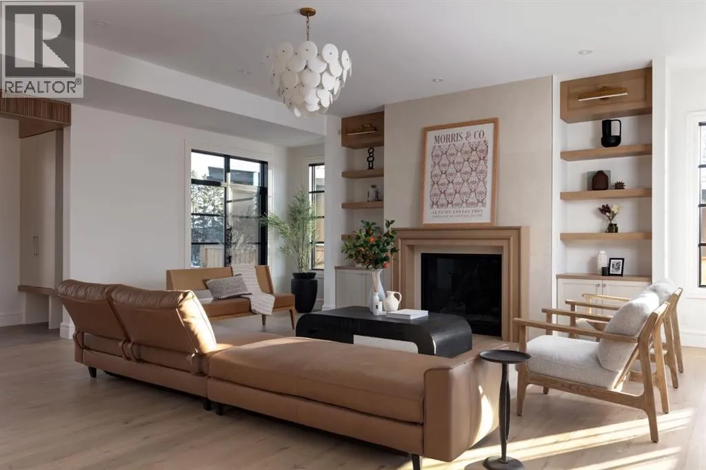 balcony, attached triple garage, 5 bedrooms, 5.5 bathrooms, 4 gas fireplaces, bonus room with balcony, butler’s pantry, dedicated office, home gym, Sub-Zero/Wolf appliance package, designer lighting, and so much more. Enter through the grand foyer and be welcomed by soaring 10’ ceilings and expansive sight-lines. To the side, the inviting living room showcases beautiful built-ins and an oversized gas fireplace. LUX accordion doors open seamlessly to the massive covered balcony—complete with an outdoor fireplace—creating an exceptional indoor/outdoor living experience. The stunning kitchen features custom oak cabinetry, exquisite quartz surfaces, a 48” Wolf gas range, Sub-Zero refrigerator, and a spacious butler’s pantry with sink, dishwasher, and convenient shelving. The formal dining room is wrapped in bespoke wallpaper that extends to the limewash ceiling and includes a stunning bar area with direct access to the balcony. A private office, stylish powder room, and a well-appointed mudroom with built-in lockers complete the main floor. The luxurious primary suite features a beautiful arched window offering a glimpse of the downtown Calgary skyline. The spa-inspired 5-piece ensuite includes a freestanding reeded tub, large walk-in steam shower, marble backsplash & dual vanity. Also a spacious walk-in closet outfitted with custom built cabinetry rounds out the suite. The builder has left the primary room as a blank canvas and will work with the new homeowners to create a custom oasis. Three additional bedrooms (two with ensuites), a full main bath, and a laundry room with two sets of washers and dryers offer convenience and comfort. A spectacular bonus room crowns the upper level with 12’ ceilings, a gas fireplace, private balcony, built-in bar, and a dedicated homework station. The basement level is bright and open thanks to the large windows due to the walkout design, the lower level features a spacious rec room with gas fireplace, full bar, gym, 5th bedroom, and a serene 4-piece bath. Outside you will find the extraordinary 80’ wide backyard providing exceptional usable space, complete with a ground-level, covered patio and endless opportunities for outdoor enjoyment. This home must be seen in person to truly appreciate the craftsmanship, thoughtful design, and rare combination of luxury and location. (id:64429)