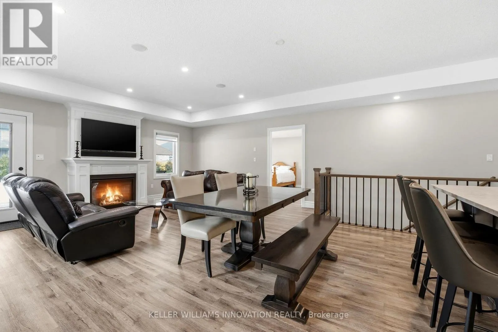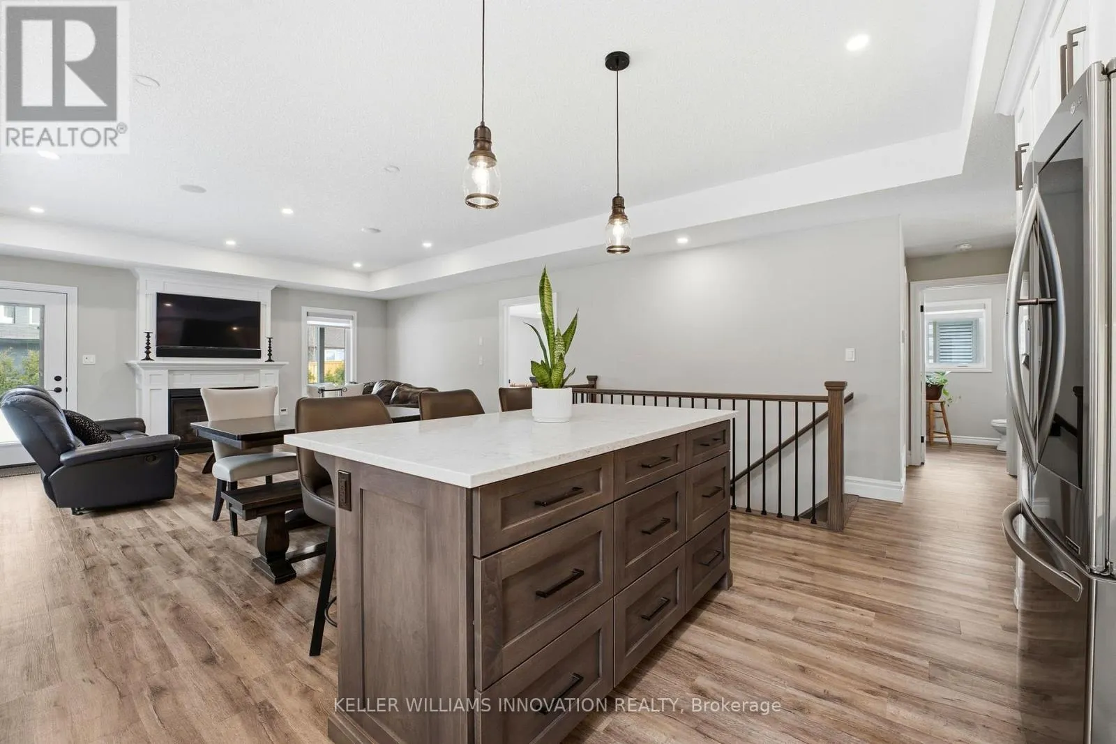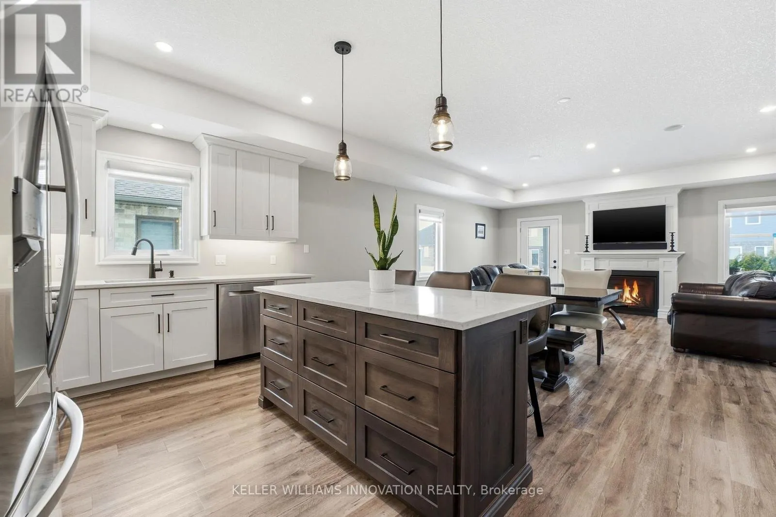 ACCESSIBLE RAMP, ROLL-IN SHOWER, ROLL-UNDER SINK. Enter through wide 36-inch doors into an open-concept living space where the kitchen, dining, and living areas flow effortlessly. The kitchen offers quartz countertops and abundant cabinetry and the living room has a gas fireplace. Main floor laundry makes daily routines simple, and a wheelchair ramp from the oversized garage ensures easy access. The