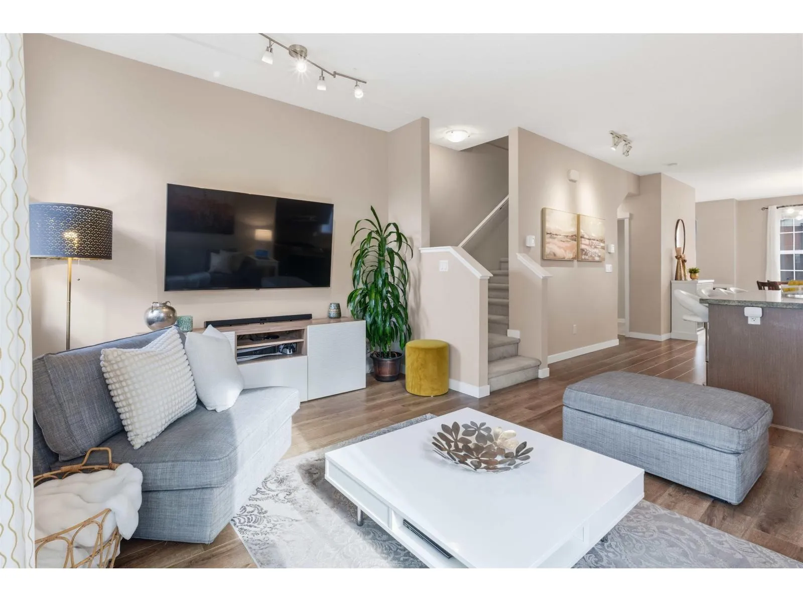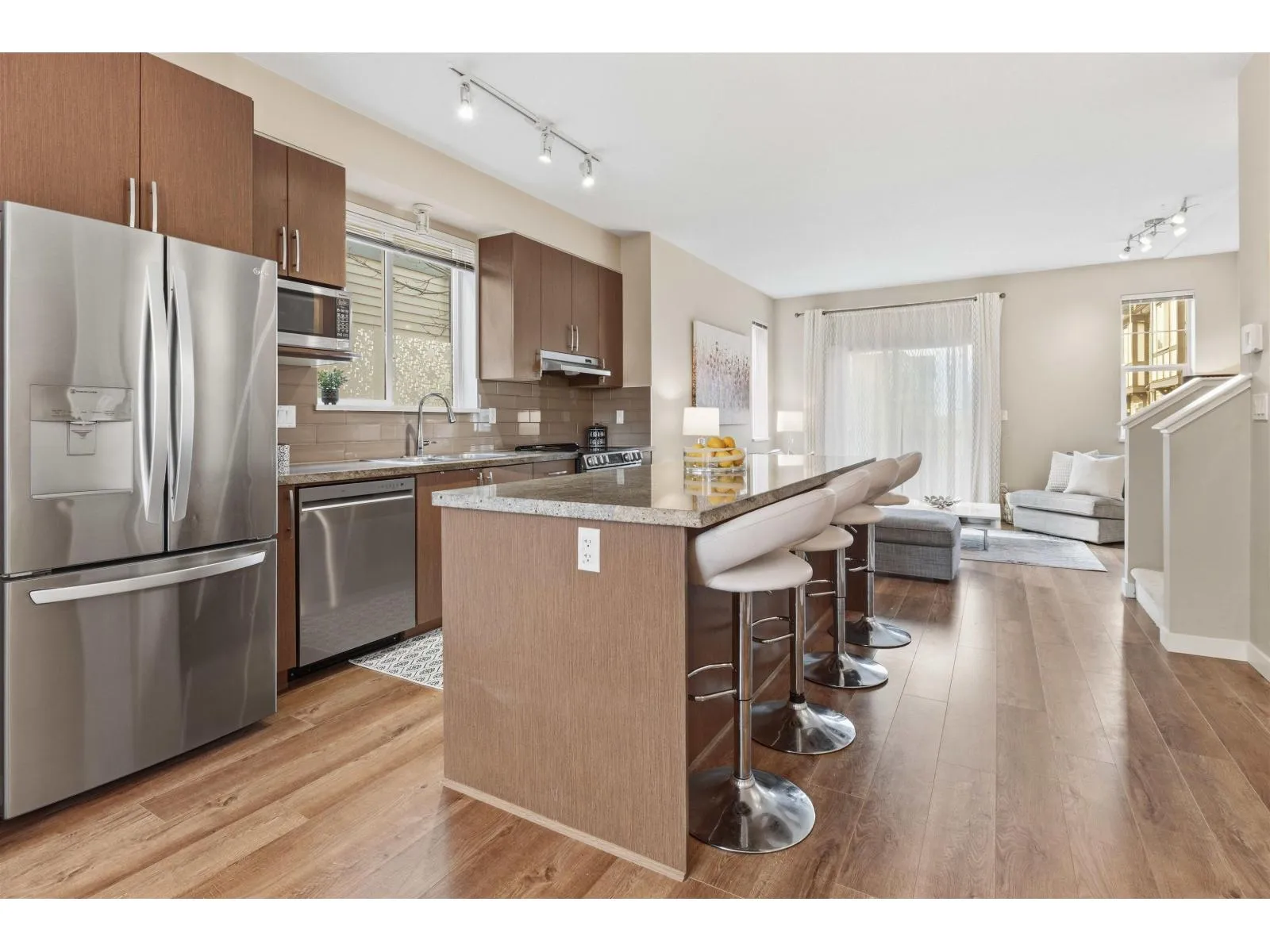 CORNER END UNIT at Radiance at Sunstone by Polygon. Lots of natural light and extra windows. Bright open floor plan with brand-new stainless steel appliances and granite counters. Main level offers generous space and natural light, can fit a 6 to 8 seater dining table, a small office space and a well lit living space that opens up to large