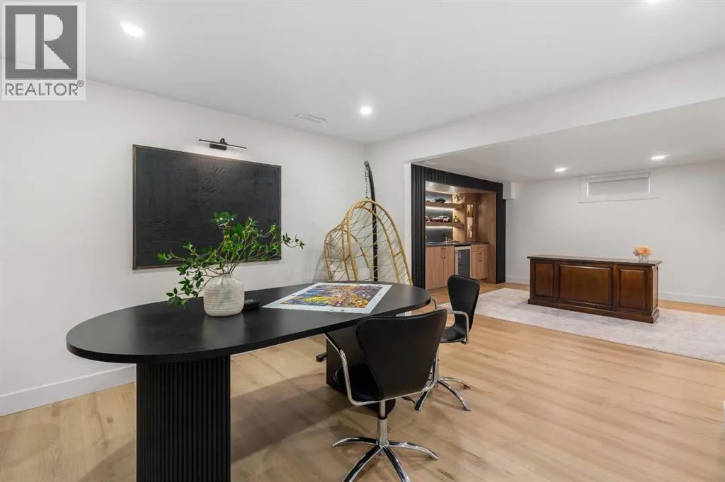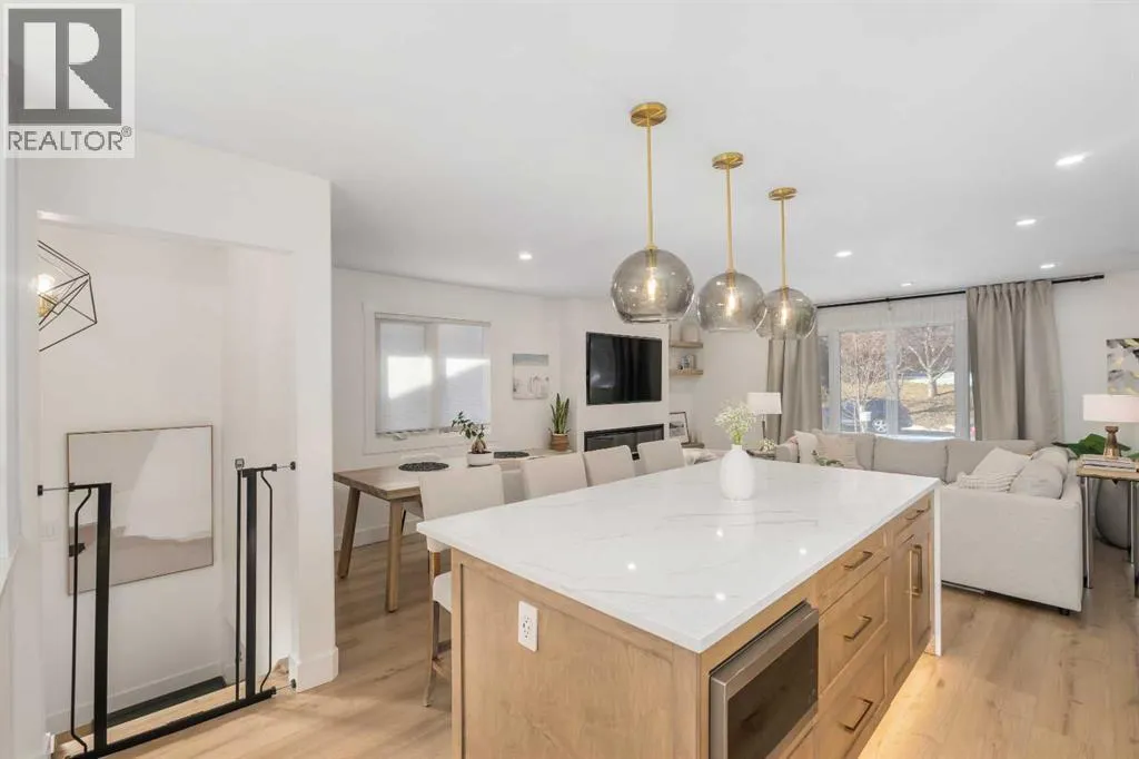 you with an open and airy layout that seamlessly connects the kitchen, dining area, and living room. At the heart of the home is a beautifully designed kitchen featuring a large centre island—intentionally uninterrupted by sinks or cooktops—allowing the premium quartz surface to shine as both a functional workspace and gathering place. Natural wood grain cabinetry on the island adds warmth and contrast to the elegant off-white upper cabinets. A farmhouse sink provides both style and practicality for handling larger pots and pans, while the window above offers a peaceful view of the spacious backyard. Ample cabinetry ensures plenty of storage, with room to expand if desired. The dining area comfortably accommodates gatherings of eight and flows effortlessly into the living room, where a sleek electric fireplace creates a welcoming focal point. Above the fireplace, a perfectly framed niche offers space for artwork or a mounted television, complemented by wood shelving with integrated lighting. The living room provides a backdrop of large windows that fill the space with natural light. The main level has three bedrooms, including a primary retreat with a convenient 2-piece ensuite and walk-in closet, along with two additional bedrooms located near the stylish 4-piece bathroom. The fully developed basement expands the living space with a large family room and an impressive games and entertainment area complete with a modern wet bar that could rival any downtown lounge. A generous fourth bedroom comfortably fits a king-sized bed with nightstands, and a contemporary 3-piece ba throom completes this level. Outside, the large backyard offers mature trees and a welcoming outdoor space featuring a concrete patio and Rundle rock firepit area—perfect for relaxing evenings or entertaining. Additional features include Central A/C, and an extra-wide double detached garage adds convenience and functionality. Situated in the established community of Canyon Meadows, this home offers excellent access to nearby schools including Canyon Meadows Elementary, St. Catherine Elementary, Robert Warren School, and Dr. E.P. Scarlett High School. Residents enjoy exceptional amenities such as Fish Creek Provincial Park, Canyon Meadows Golf & Country Club, the Canyon Meadows Aquatic & Fitness Centre, Trico Centre for Family Wellness, Southcentre Mall, and Willow Park Village. Commuting is effortless with convenient access to Macleod Trail, Anderson Road, and Stoney Trail, along with a short walk to the Canyon Meadows LRT Station. (id:62650)