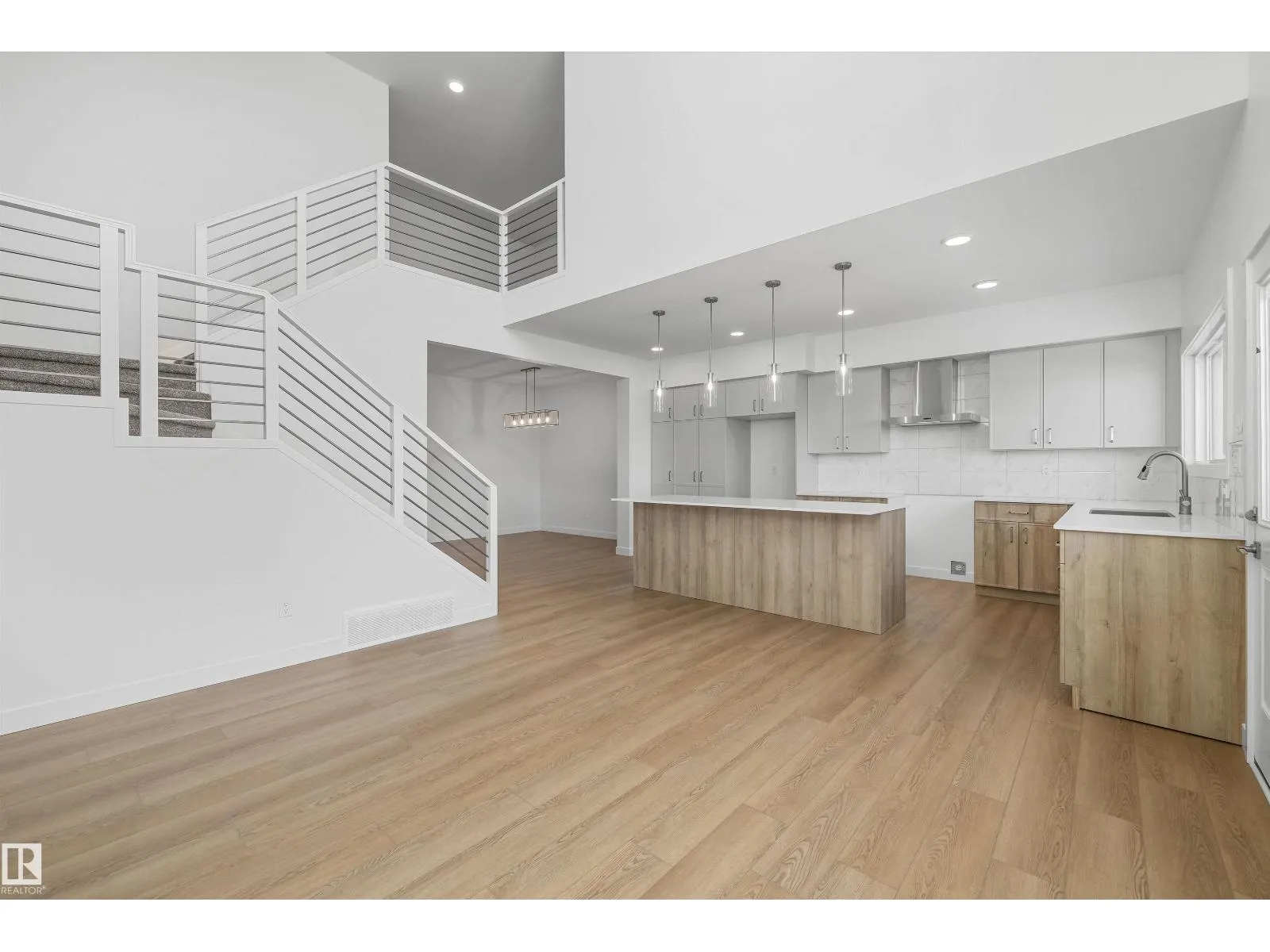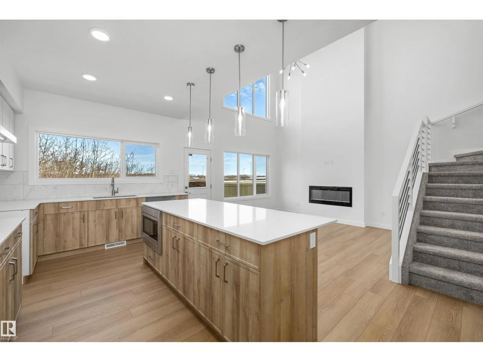 Built by Sterling Homes, this front-attached home in North Edmonton offers bright, modern living in a quiet, nature-focused community. Triple pane windows and 9’ ceilings create an open feel on the main floor. A welcoming foyer leads to a flexible den and half bath, with a mudroom connecting to the kitchen. The rear great room features an electric fireplace and