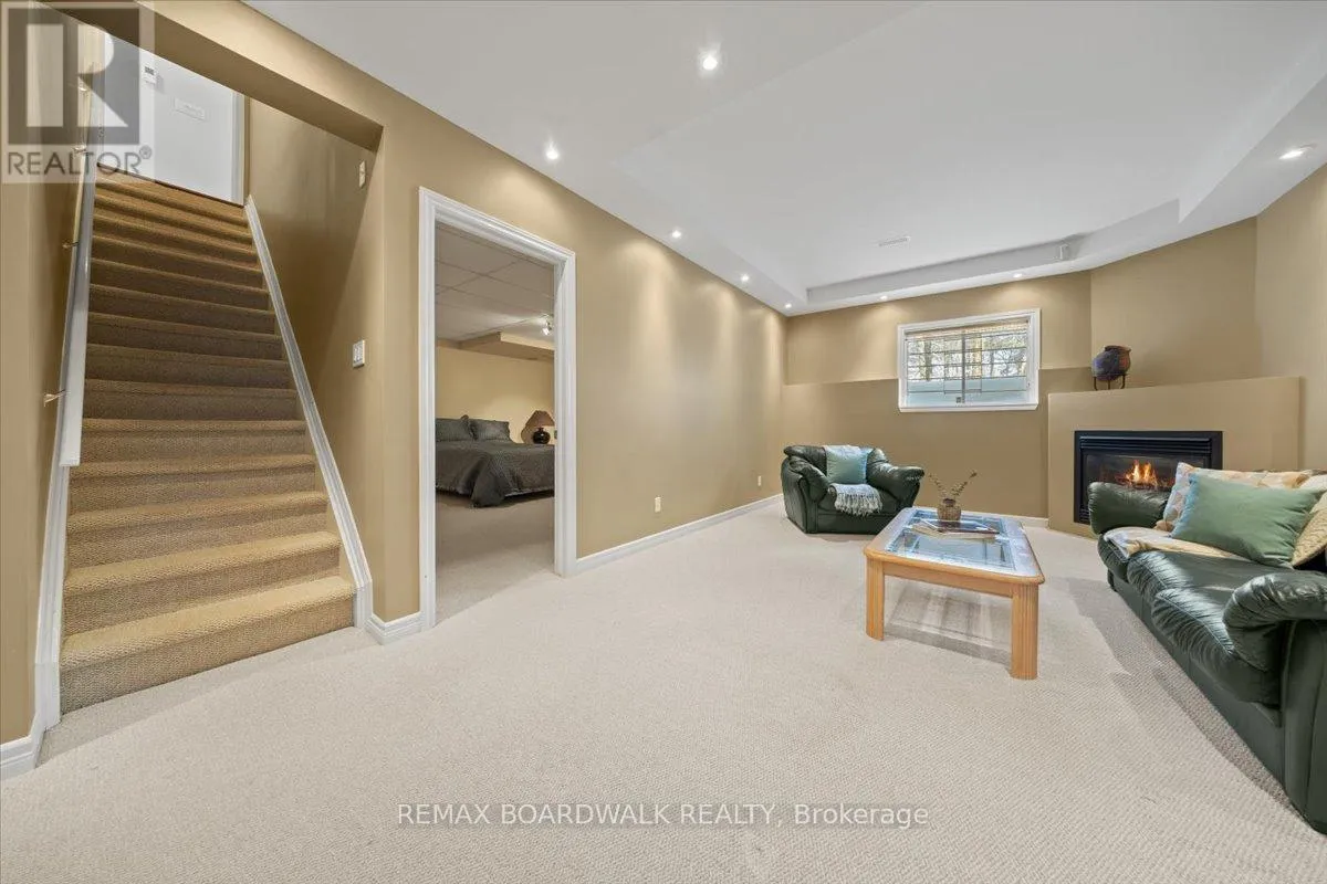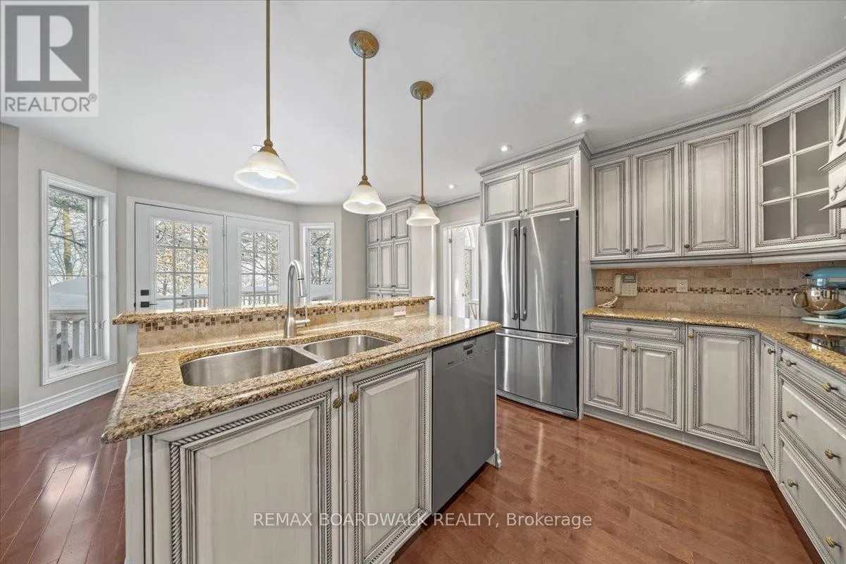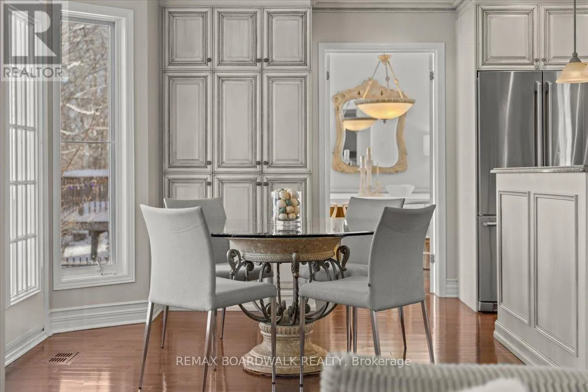 et on a quiet pie-shaped lot backing onto a mature ravine, this refined four-plus-one-bedroom residence offers a composed architectural presence defined by balanced rooflines, curved transom glazing, twin garage doors, & a timeless brick façade approached by an interlock walkway & covered entry. A modern front door framed by vertical transom glass introduces an interior shaped by proportion, light, &