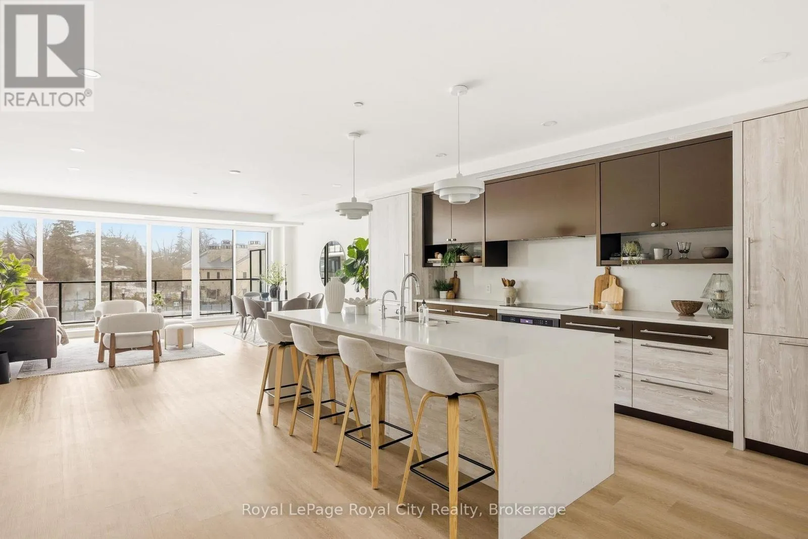 Welcome to an exceptional 2-bedroom, 2.5-bath observatory suite at the coveted Elora Mill Residences, offering sophisticated living in the heart of Elora. Spanning 1,711 sq. ft., this thoughtfully designed suite features two private balconies totalling 387 sq. ft. at opposite ends. Floor-to-ceiling windows and sliding glass doors fill the home with natural light, creating an airy, inviting atmosphere.A welcoming hallway