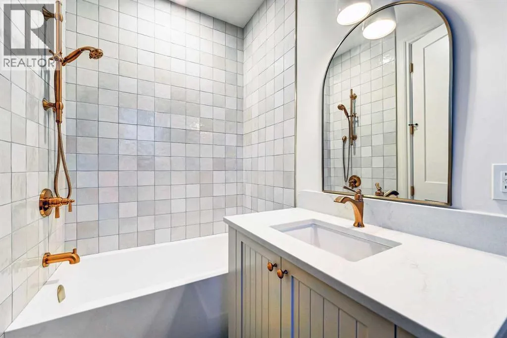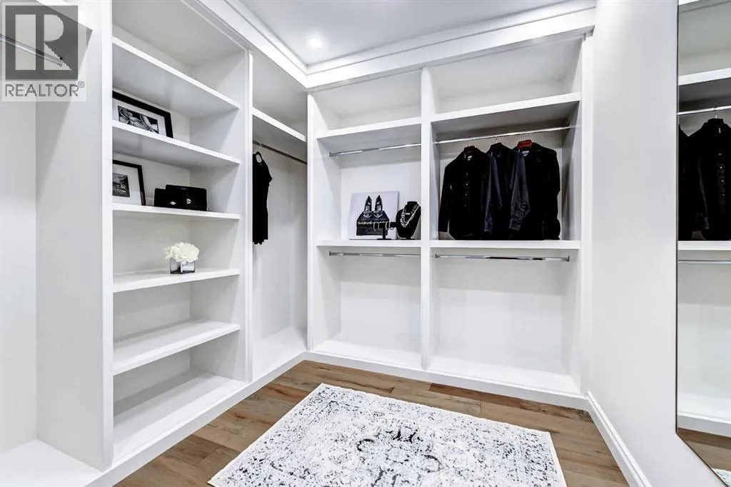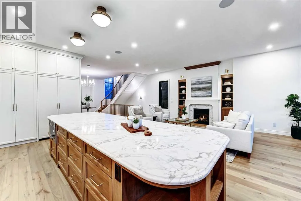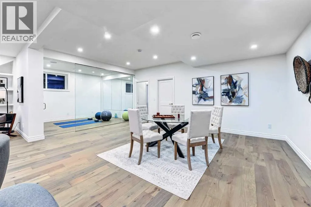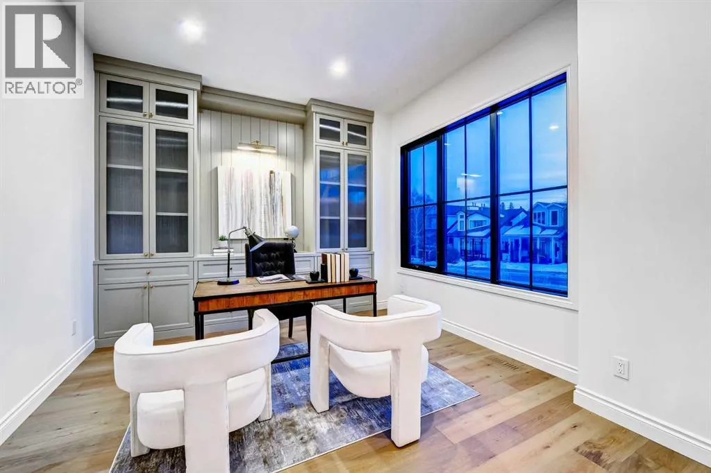 of stone, stucco, and Hardie panel, accented by an aluminum cedar soffit entry, statement front door, and custom aluminum Lux windows with black interior cladding. The fully landscaped and fenced backyard is designed for low-maintenance enjoyment and features a generous composite patio with aluminum and glass railing, creating a private outdoor retreat. Inside, wide plank white oak engineered hardwood flooring flows throughout all levels, complemented by solid core doors and custom site-built cabinetry with wood dovetail drawers. Soaring 10-foot ceilings on the main floor and 9-foot ceilings on both the upper and lower levels enhance the home’s bright and open feel. The main living area is anchored by a cozy gas fireplace and transitions seamlessly into the chef-inspired kitchen featuring a premium JennAir appliance package, including a 48-inch gas range, 48-inch panelled refrigerator, panelled dishwasher, and a microwave drawer integrated into the island with additional storage on both sides. A curved quartz slab island, custom cabinetry, and a bespoke hood fan create a stunning focal point, while the adjacent butler’s pantry adds extended storage and elevated lighting. The dining space is highlighted by a custom oak sideboard, and a spacious mudroom with tailored millwork ensures everyday functionality. A private front office is thoughtfully designed with French doors, floor plugs, and custom glass-front cabinetry. Upstairs, three generously sized bedrooms each feature walk-in closets and private ensuites with heated tile flooring. The primary retreat is highlighted by vaulted c eilings and a spa-inspired ensuite complete with an oversized steam shower with dual rain heads, a freestanding tub, solid slab stone backsplash, and custom hanging mirrors. A beautifully finished upper-level laundry room with sink, hanging rod, and custom cabinetry completes the floor. The fully finished basement expands the living space with a gym, TV and games area, wet bar with beverage fridge, full bathroom, and ample storage. Mechanically, the home is equipped with dual-zone high-efficiency furnaces with humidifiers, along with rough-ins for in-floor basement heating, air conditioning, central vacuum, speakers, security system, and exterior cameras. Every detail of The Bardot reflects intentional design, superior craftsmanship, and timeless appeal, all just steps from Marda Loop’s vibrant shops, restaurants, parks, schools, and only minutes from downtown Calgary. (id:64429)